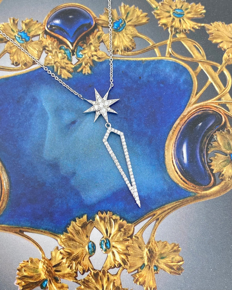 A fine quality Contemporary Diamond Star Pendant set entirely in 18ct White Gold. The pendant contains Pave Set Brilliant Cut Diamonds set in a unique and eye-catching star design. The dazzling Diamonds are bright and lively stones that sparkle beautifully, weighing a total of 0.20ct in Diamond weight and are of a fine colour and clarity (approximately 'G', 'VS/SI1'). The pendant is made entirely in 18ct White Gold, measures 36mm high x 11mm wide and has an articulated design allowing it to move freely when worn. The chain measures 16 inches and is also 18ct White Gold. This is a lovely design, unique and sure to catch the eye!