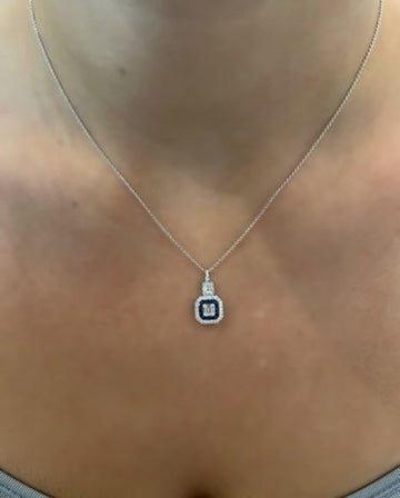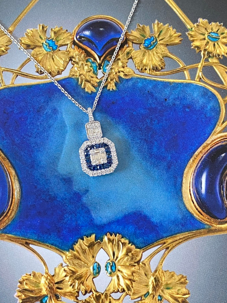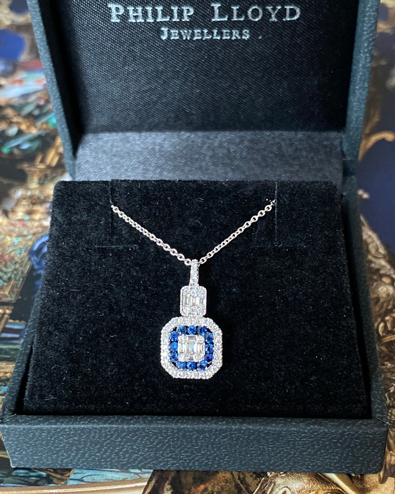 A simply stunning Art Deco Sapphire and Diamond Cluster Pendant, set in 18ct White Gold! The pendant contains a dazzling central cluster of Baguette and Round Brilliant Cut Diamonds, perfectly contrasted by the deep saturated blue colour of the surrounding Channel Set French Cut Sapphires, weighing 0.29ct in total. There is then further row of Brilliant Cut Diamonds surrounding the Sapphires, providing the ultimate contrast to these stunning stones. In addition to this, there is an additional cluster of Baguette Cut and Brilliant Cut Diamonds set above, perfectly tying the pendant together and adding to the overall brilliance of the design! The Diamonds are set in a fine claw setting and are a fantastic stones of a fine G colour and VS clarity with a total Diamond weight of 0.32ct. The chain is a curb chain, measuring 16.5 inches and is also made in 18ct White Gold. Elegant and eye catching, this is a beautiful quality pendant and would make a fantastic addition to any jewellery lovers collection!