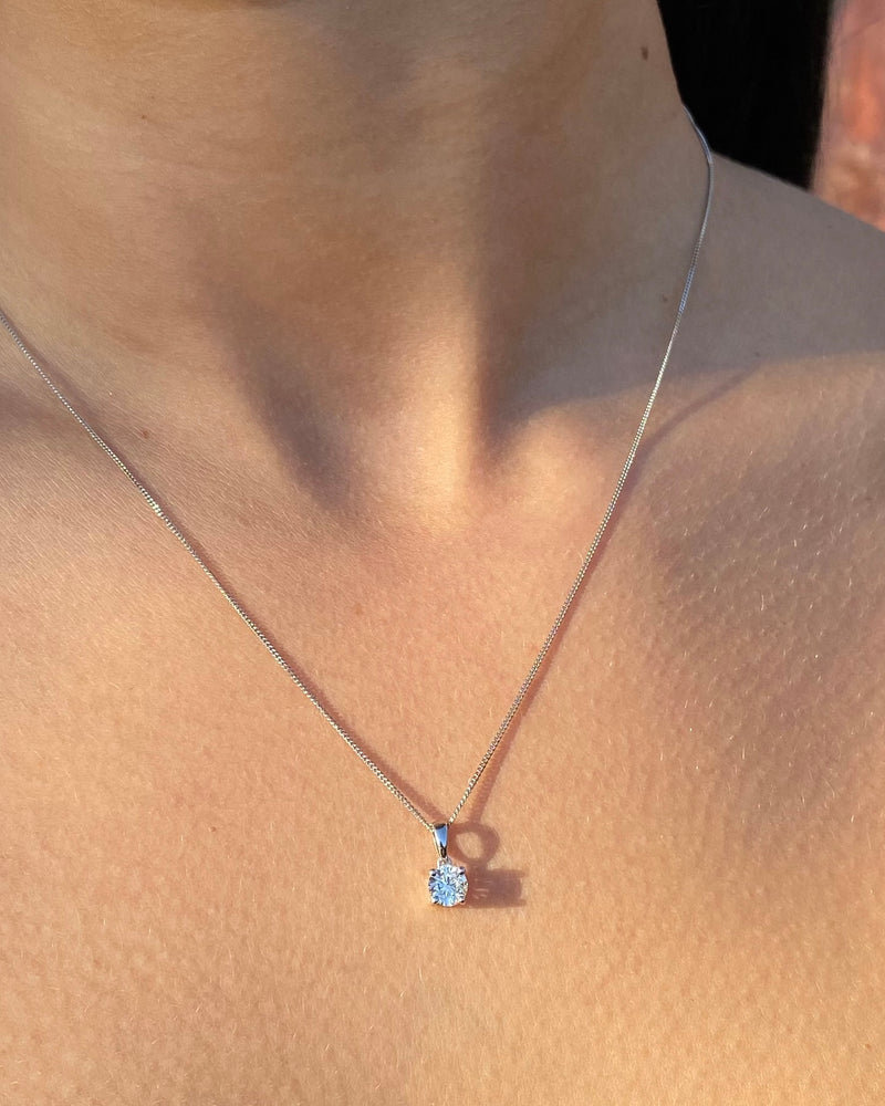 A lovely Diamond Solitaire Pendant set in 18ct White Gold. The Round Brilliant Cut Diamond is H colour, SI1 clarity and weighs 0.50ct. The sparkling Diamond is set in a Four Claw setting and has an 18ct White Gold Bale. The pendant measures 5mm round is made entirely in 18ct White Gold. The chain measures 16 inches and is 18ct White Gold. This is a lovely quality pendant suitable for suitable occasion or every day.