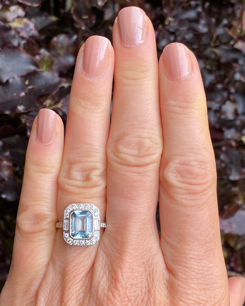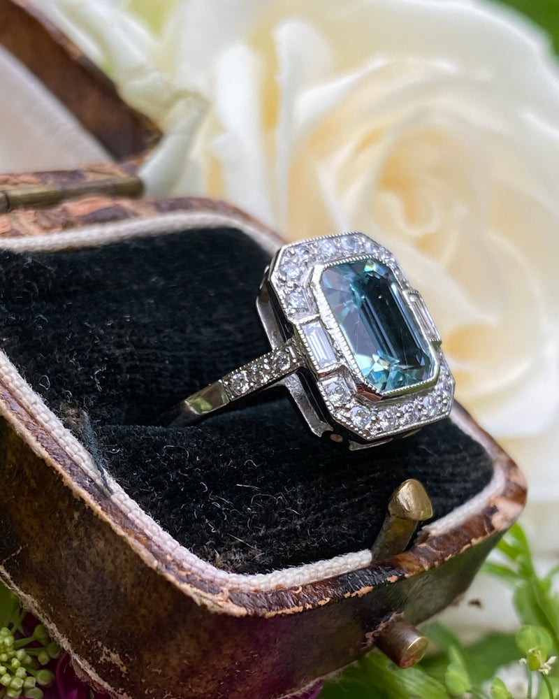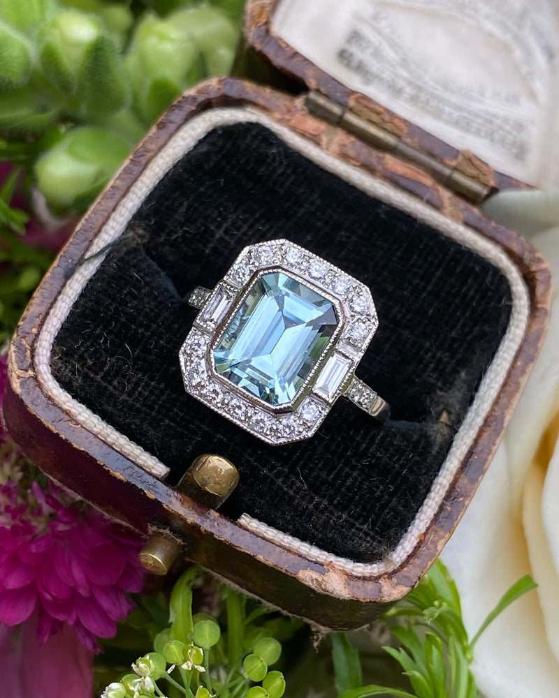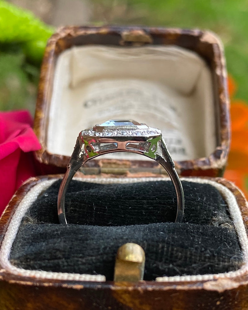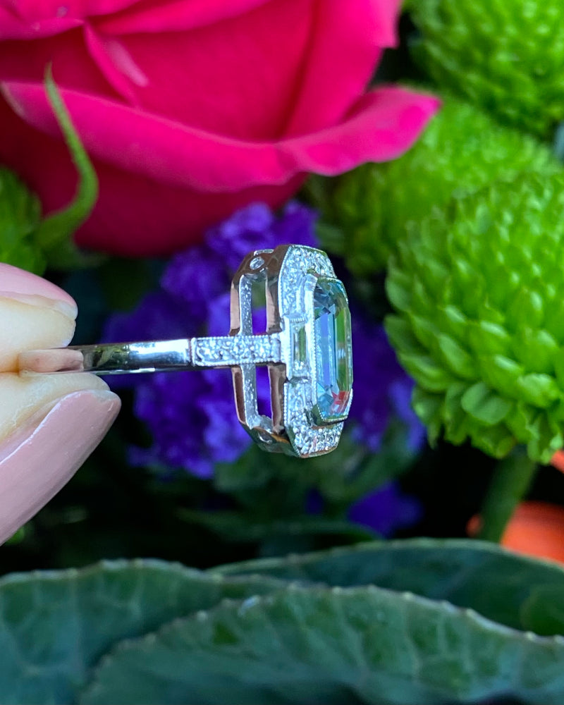 Art Deco Aquamarine and Diamond Platinum Ring 0.50ct + 2.20ct