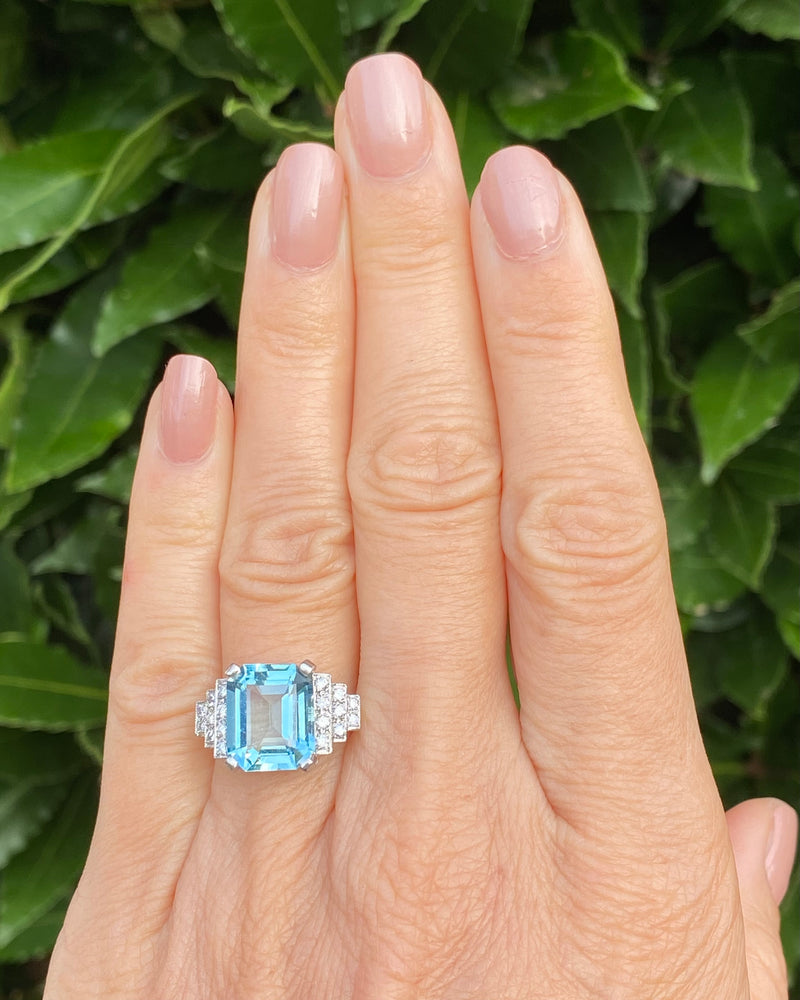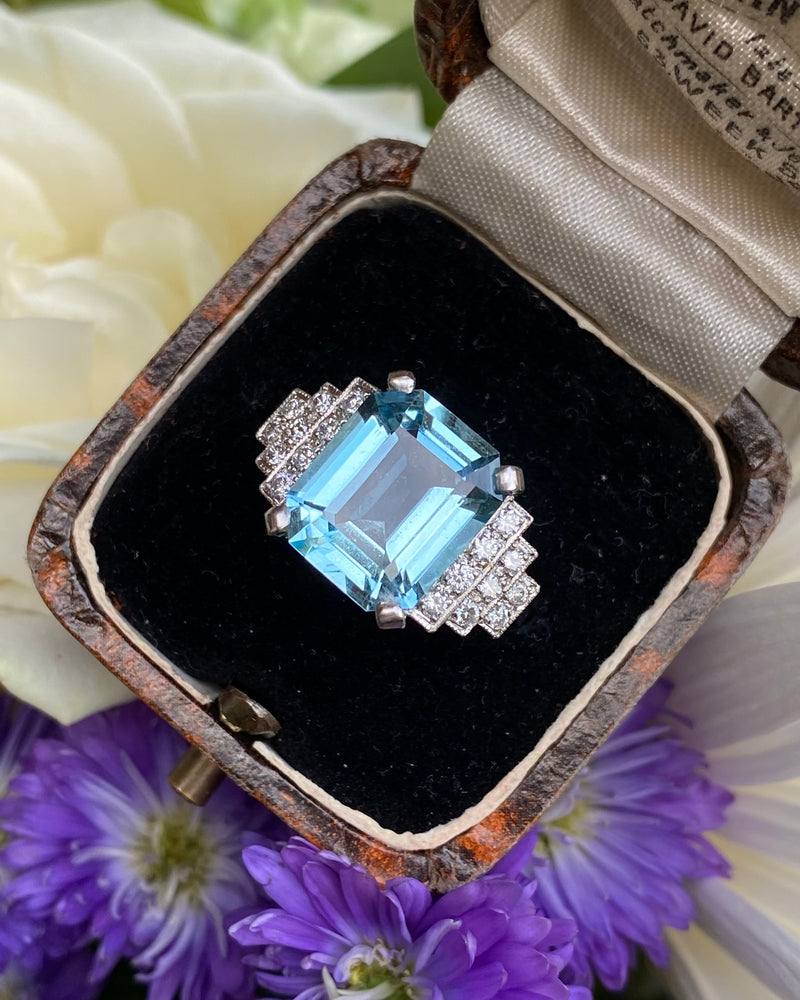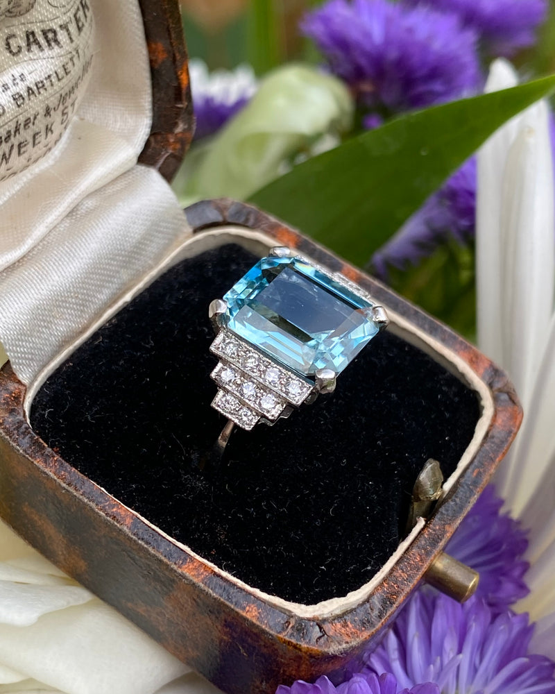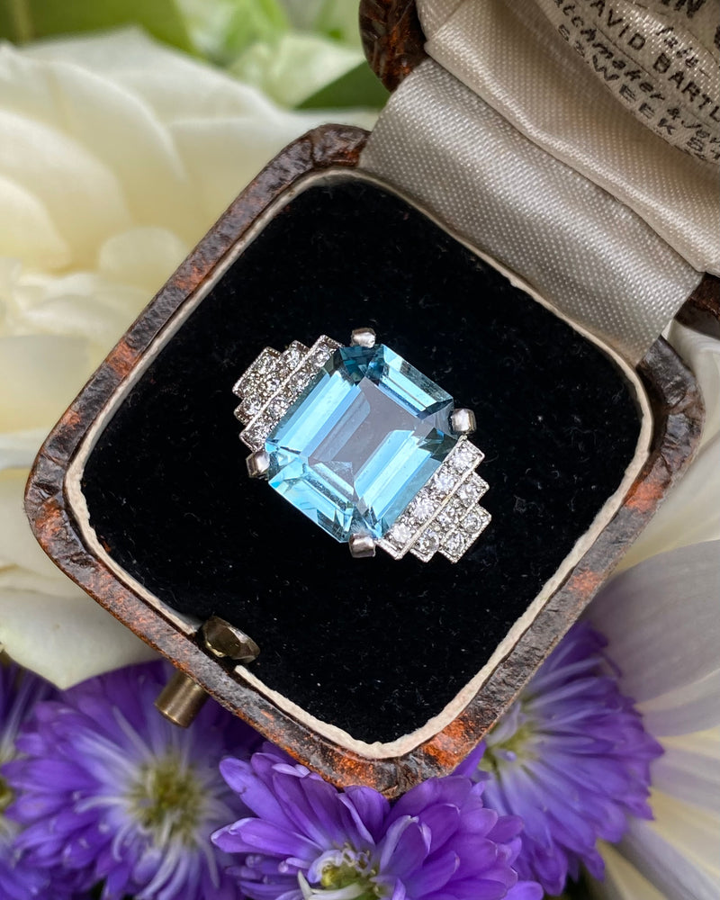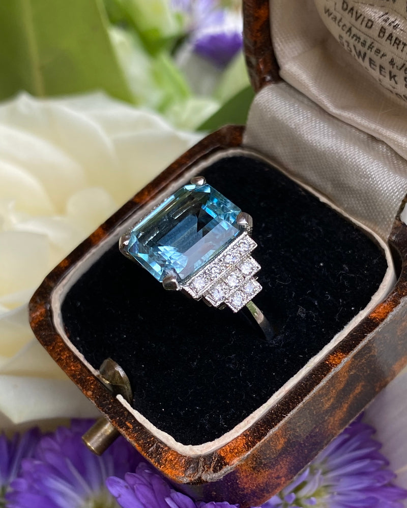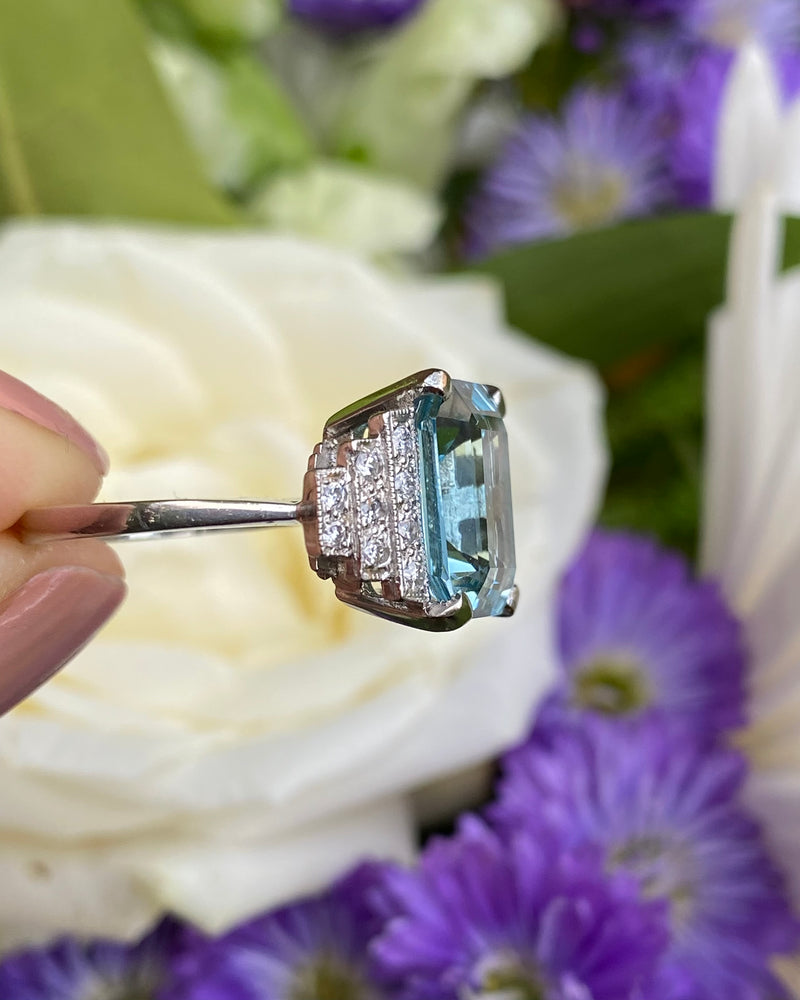 Art Deco Aquamarine and Diamond Platinum Ring 0.35ct + 4.35ct
