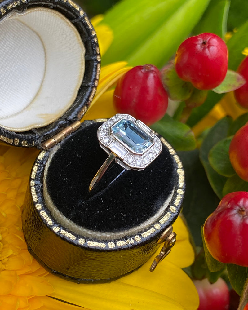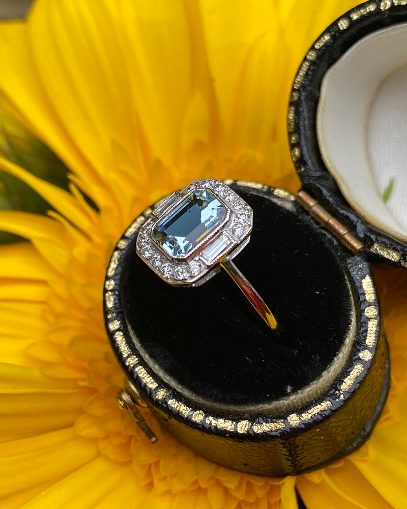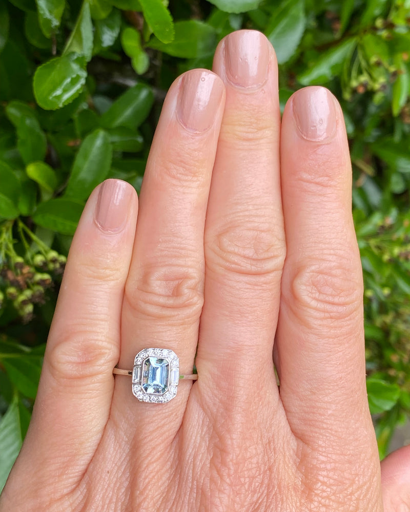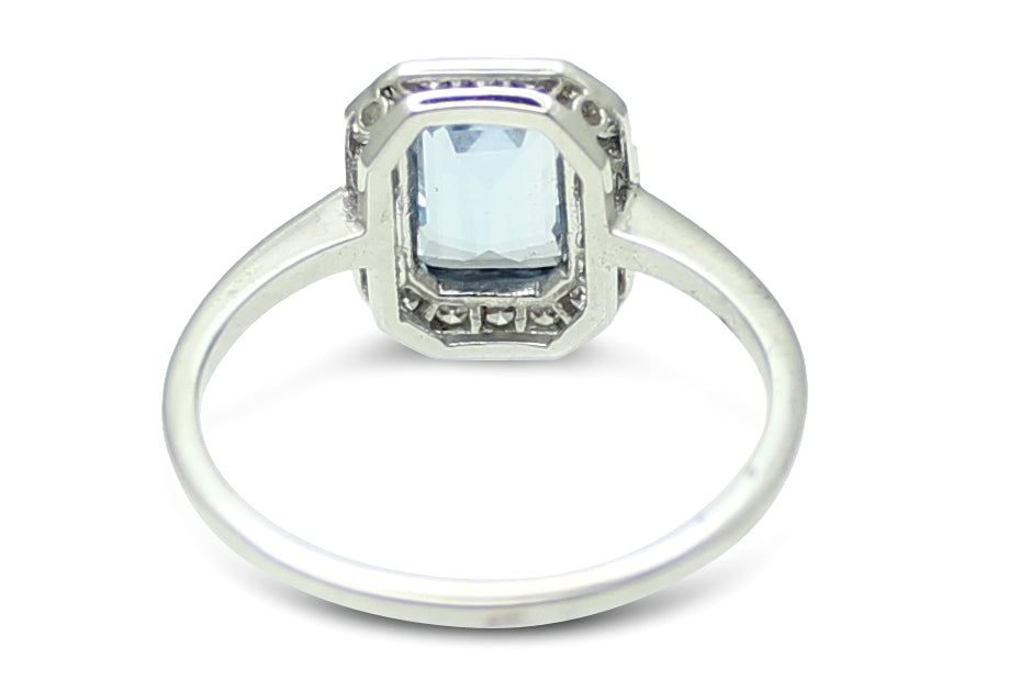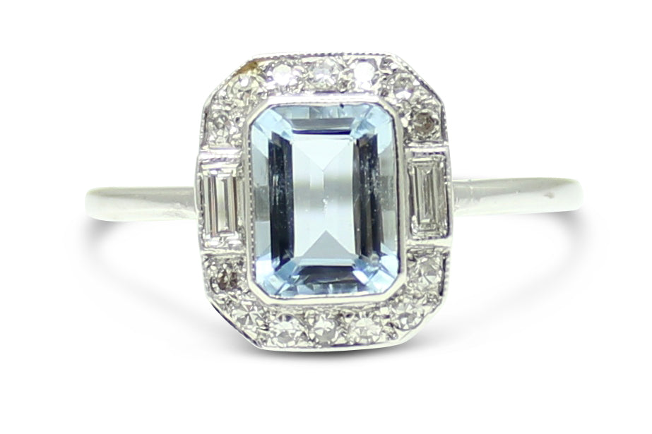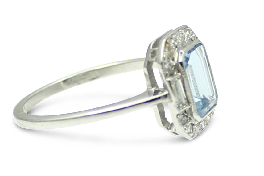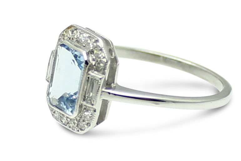 Art Deco Aquamarine and Diamond Ring Platinum 0.25ct + 0.90ct