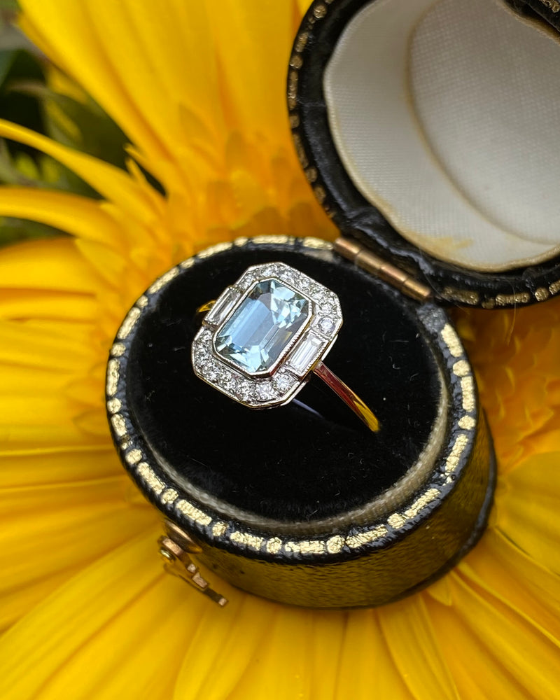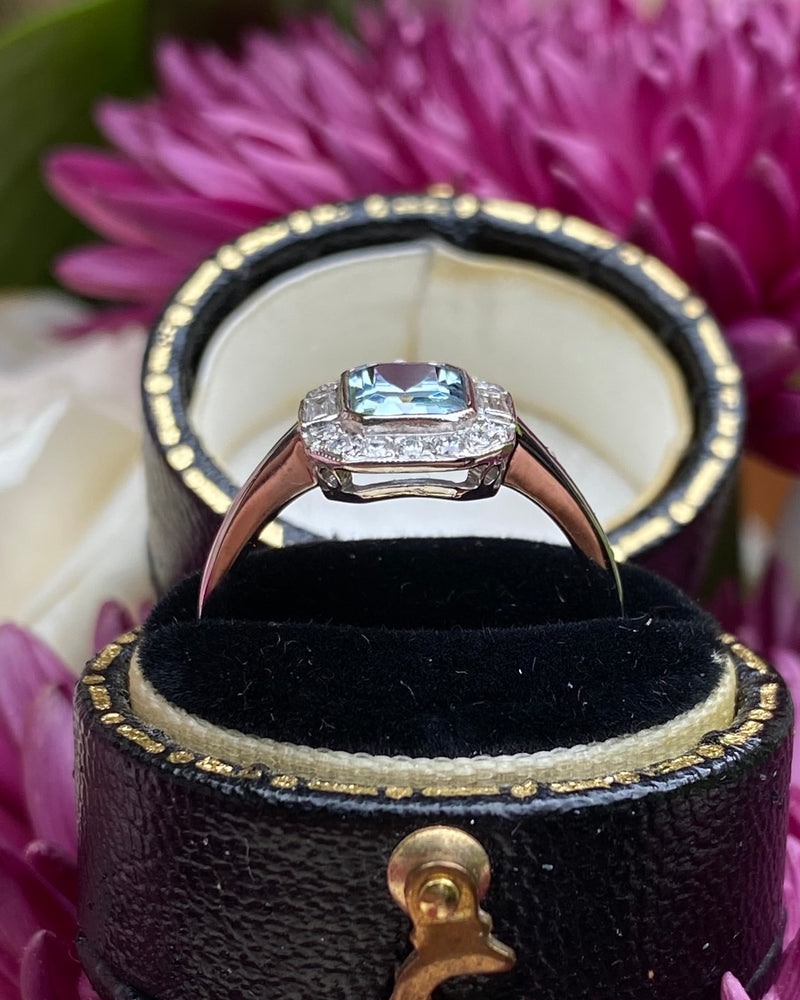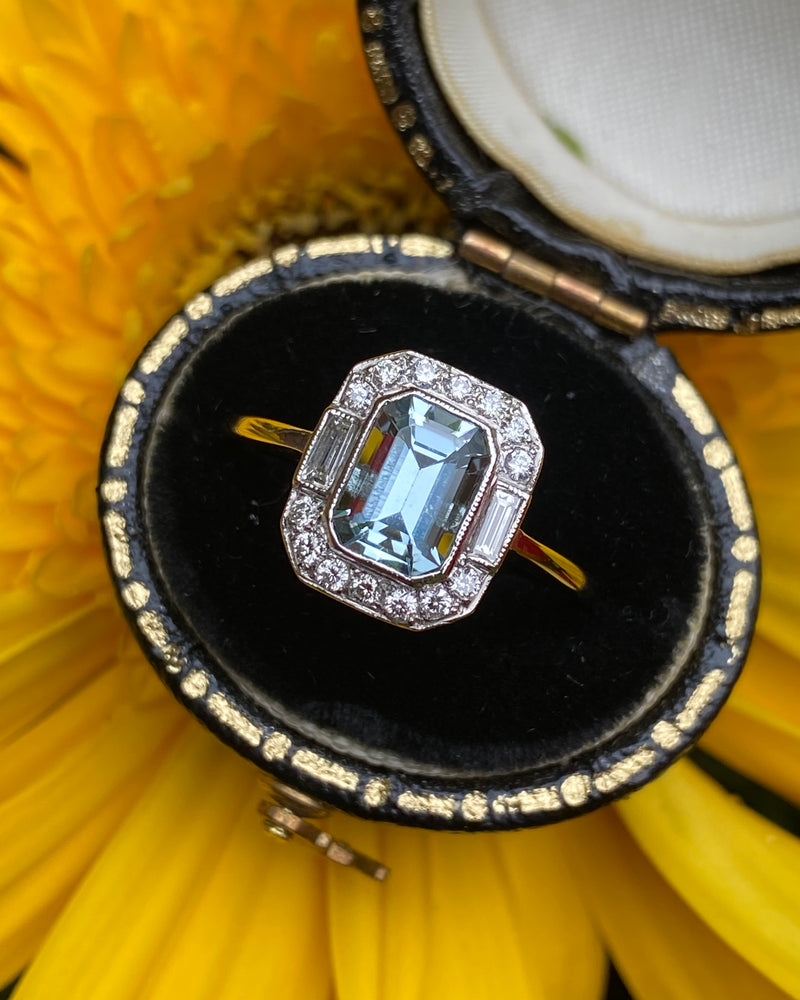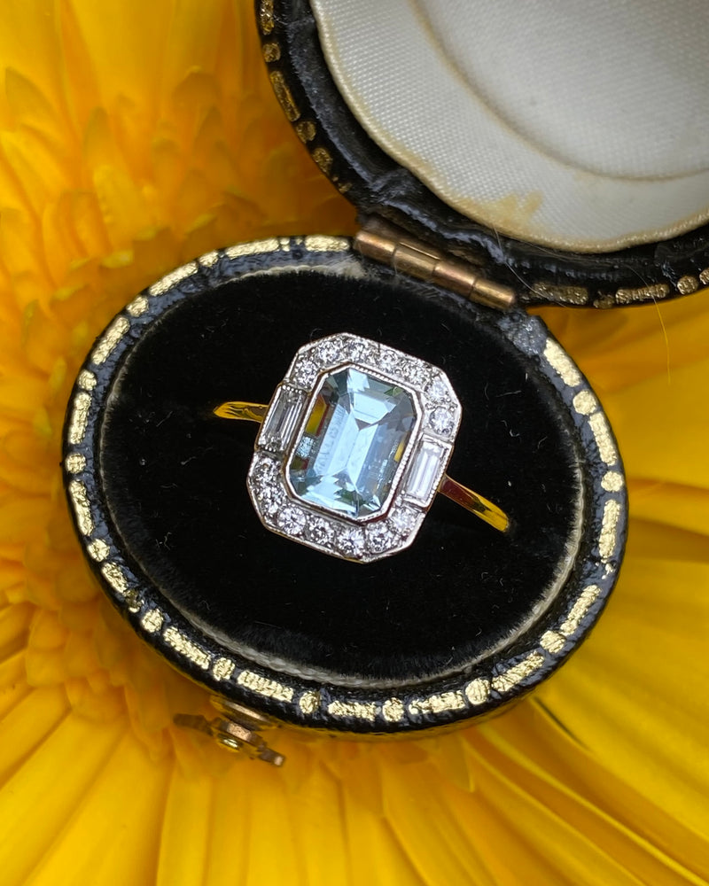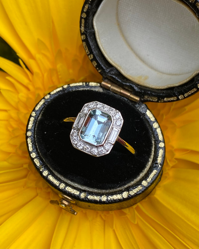Art Deco Aquamarine and Diamond Ring Platinum 0.25ct + 0.90ct