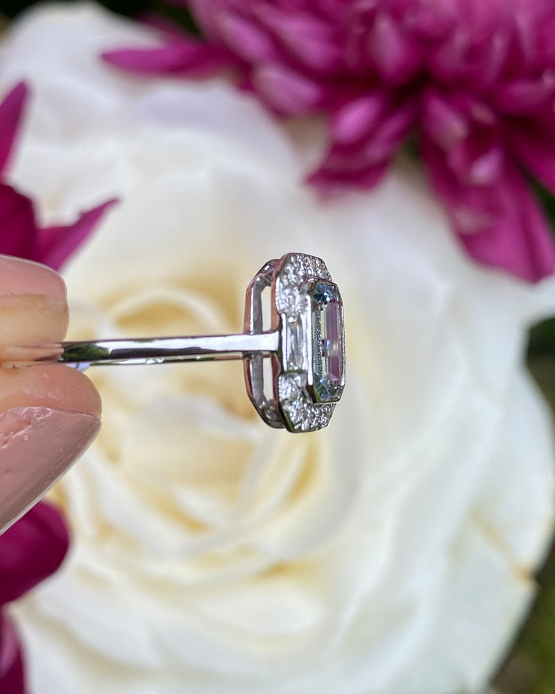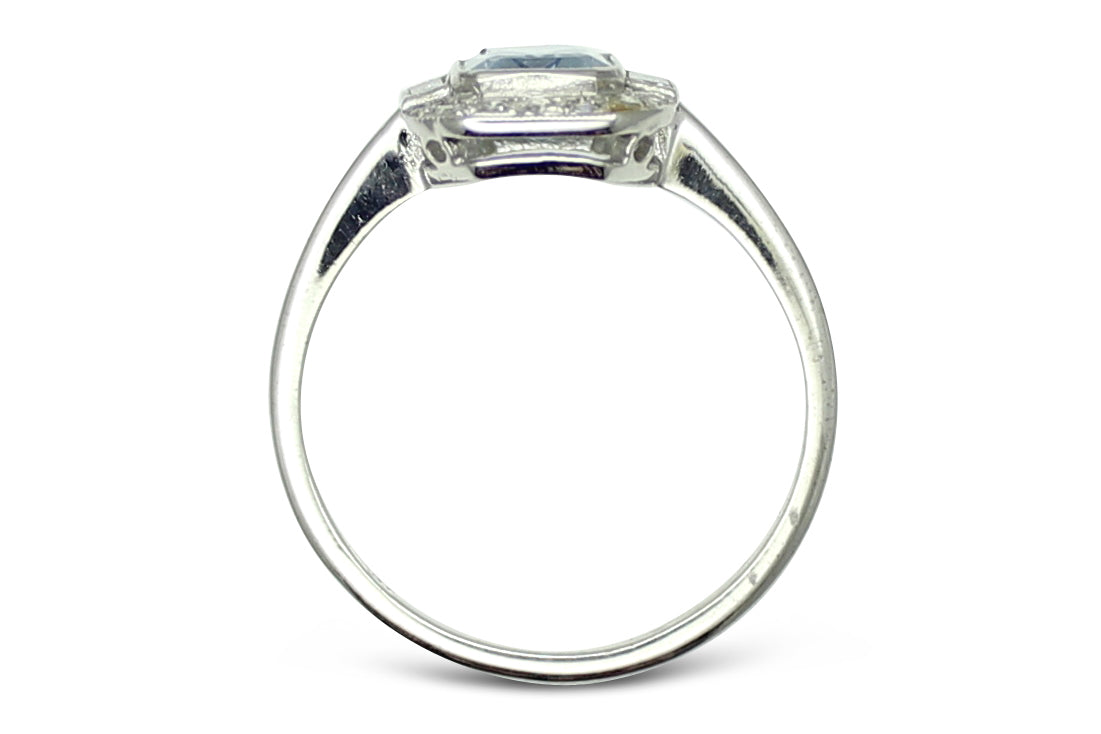 A beautiful Art Deco style Aquamarine and Diamond ring set entirely in Platinum. The fine quality refreshing cool blue Aquamarine is beautifully offset by glittering bright Diamonds of varying cuts. The Emerald Cut Aquamarine is a beautiful colour, excellent clarity and is set in a rub over setting with a fine milgrain edging. Surrounding the Aquamarine are Pave set Brilliant Cut Diamonds with a fine milgrain edge, also with single Baguette Cut Diamonds set either side of the central stone. The Diamonds are of a fine colour and clarity (approximately H/I colour and VS/SI clarity) and weigh 0.25ct in total. The Aquamarine measures 7mm x 5mm and weighs 0.90ct.