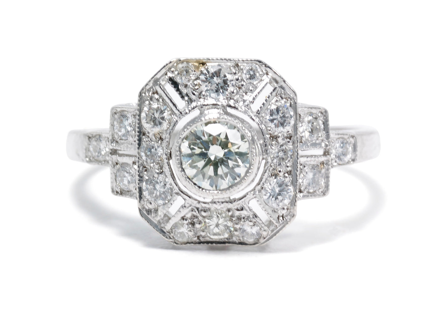 A classic and elegant Art Deco style Diamond Ring with a geometric style design, pave style setting and hand crafted workmanship. The ring features a gorgeous central Brilliant Cut Diamond which is surrounded by further Brilliant Cut Diamonds in a very pretty overall design. In addition, there are three dazzling Diamonds stepping down on the shoulders of the ring. The ring sits beautifully on the finger due to an arch shaped ring head and has an attractive under bezel. The Diamonds are of a fine 'H/I' colour and 'VS/SI' clarity and weigh 0.75ct in total. The ring is made entirely in Platinum, making everything about this ring simply fabulous - and great quality too!