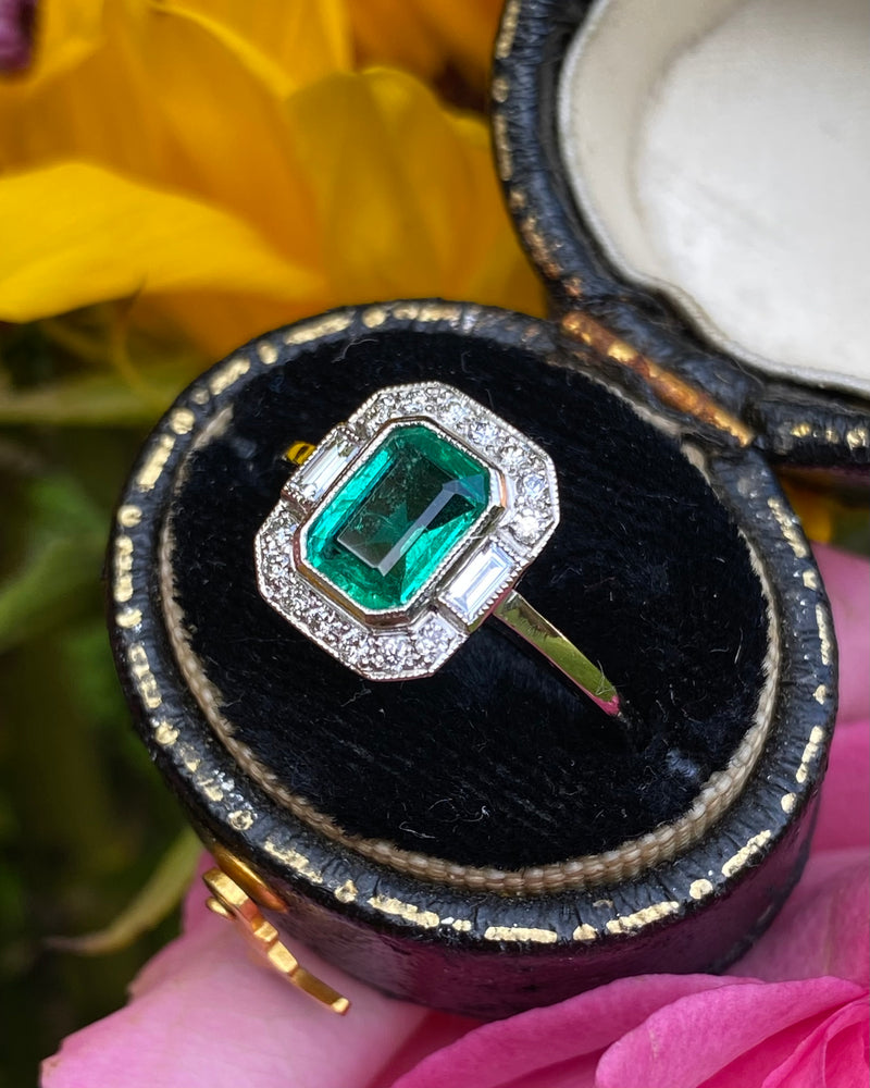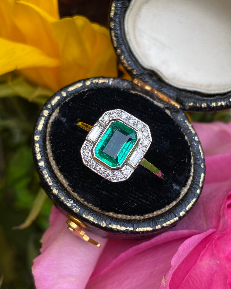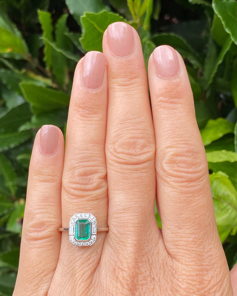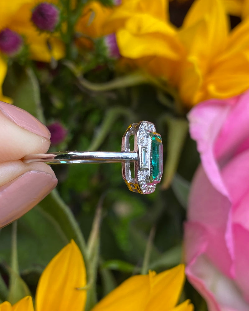 A pretty Art Deco style Emerald and Diamond Platinum ring. This ring consists of a lovely central Emerald Cut Emerald weighing 0.90ct and measuring 7mm x 5mm. The Emerald is a verdant grassy green colour and is rub over set. In addition to this is a single Baguette Cut Diamond rub over set either side with a surround of Pave set Brilliant Cut Diamonds, coming to a total Diamond weight of 0.25ct in the ring. The Diamonds sparkle beautifully and are H/I colour and VS/SI clarity. The rub over setting is finished with a fine milgrain edging. This is such a pretty ring!