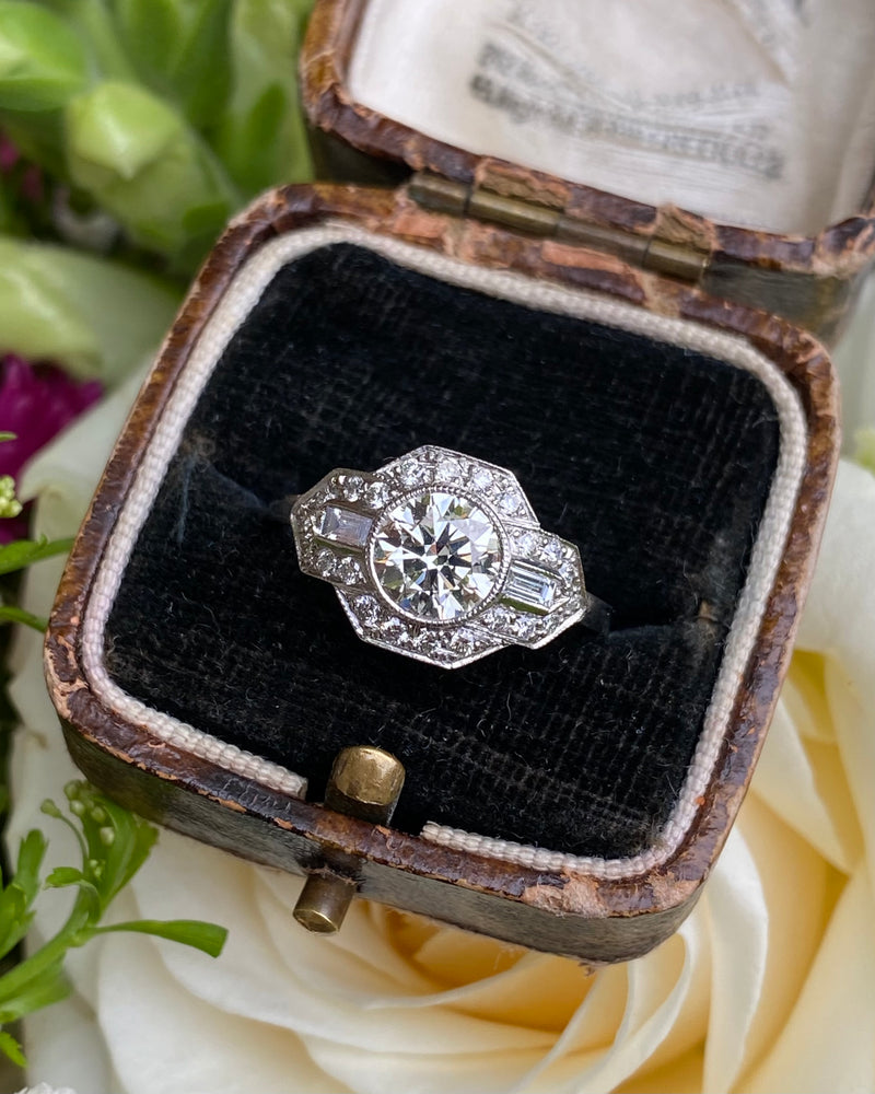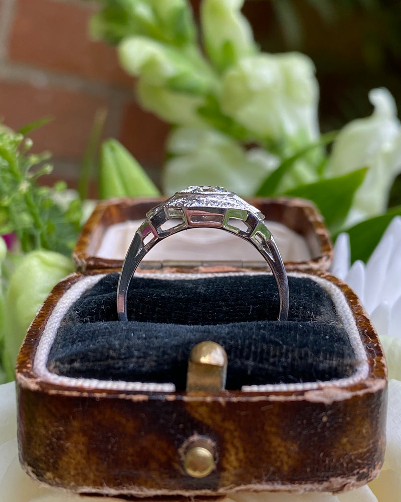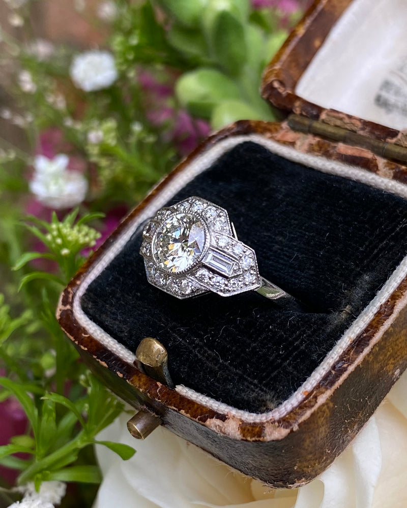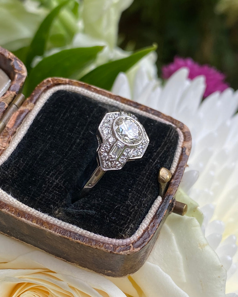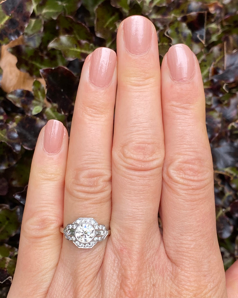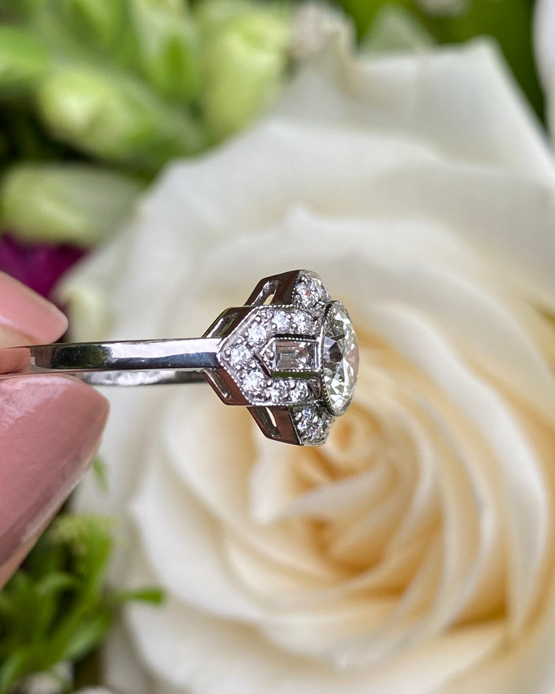 Love this ring! It's the best of all worlds; the Art Deco styling, the large solitaire Diamond centre and the geometrical balance of stone cuts and shape - It really is stunning. The central Round Brilliant Cut Diamond is a gorgeous stone and is set in a rub over setting, finished with a fine milgrain edging. This stunning Diamond weighs 0.95ct and is approximately J colour and SI1 clarity, surrounded by 0.45ct of Pave set Brilliant Cut Diamonds. There are also two Baguette Cut Diamonds either side of the central Diamond. The shape of the ring is really elegant and fits really well on the finger. The surrounding Round Brilliant Cut Diamonds are I colour, VS/SI clarity and the total Diamond weight in the ring is approximately 1.40ct. The ring sits nice and low on the finger and is easy and comfortable to wear.