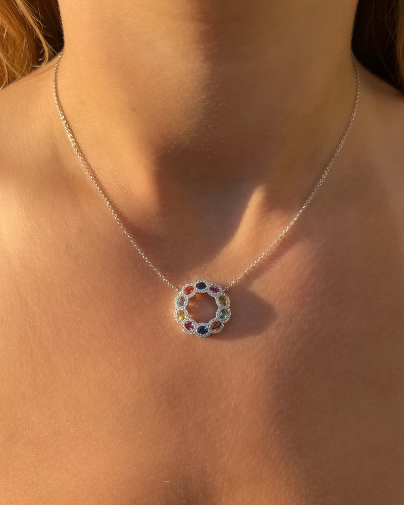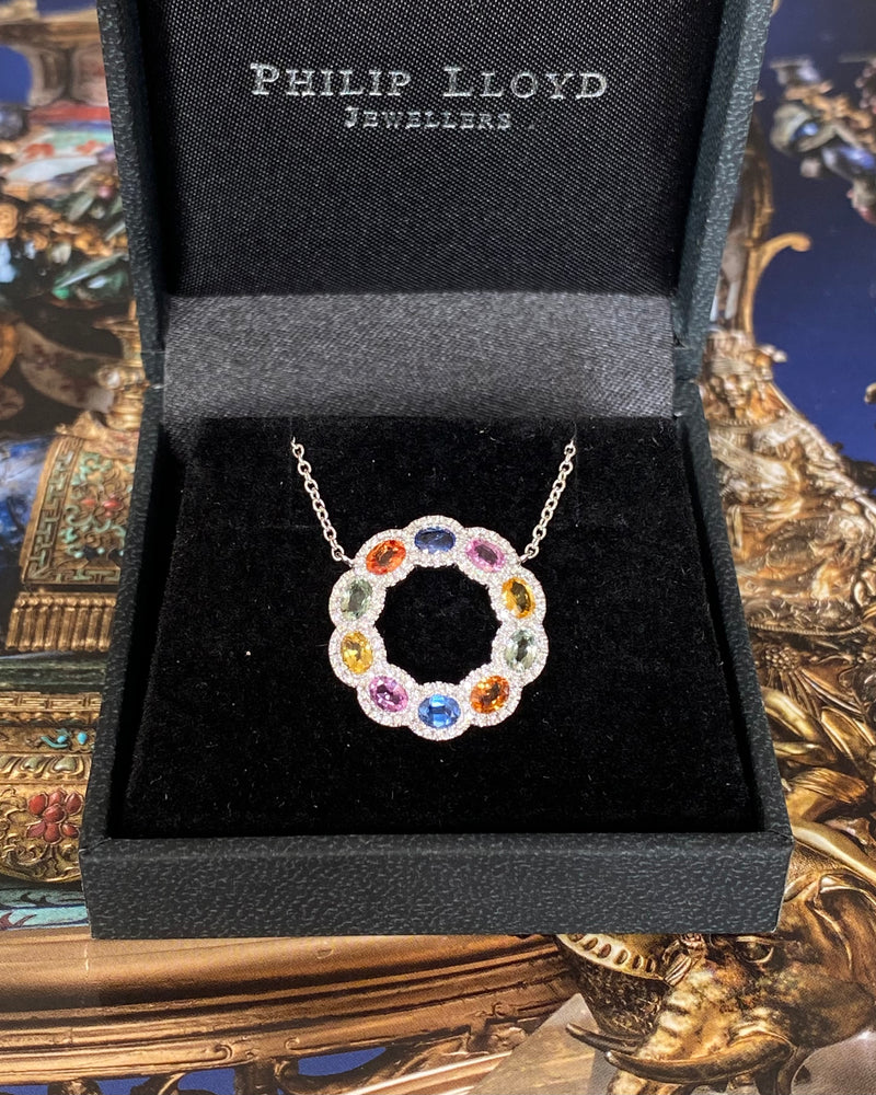 This contemporary style multi-coloured Sapphire and Diamond pendant is unique and sure to catch everyone’s eye! The pendant contains of a mixture of blue, pink, yellow, green and orange Sapphires set in a circular design and weighing 2.37ct in total. These vibrant Sapphires are perfectly offset by the surrounding fine claw set Brilliant Cut Diamonds. The dazzling Diamonds weigh 0.38ct in total and are bright and lively stones, approximately 'G' colour and 'VS' clarity. The pendant measures 21mm x 21mm and is made entirely in 18ct White Gold. The chain measures 16 inches and is also 18ct White Gold.