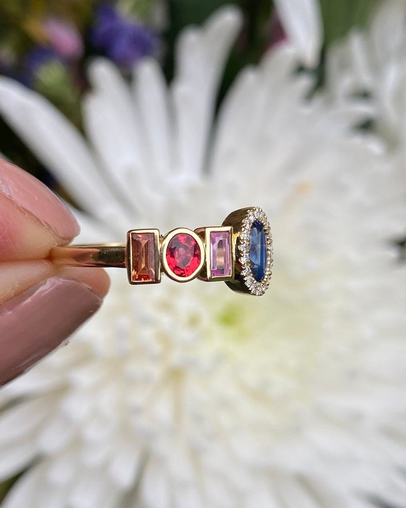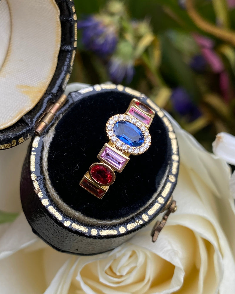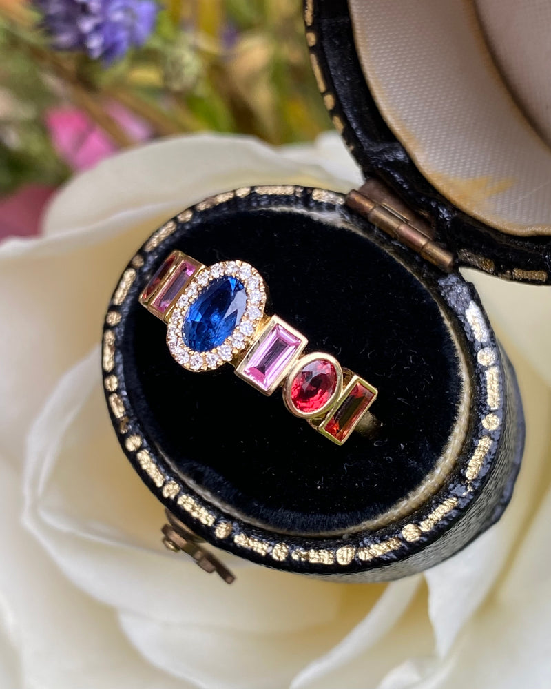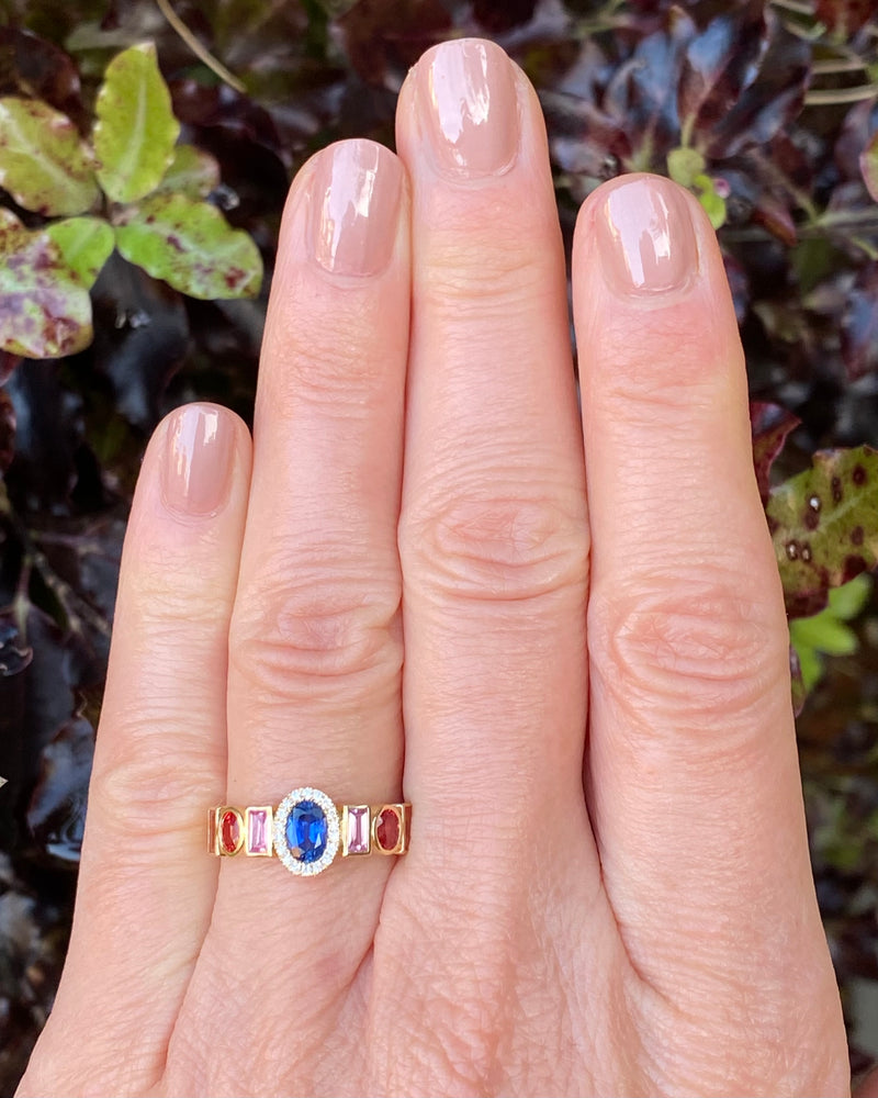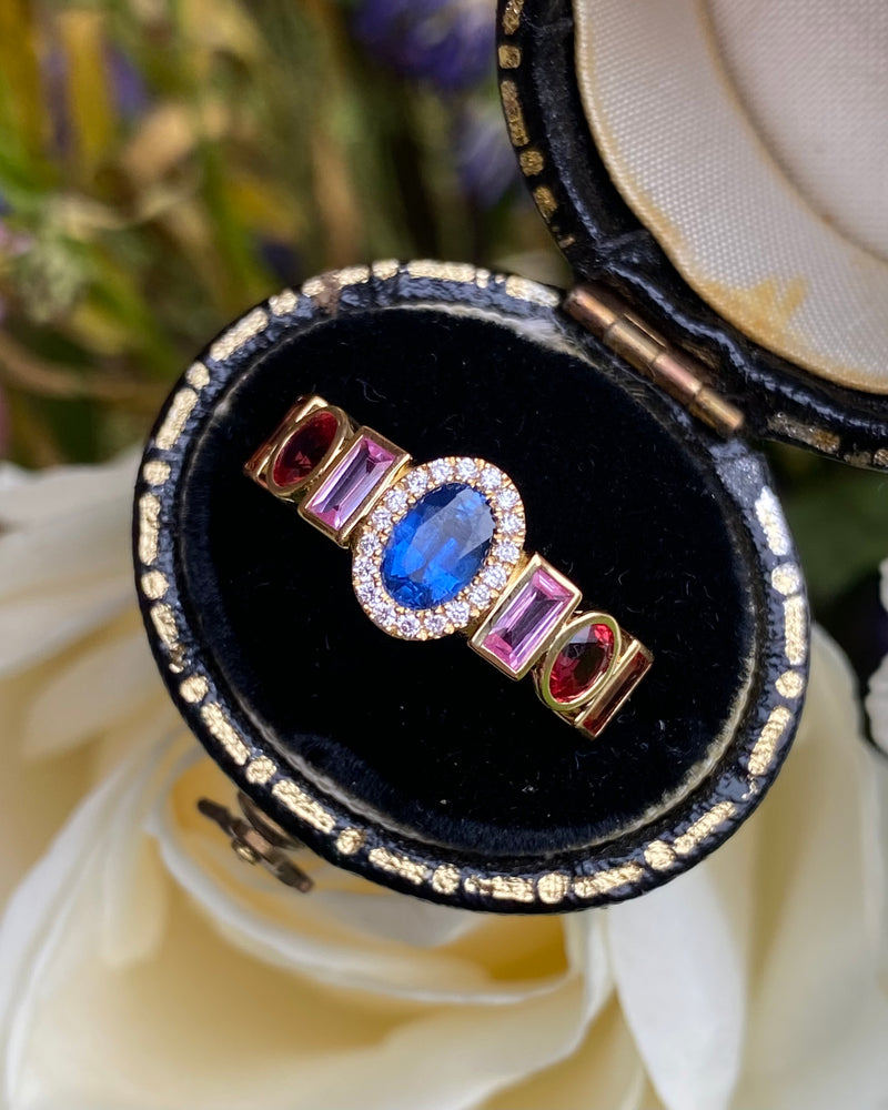 Wow! This contemporary style multi-coloured Sapphire and Diamond ring is a statement ring and what a statement it is! The ring features a vibrant cornflower blue central Oval Cut Sapphire, perfectly offset by the dazzling Diamond surround, and beautifully complemented by the pink, red and orange Sapphires of various sizes and cuts Rubover set either side. The Brilliant Cut Diamonds are approximately 'G' colour and 'VS' clarity, finished with a Pave Setting and weigh 0.10ct in total, with the Sapphires coming to a total weight of approximately 1.70ct. The ring is made entirely in 18ct Yellow Gold, with a traditional Rubover setting.