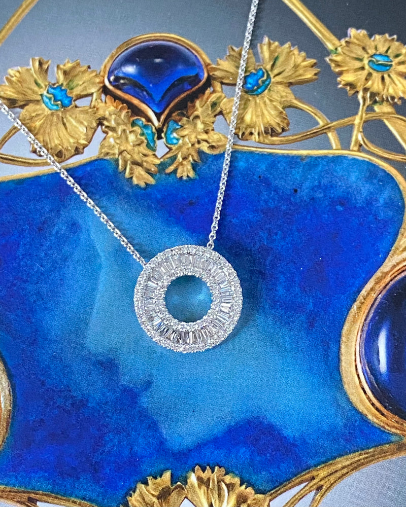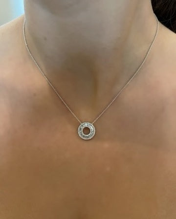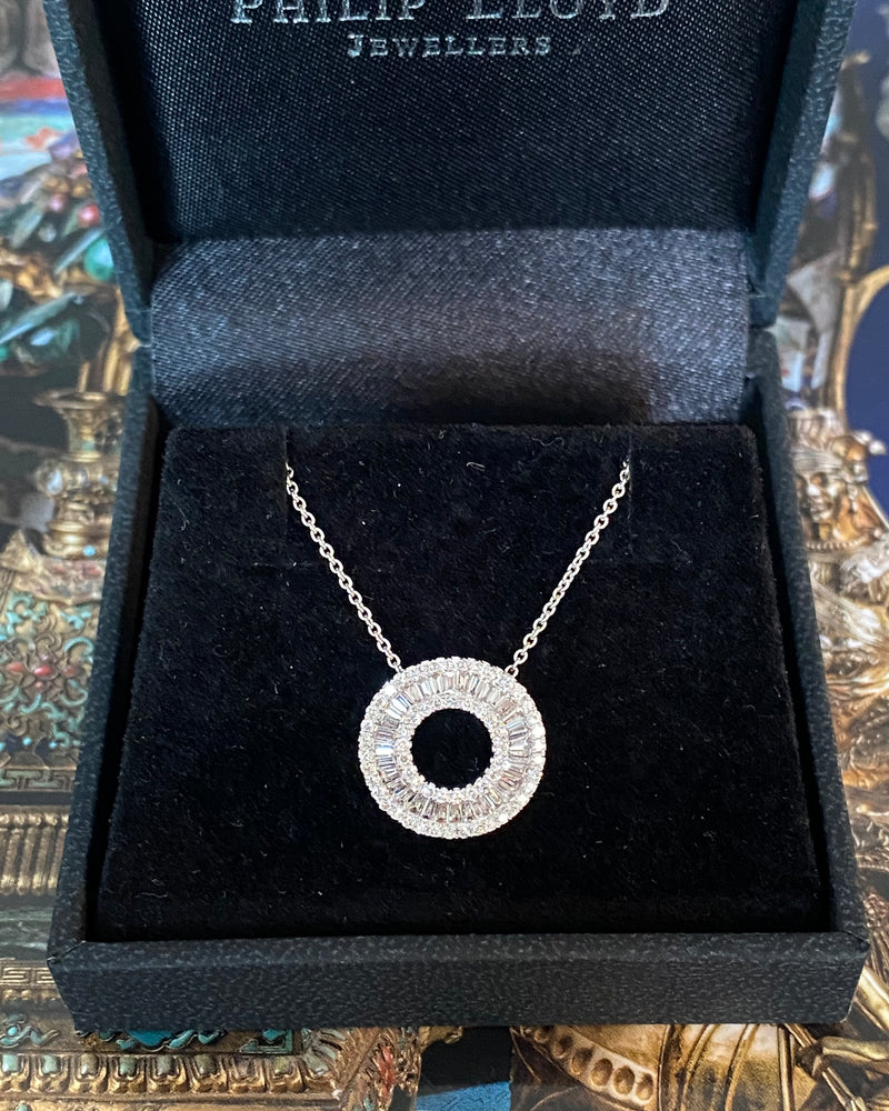 A lovely Contemporary Style Diamond Circular Pendant set entirely in 18ct White Gold. The pendant features numerous Baguette Cut Diamonds Channel set around a beautiful circular design. In addition to this, there is an inner and outer circle of surrounding fine claw set Round Brilliant Cut Diamonds, providing the ultimate sparkle factor! The dazzling Diamonds are bright and lively stones of a fine 'G' colour and 'VS' clarity that sparkle beautifully when worn and weigh a total of 0.79ct in Diamond weight. The pendant measures 14.5mm round and is made entirely in 18ct White Gold. The chain measures 16.5 inches and is also 18ct White Gold. This is a lovely eye-catching design, suitable for any occasion!