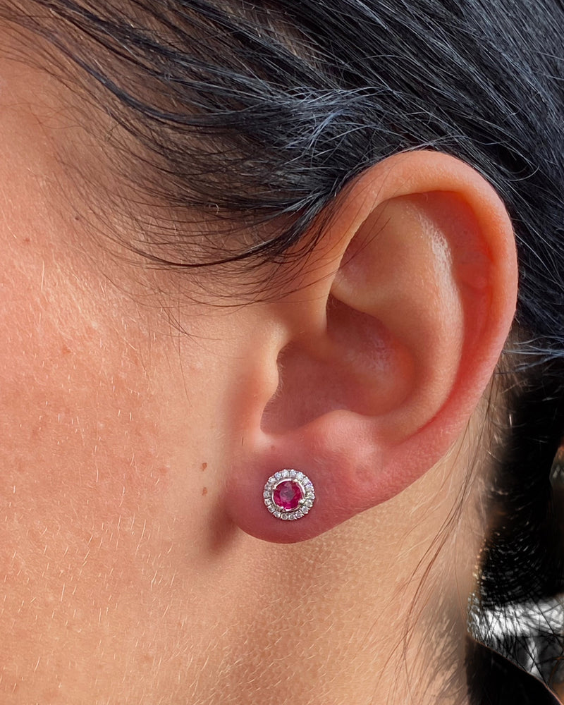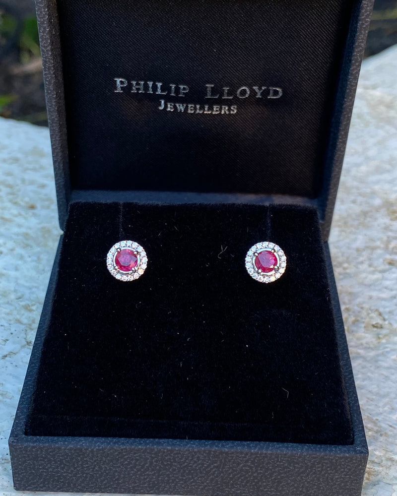 A lovely pair of Ruby and Diamond Cluster Stud Earrings. These very versatile earrings will take you from day to night with ease. The gorgeous rubies are a lovely blood red colour, and weigh 0.75ct. They are four claw set and are perfectly offset by the surrounding diamonds. The central ruby measures 4mm and the total diameter of the earrings is 7.5mm. The surrounding diamonds are Brilliant Cut and weigh a total of 0.18ct and are very bright and clean, approximately G/H colour and SI/VS clarity. The earrings have butterfly back fastenings and are entirely set in 18ct White Gold, and would make a perfect gift or treat for yourself!