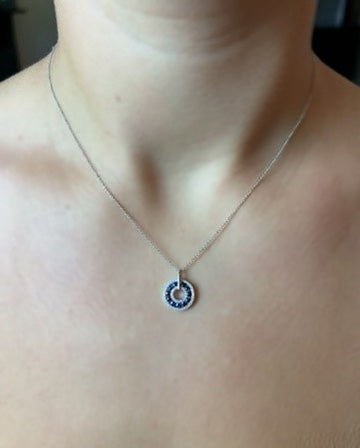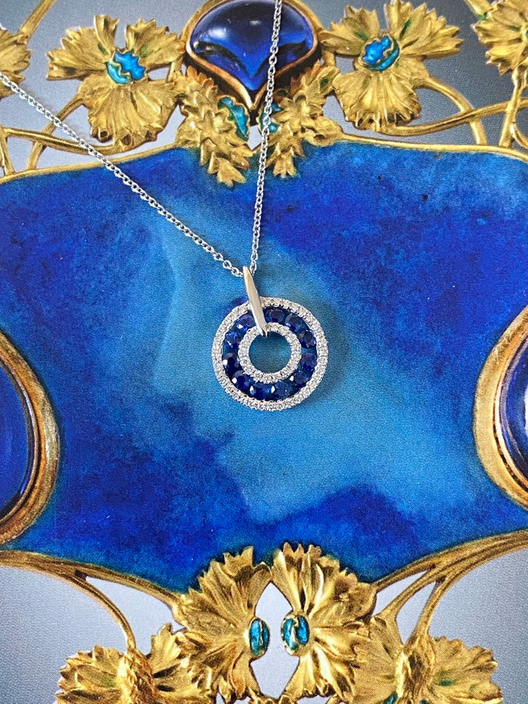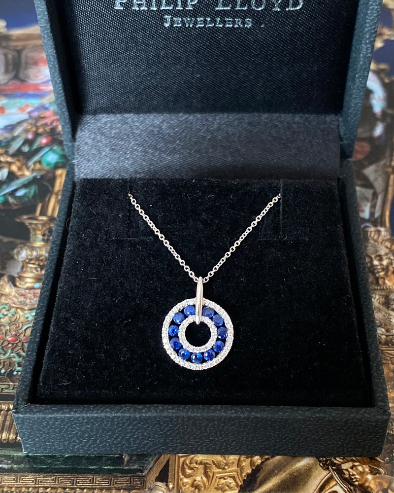 Contemporary Sapphire and Diamond Circular Pendant 18ct White Gold 0.13ct + 0.44ct