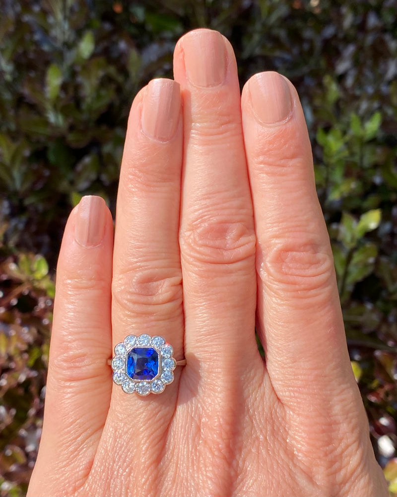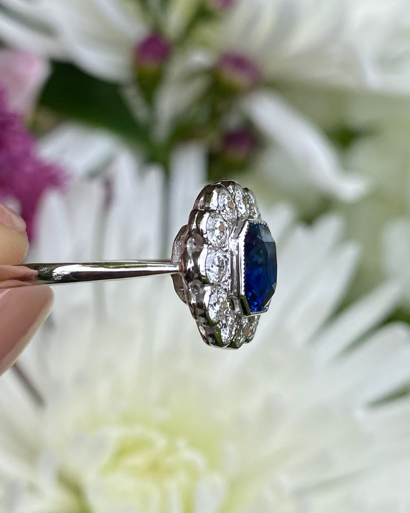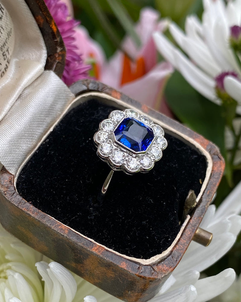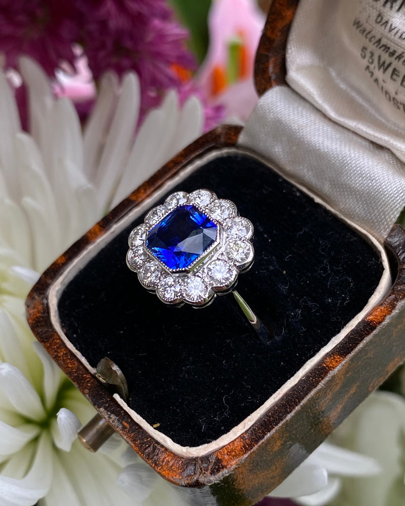 This is a gorgeous Sapphire and Diamond Cluster Ring set in Platinum. The central Square Cushion Cut Sapphire is a lovely rich cornflower blue colour and is set in a rub over setting with a fine milgrain edging. The Sapphire is surrounded by twelve Round Brilliant Cut Diamonds which are also rub over set and sparkle beautifully. The Sapphire measures 7mm x 7mm, weighs 2.07ct and is lovely quality. The Diamonds weigh 0.81ct and are a bright H/I colour and VS/SI clarity. The ring sits nice and low on the finger and is lovely to wear. This is a beautiful ring!