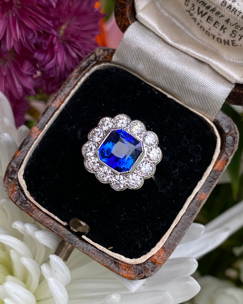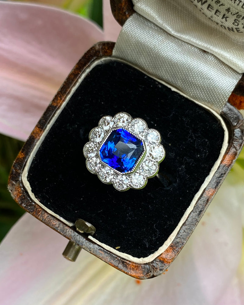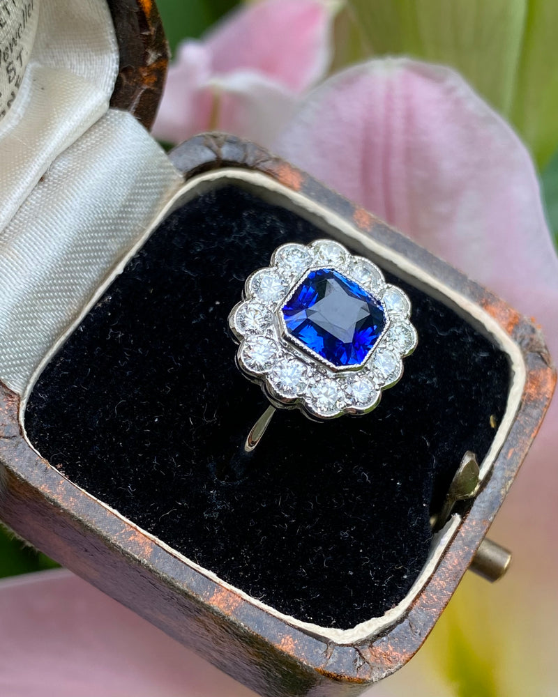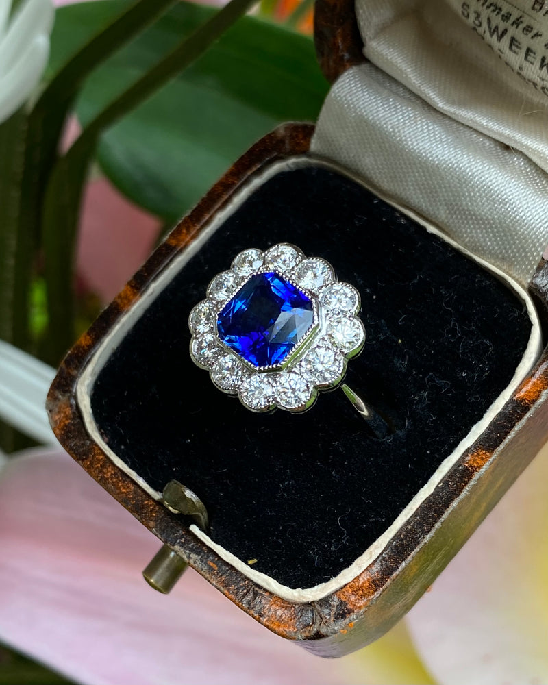 This is a gorgeous Sapphire and Diamond Cluster Ring set in Platinum. The central Square Cushion Cut Sapphire is a lovely rich cornflower blue colour and is set in a rub over setting with a fine milgrain edging. The Sapphire is surrounded by twelve Round Brilliant Cut Diamonds which are also rub over set and sparkle beautifully. The Sapphire measures 7mm x 7mm, weighs 2.07ct and is lovely quality. The Diamonds weigh 0.81ct and are a bright H/I colour and VS/SI clarity. The ring sits nice and low on the finger and is lovely to wear. This is a beautiful ring!