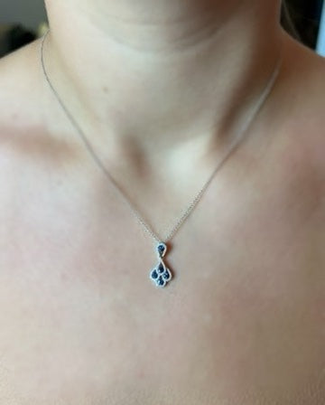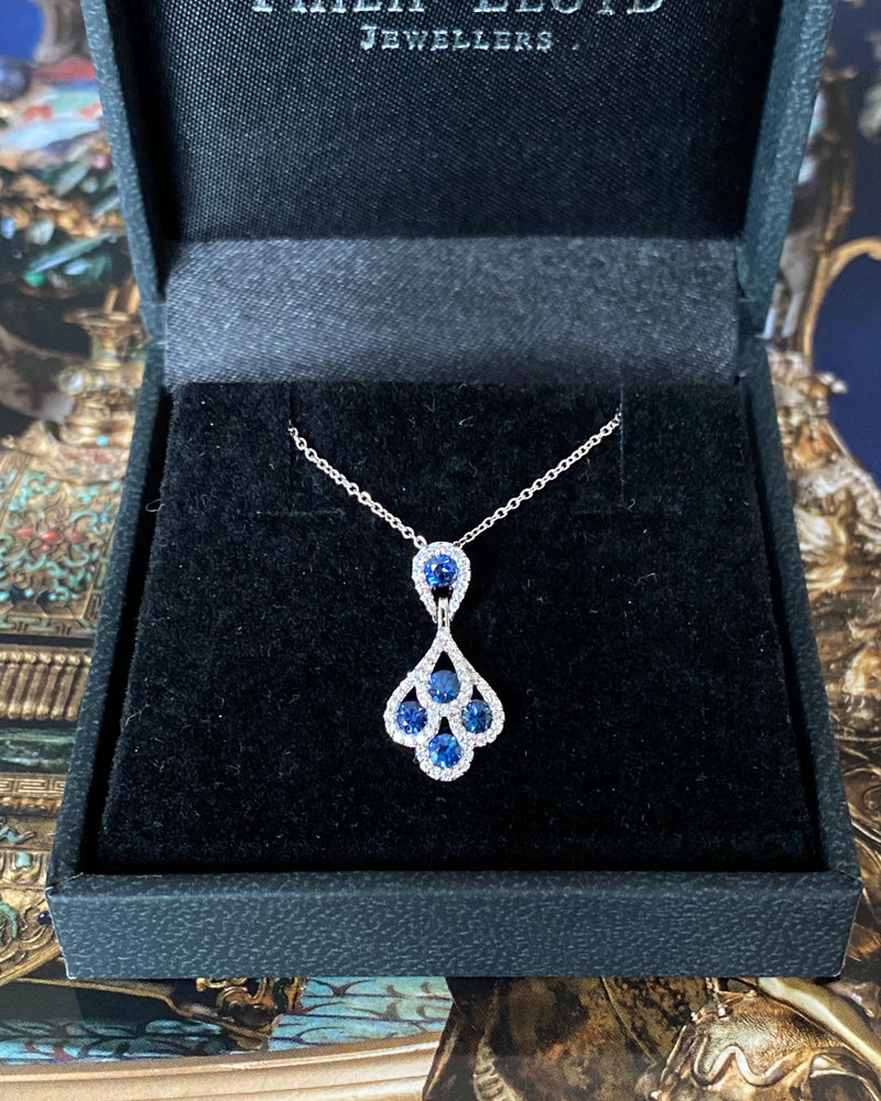 A gorgeous Contemporary Sapphire and Diamond Drop Pendant, set in 18ct White Gold. The Pendant features five Round Cut Sapphires with a stunning, highly saturated regal blue colour, full of life, weighing 0.50ct in total. Surrounding each of the Sapphires are Round Brilliant Cut Diamonds, set in a fine claw setting, which are fantastic bright stones with no marks visible to the naked eye, approximately VS clarity and G colour and sparkle beautifully. The pendant and chain are made entirely in 18ct White Gold, and the chain measures 16.5 inches and has an articulated design allowing it to move freely when worn - this is a lovely quality pendant suitable for suitable occasion or every day.