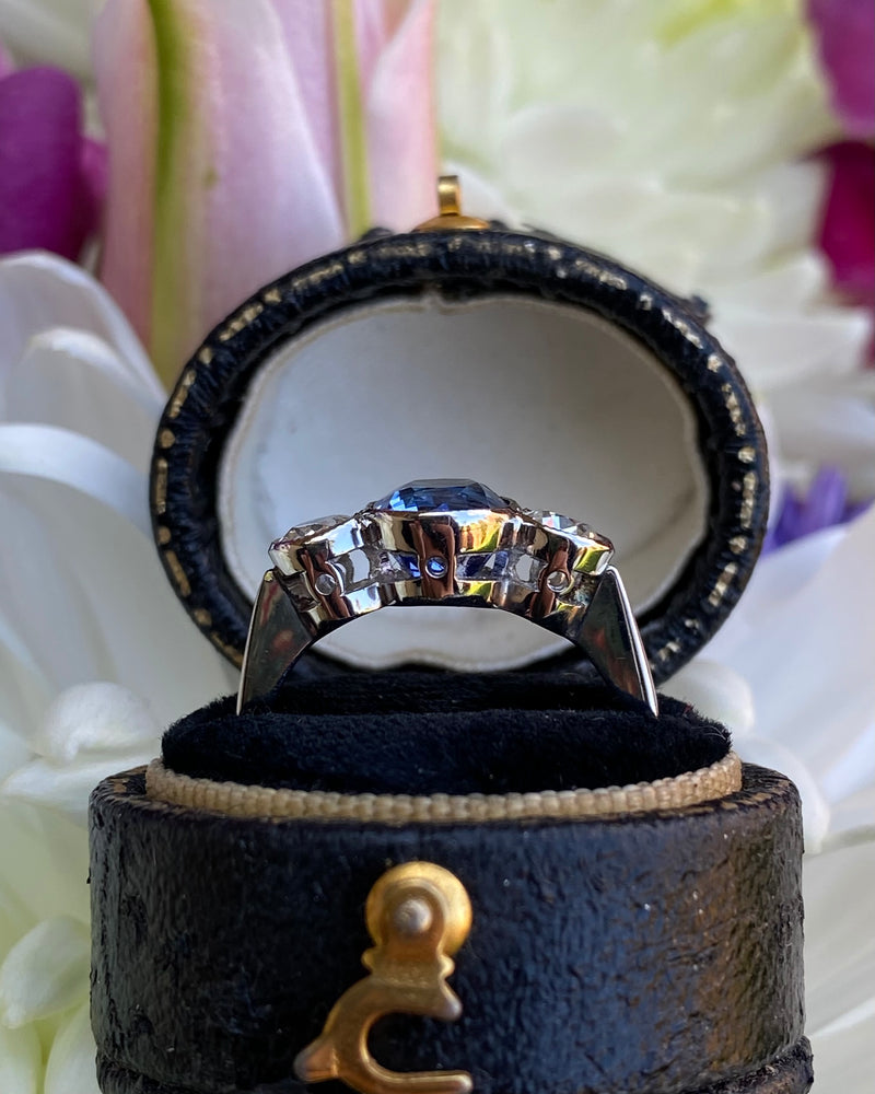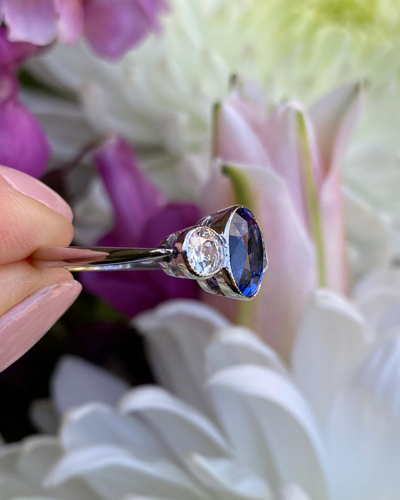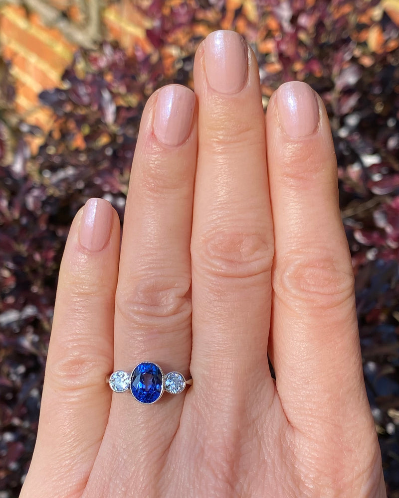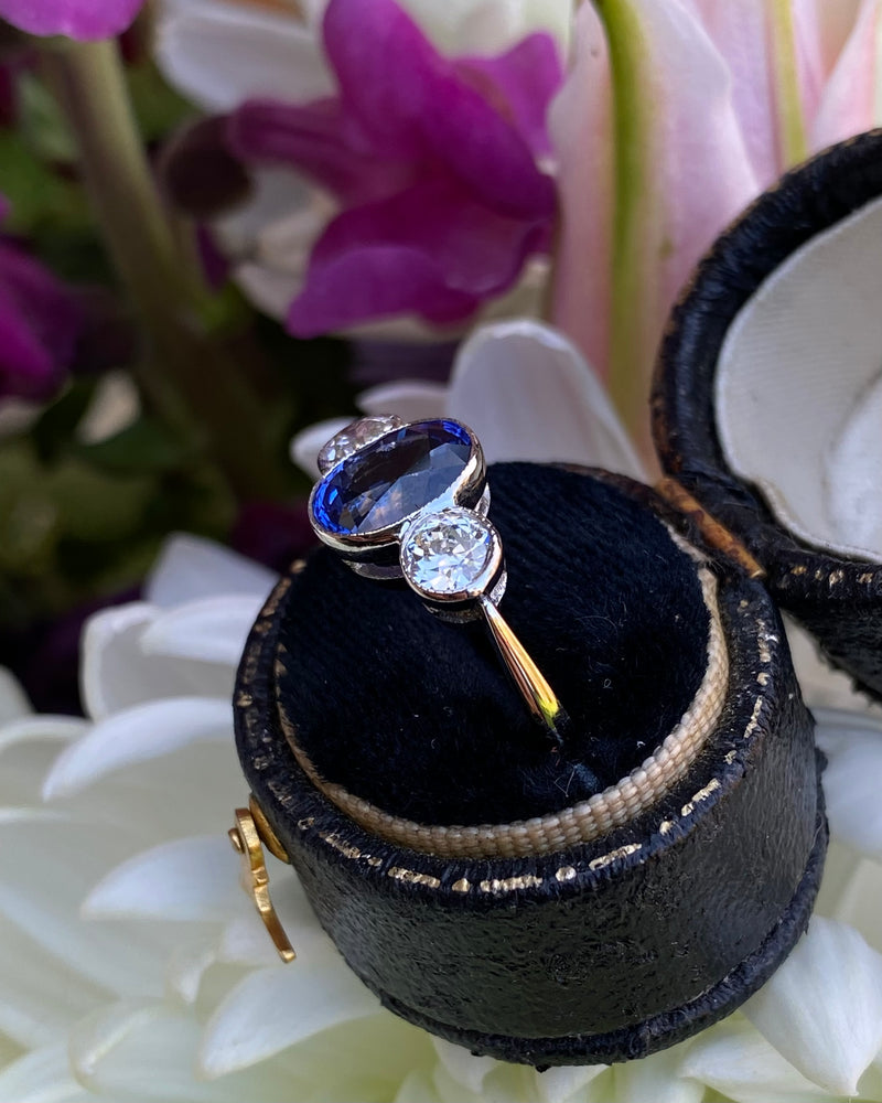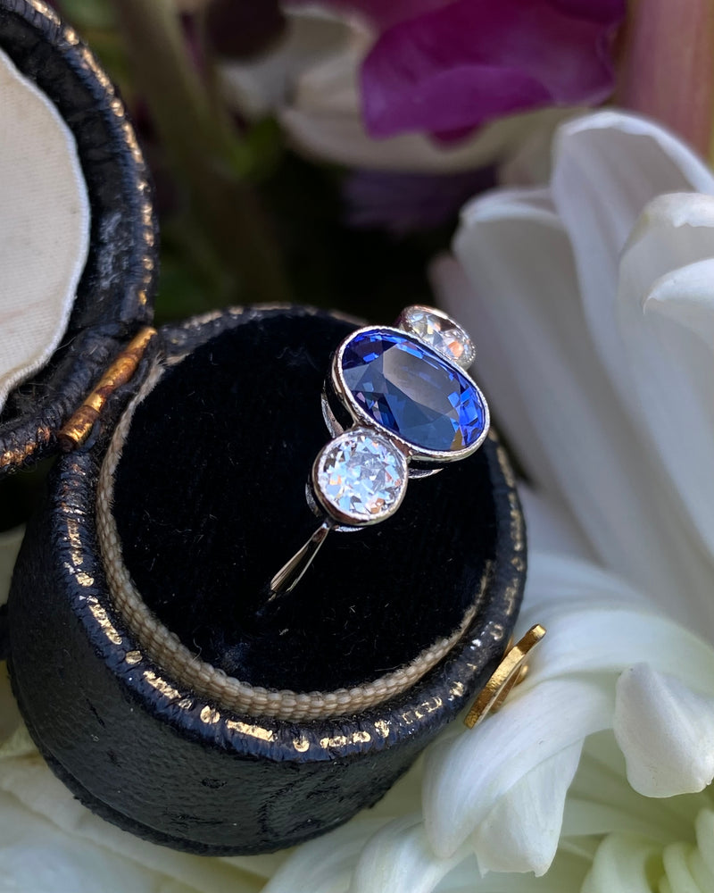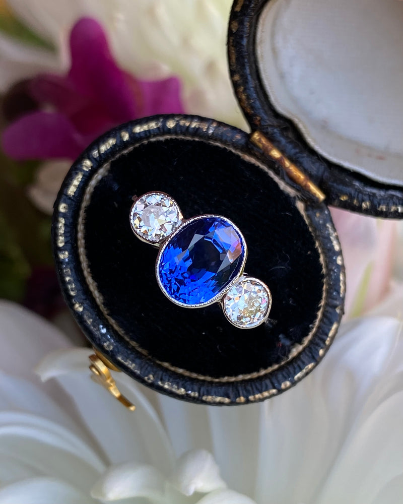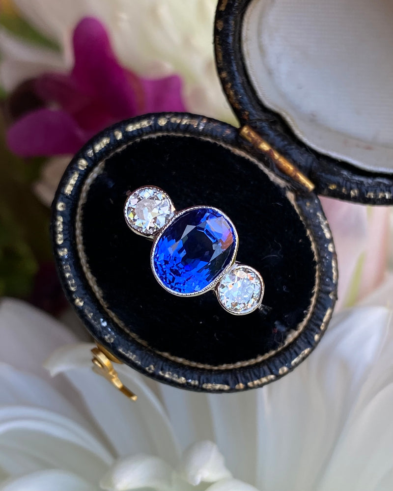 A lovely Sapphire and Diamond Three Stone Ring with a gorgeous cornflower blue Sapphire of a fine colour and clarity, set in a rubover style with milgrain edging. In addition to the stunning central stone are gorgeous Old Cut Diamonds set either side weighing approximately 0.55ct in total. These are lovely and bright original stones with I colour and VS/SI clarity. The beautiful blue Sapphire weighs approximately 2.75ct and measures 9mm by 7mm, it looks beautiful when worn and sits nice and low on the finger. This is a truly stunning ring!