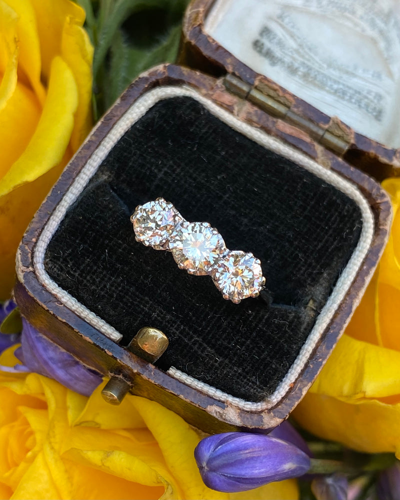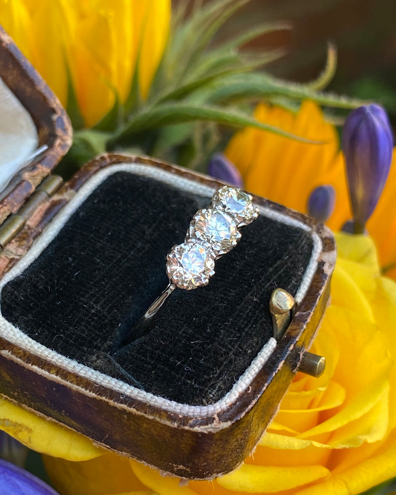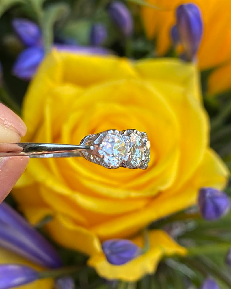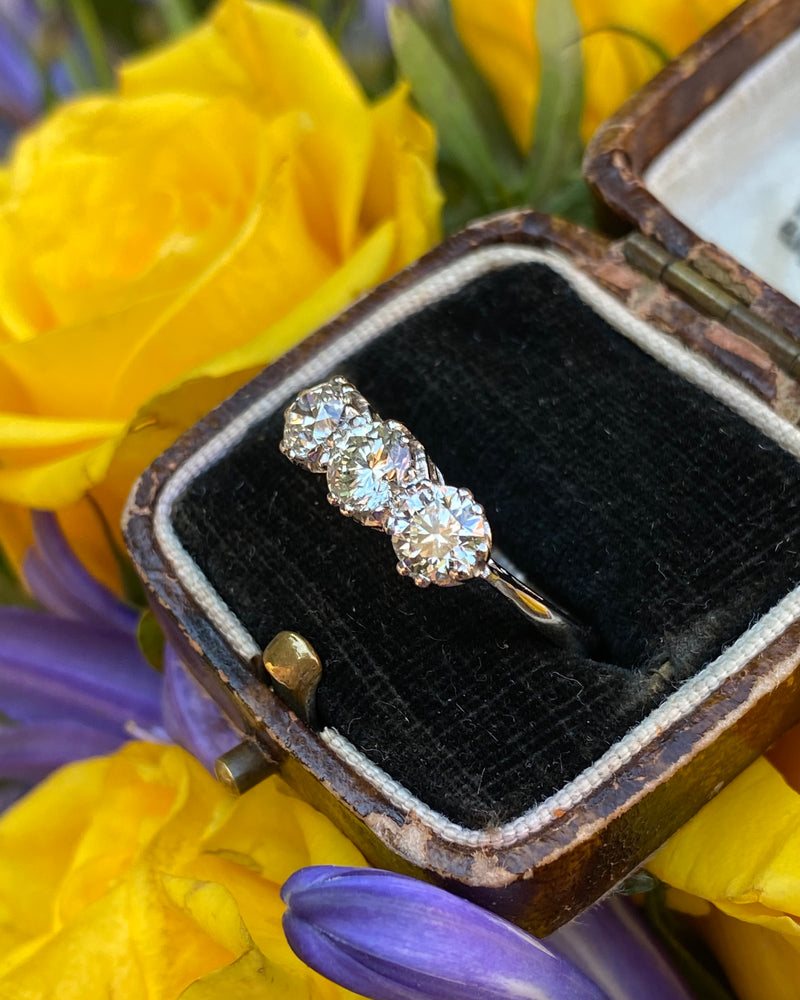 This is a fantastic price for the size and look of this ring! It makes a statement, is timeless and the Diamonds are lively and sparkle beautifully. It would make a stunning engagement ring or a just a very special ring. The ring has an attractive under bezel and contains three Brilliant Cut Diamonds slightly graduating in size that are claw set, running in a line across the finger. These lively Diamonds are I/J colour and VS/SI clarity and weigh a total of 1.70ct. This is a classic ring, an impressive look and great value for money! The ring is set entirely in heavy, high quality Platinum and could be easily sized to different measurements.