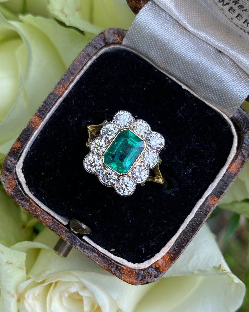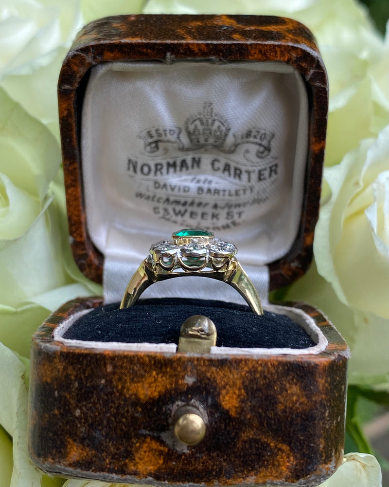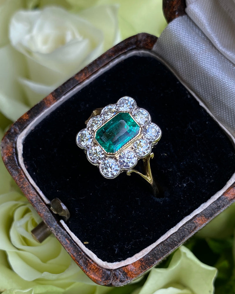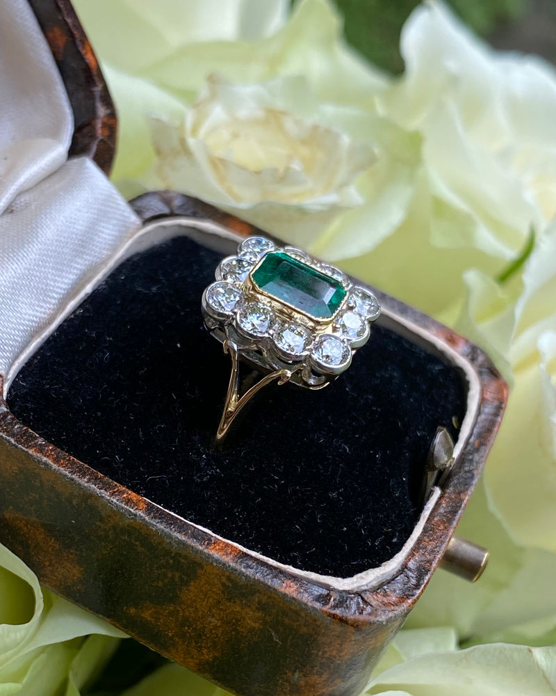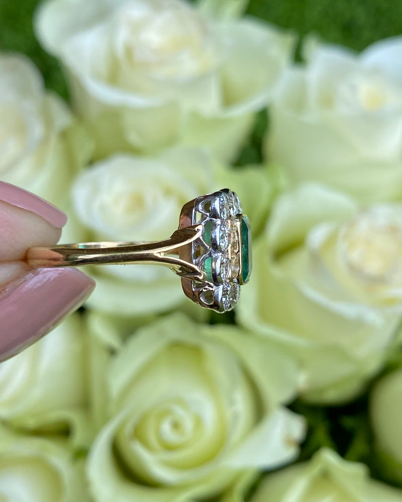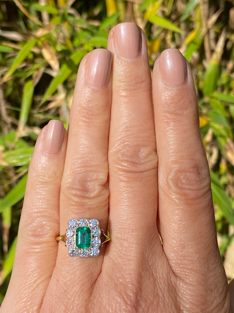 Victorian Emerald and Diamond Cluster Ring 18ct Yellow Gold 0.90ct + 1.0ct