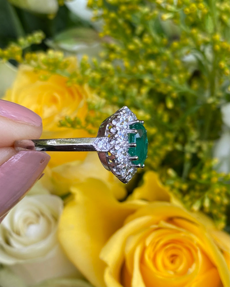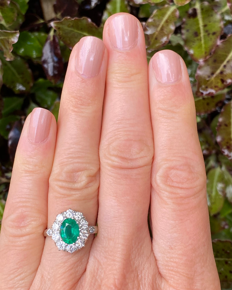 A fabulous Victorian Style Emerald and Diamond Cluster Ring. The 1.20ct Central Oval Cut Emerald is of great colour and clarity, measures 8mm x 6mm and is fine claw set. Emeralds of this quality and size are very difficult to find and are highly sought after. The gorgeous grassy green colour is set off exquisitely by the surrounding substantial sized ten Brilliant Cut Diamonds set in a fine claw setting with a further Brilliant Cut Diamond pave set in each shoulder of the ring. The dazzling Diamonds have a total Diamond weight of 0.95ct and are bright stones with no marks visible to the naked eye, approximately H/I colour, VS/SI clarity and sparkle beautifully. The ring has a very attractive under-bezel - this really is a fabulous ring. The ring is made entirely in heavy high quality Platinum and feels great quality and looks it too!