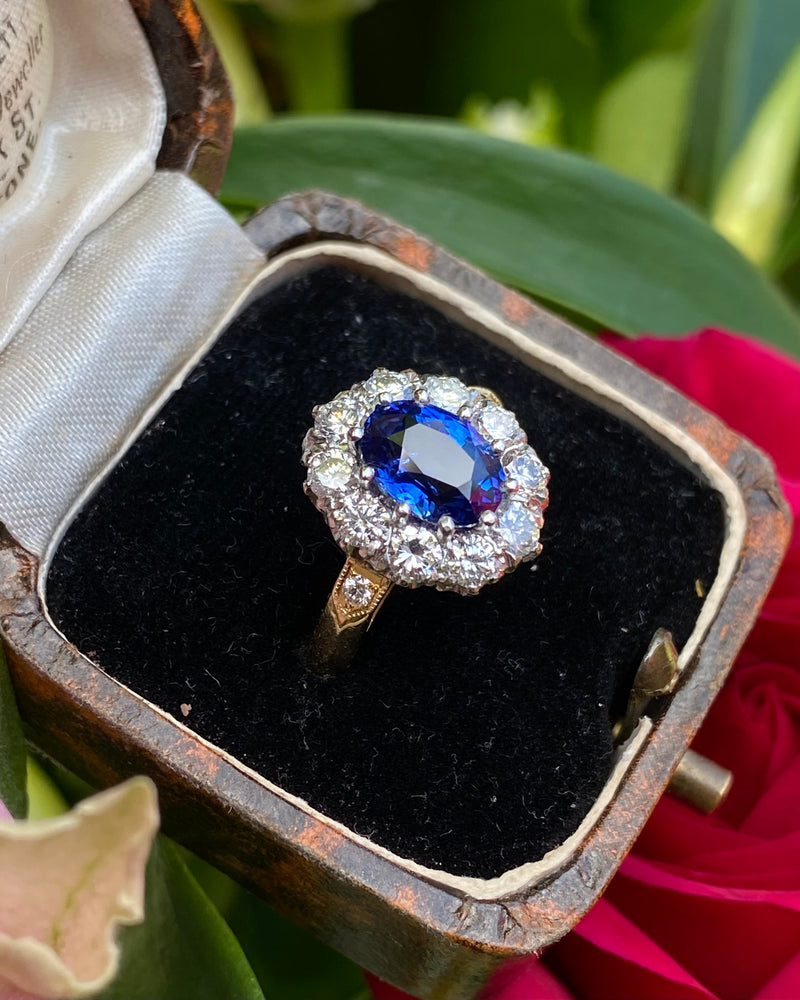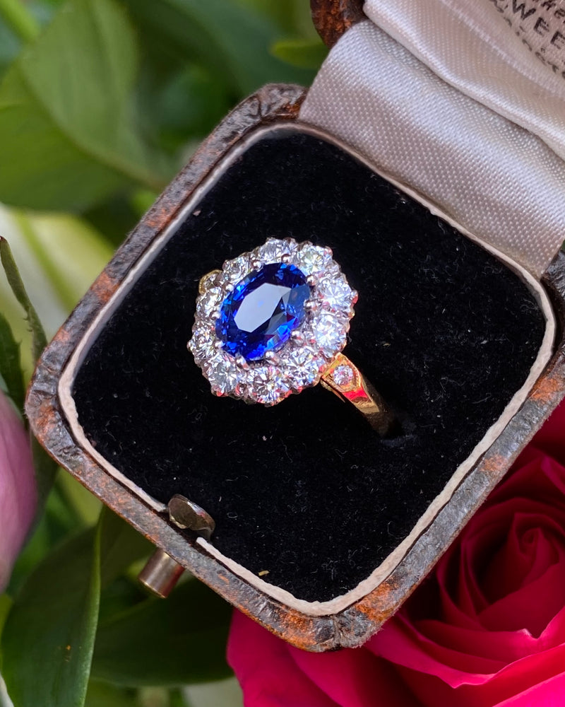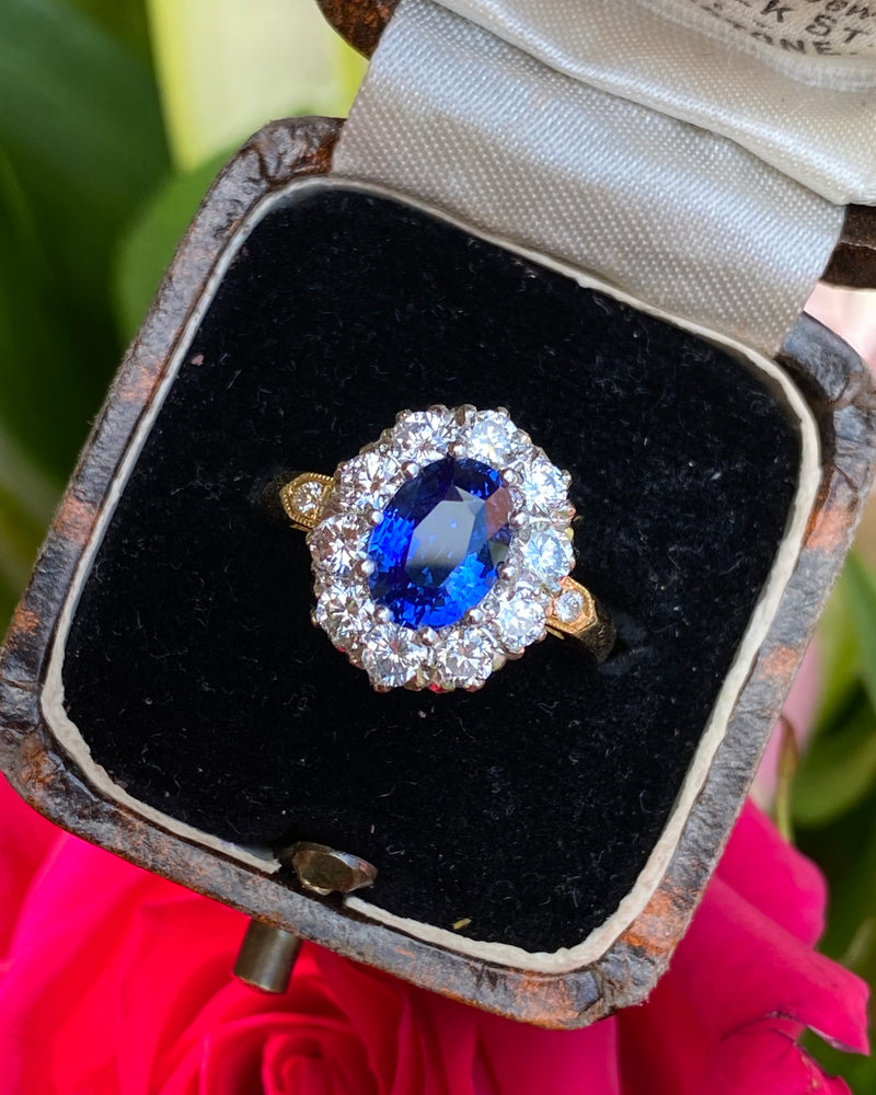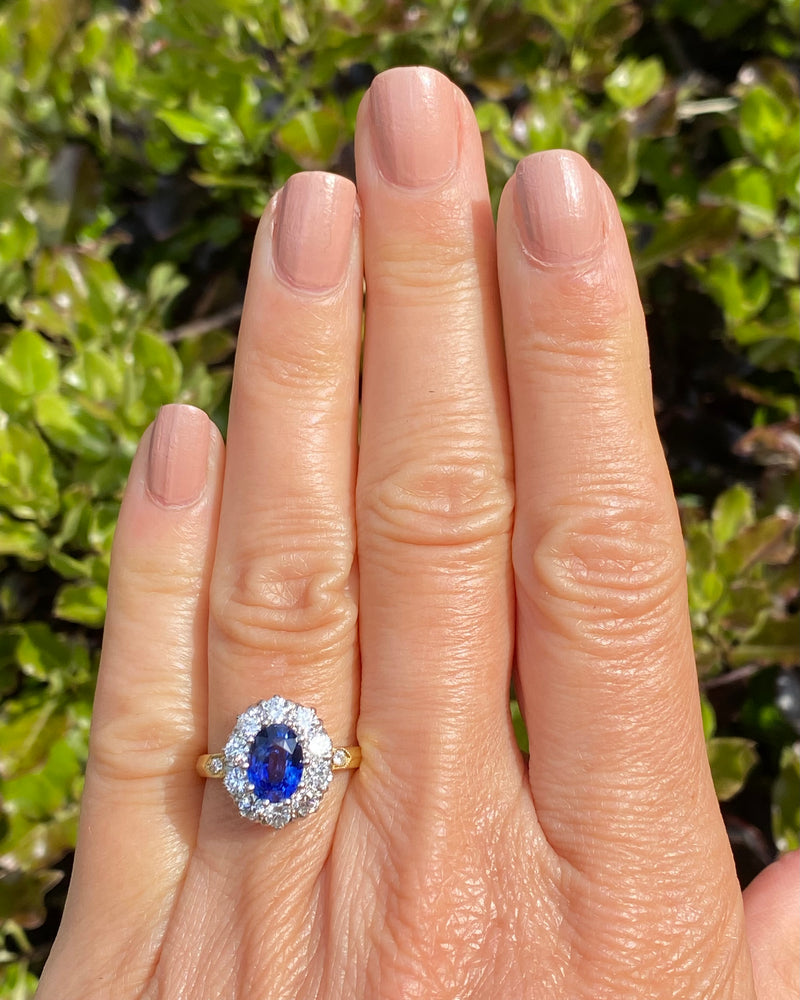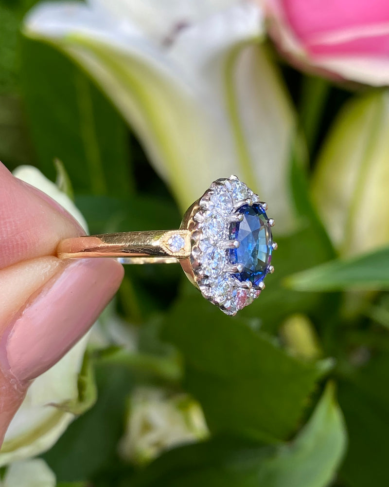 An absolutely stunning Victorian style Sapphire and Diamond Cluster Ring with a classic, elegant look. At the centre of the ring is an Oval Cut Sapphire with a sought-after rich blue hue, measuring 8mm x 6mm and weighing 2.12ct. Surrounding the central Sapphire are ten Brilliant Cut Diamonds, with another Diamond set into each shoulder, giving a fabulous overall appearance when worn! The ring contains a total Diamond weight of 1.0ct, and are bright and clean stones, all of a fine H/I colour and VS/SI clarity. The ring is made in 18ct Yellow Gold, with the head of the ring being set in heavy, high quality Platinum. To complete this gorgeous design, all of the stones are set in a fine claw setting - it feels great quality and looks it too!
