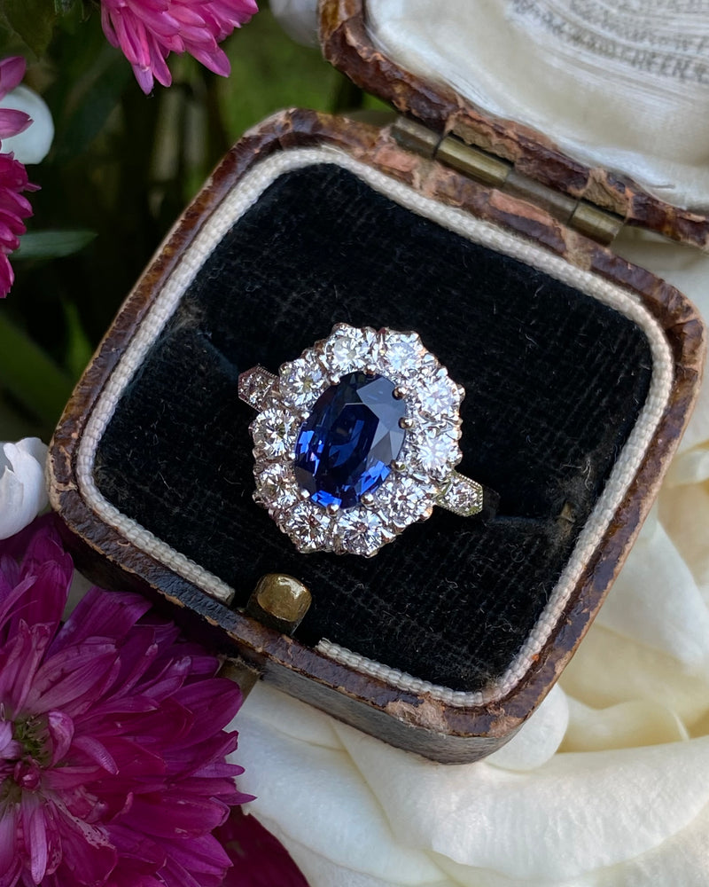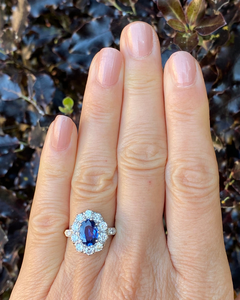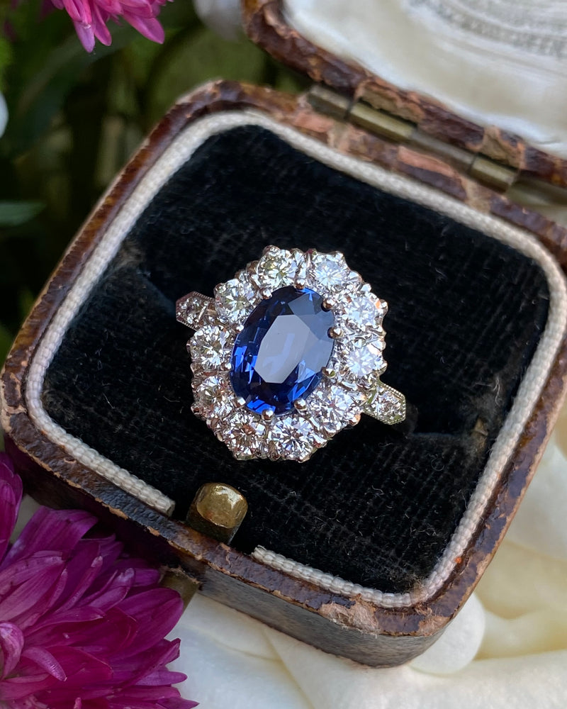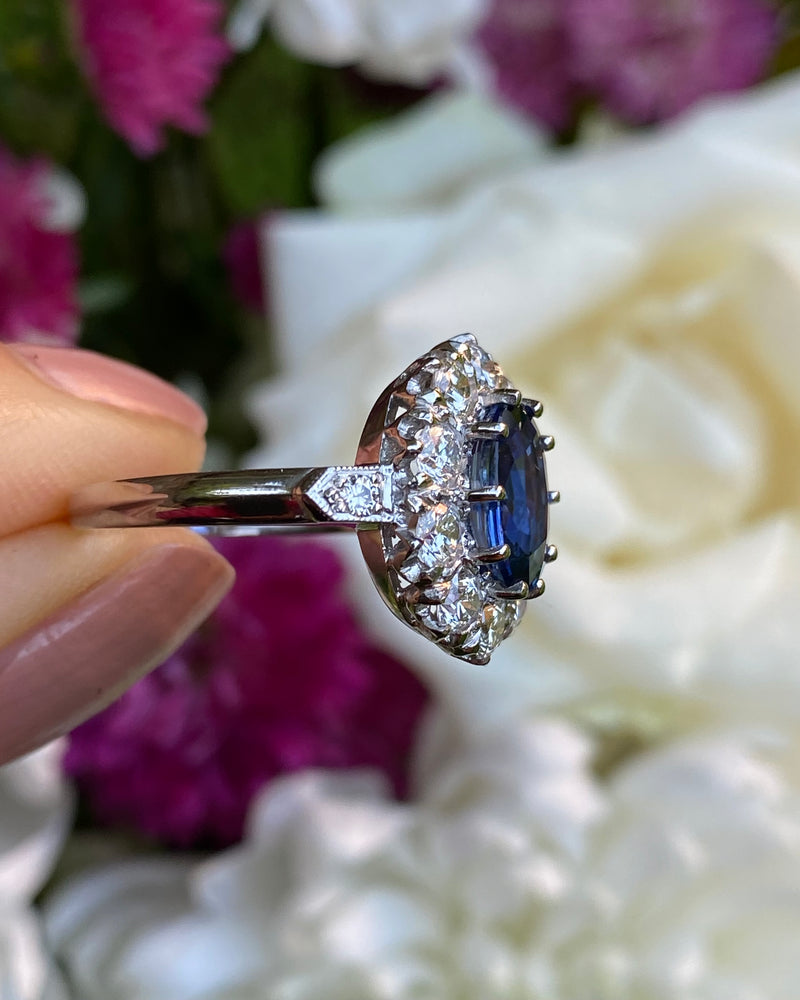 A fabulous Victorian Style Sapphire and Diamond Cluster Ring. The beautiful Ceylon blue Sapphire is a stunning colour, full of life, measuring 9mm by 7mm and weighing approximately 2.20ct and is of exceptional colour and clarity. Sapphires of this quality and size are very difficult to find and this is a fine example. The Oval Cut Sapphire is set in a traditional fine claw style setting and is off set exquisitely by the surrounding substantial sized Brilliant Cut Diamonds. There are ten Brilliant Cut Diamonds, with an additional Diamond Pave set in the shoulders, coming to a total diamond weight of 1.35ct. The Diamonds are fantastic bright stones with no marks visible to the naked eye, approximately VS/SI clarity and H/I colour and sparkle beautifully. This really is a stunning ring!