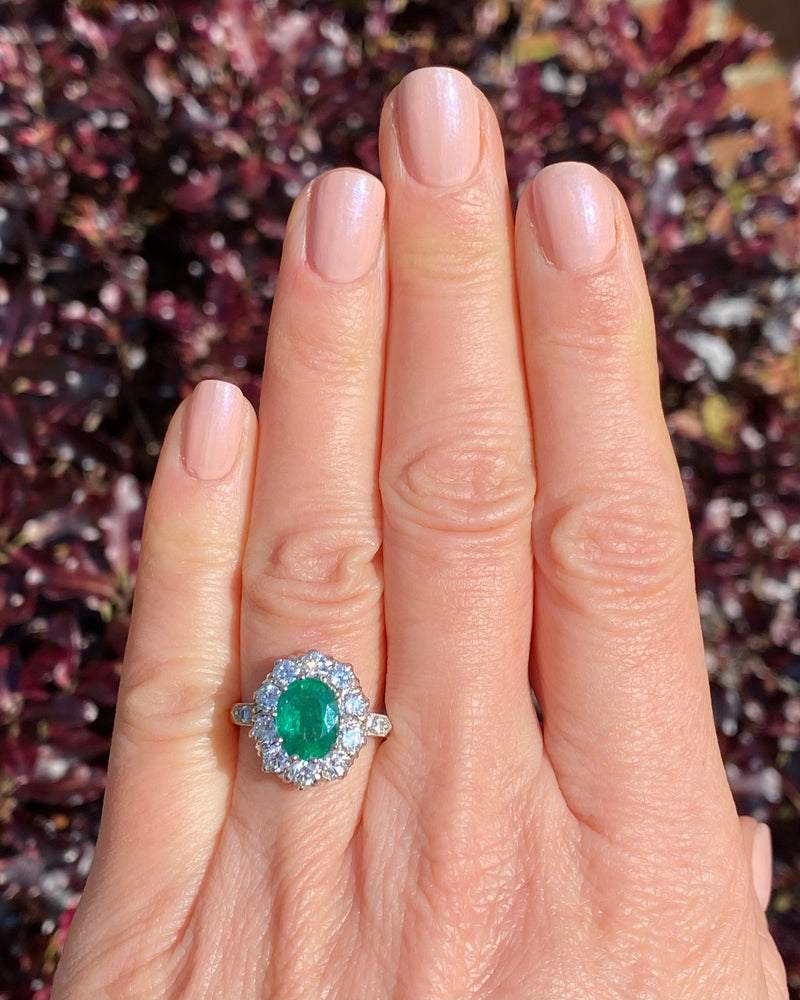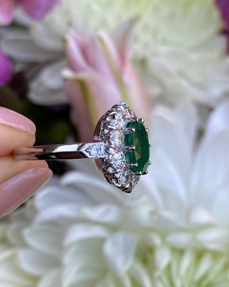 Victorian Style Emerald and Diamond Cluster Platinum Ring 1.35ct + 1.90ct