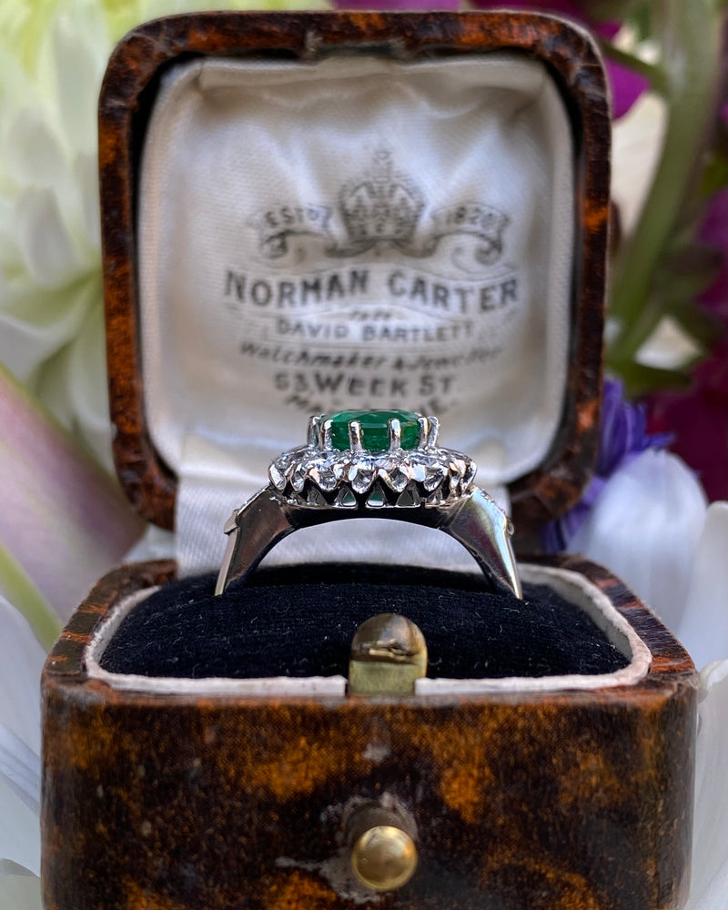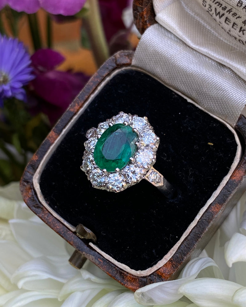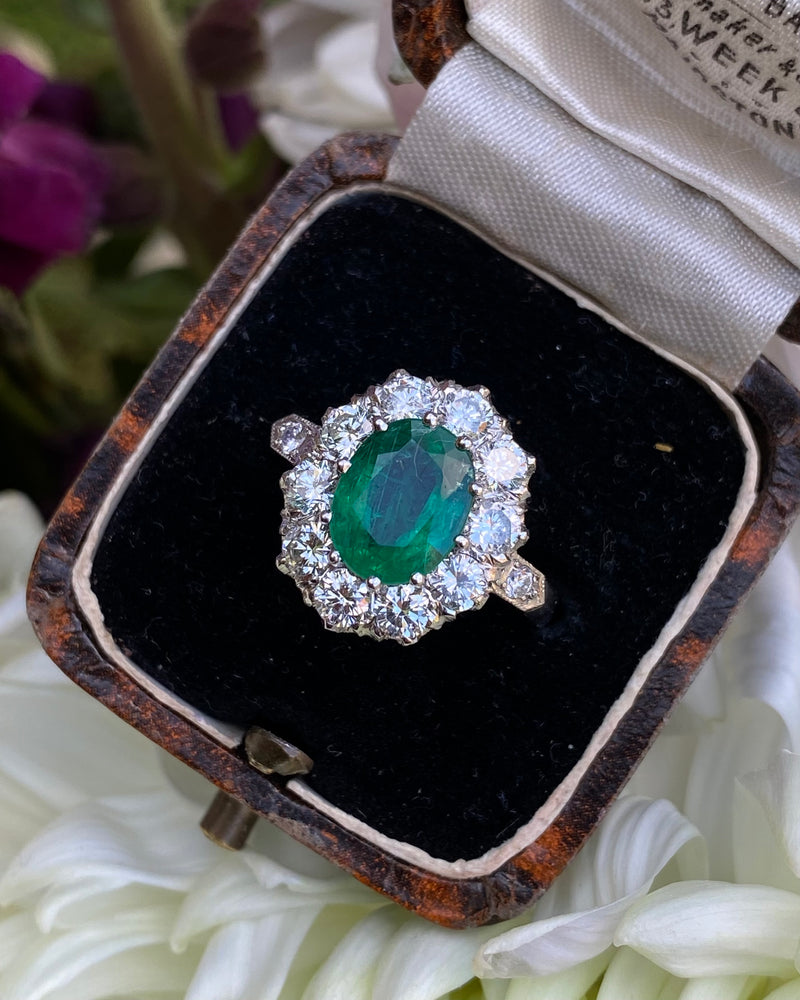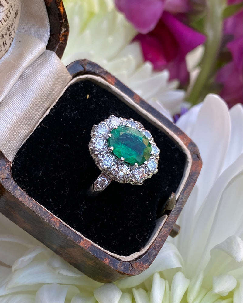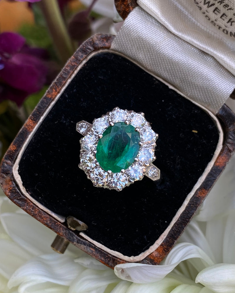 A gorgeous Victorian Style Emerald and Diamond Cluster Ring - If you love Emeralds, classics and quality, this is the ring for you! The vivid Emerald is full of life, weighing  1.90ct and measuring 9mm x 7mm, and is of exceptional colour and clarity. Emeralds of this quality and size are very difficult to find and are highly sought after. The gorgeous grassy green colour is set off exquisitely by the surrounding substantial sized Brilliant Cut Diamonds. There are ten Brilliant Cut Diamonds, with an additional Diamond Pave set in the shoulders, coming to a total Diamond weight of 1.35ct in the ring. The Diamonds are fantastic bright stones with no marks visible to the naked eye, approximately VS/SI clarity and H/I colour and sparkle beautifully. All of the stones are set in a fine claw setting, and in heavy, high quality Platinum - this really is a fabulous ring!