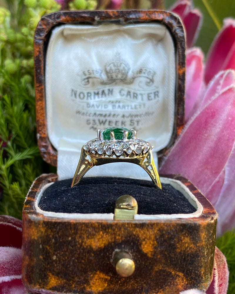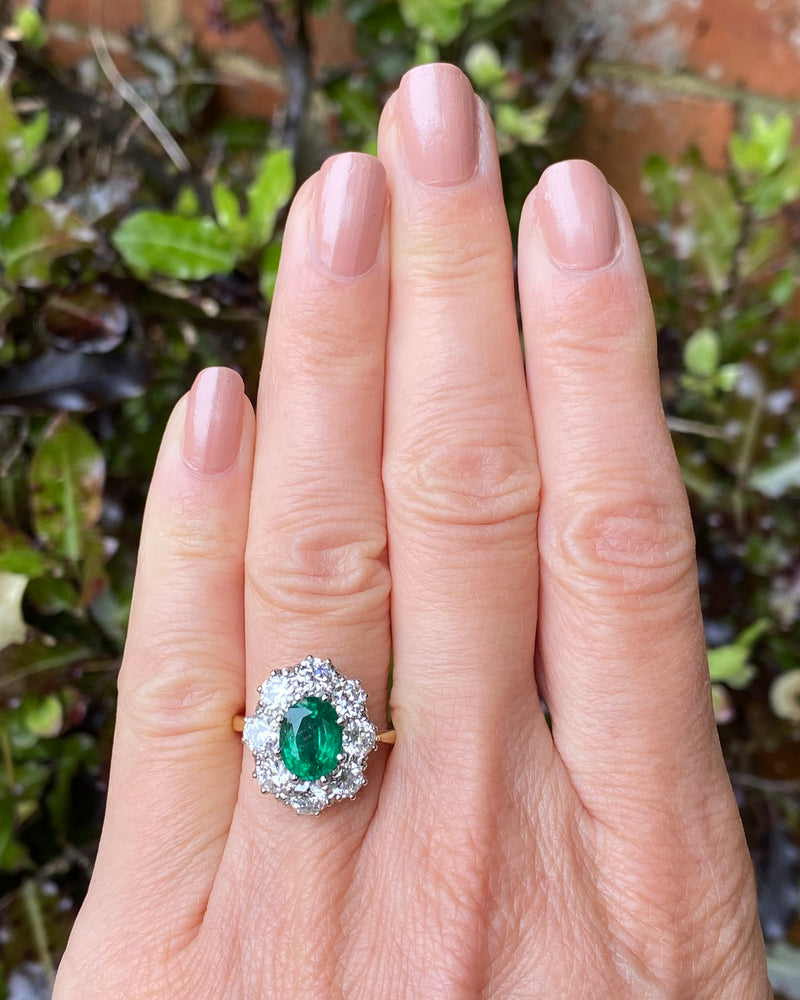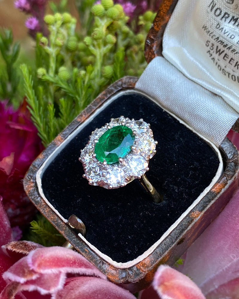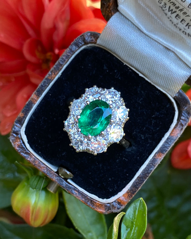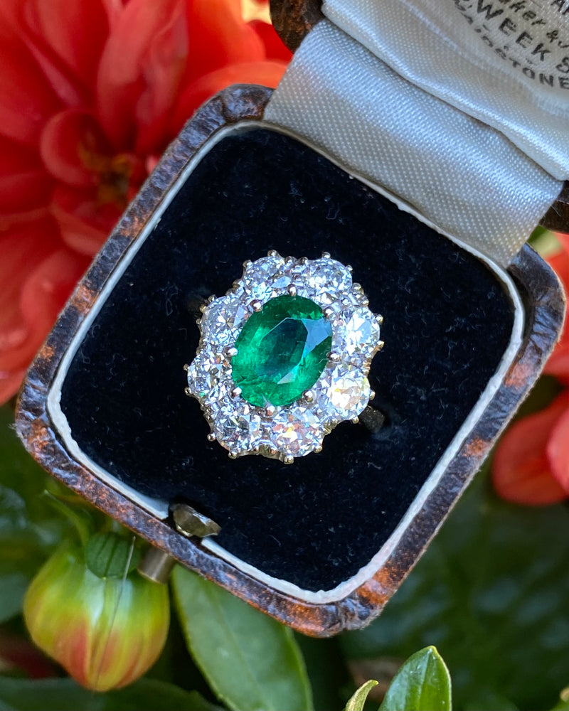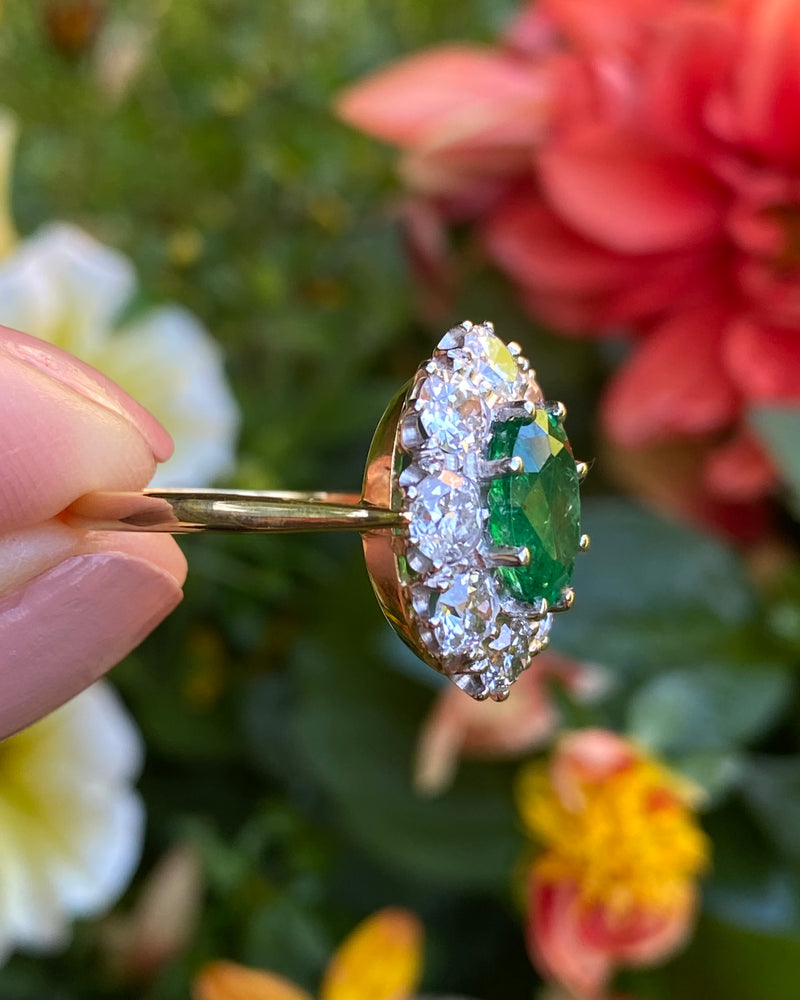 Victorian Style Emerald and Diamond Cluster Ring 18ct Yellow Gold 1.90ct + 2.02ct