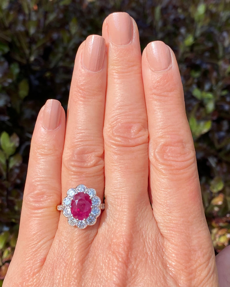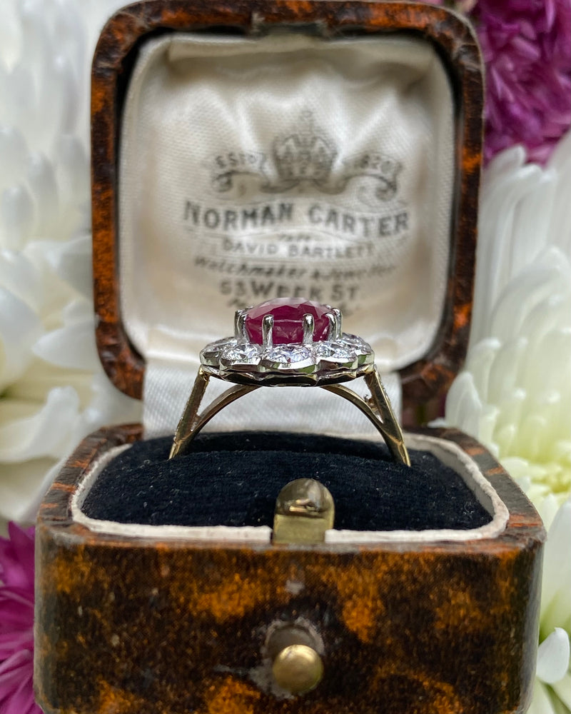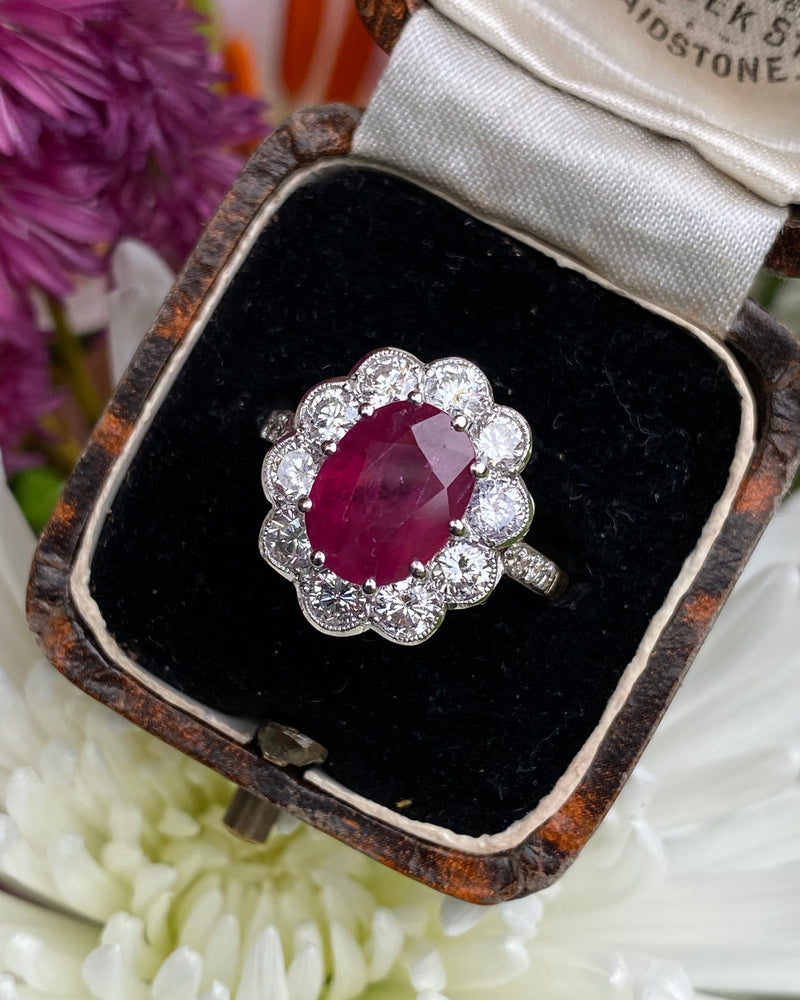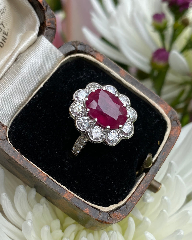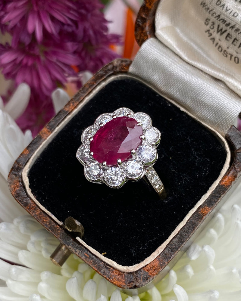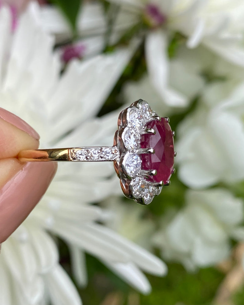 A fabulous Victorian Style Ruby and Cluster Ring. The 3.85ct Ruby is a fantastic sought after, blood red colour and is set off exquisitely by the surrounding substantial sized Brilliant Cut Diamonds. The Ruby is Oval Cut, measures 10mm x 8mm and is set in a traditional claw setting with the surrounding Diamonds rubover set and finished with a fine milgrain edging. There are ten Brilliant Cut Diamonds, with three additional Diamonds Pave set in the shoulders, coming to a total Diamond weight of 1.40ct in the ring. The Diamonds are bright stones with no marks visible to the naked eye, approximately VS/SI clarity and H/I colour and sparkle beautifully. This is a spectacular ring!