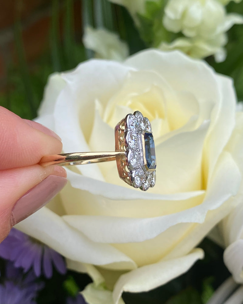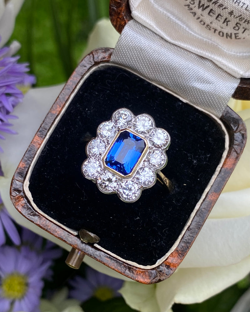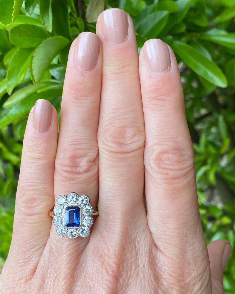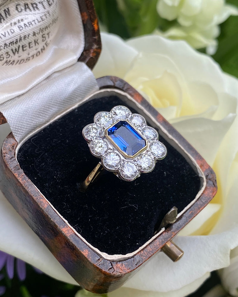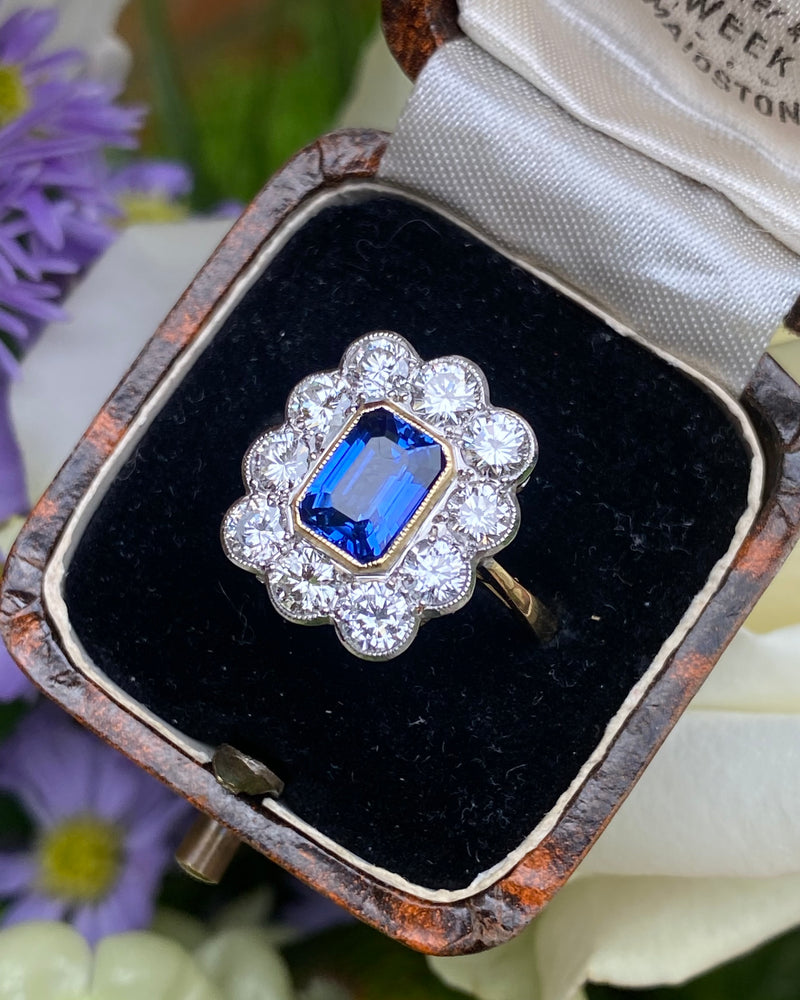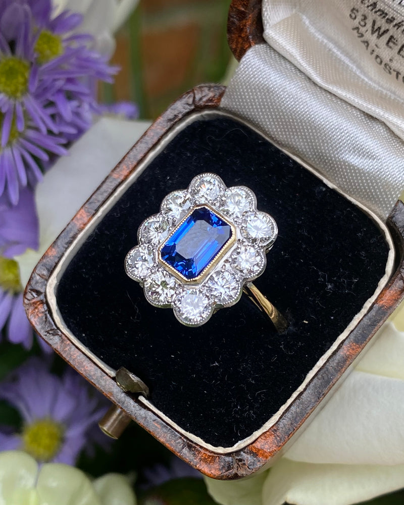 A stunning Vintage style Sapphire and Diamond Cluster Ring set in 18ct Yellow Gold. The beautiful rich luxurious blue Sapphire measures 7.5mm x 5.5mm and weighs 1.50ct and is of exceptional colour and clarity. The Sapphire is Emerald Cut and set in a rub over setting. It is complimented beautifully by the twelve surrounding Pave set Brilliant Cut Diamonds with a total diamond weight of 1.60ct. The Diamonds are bright stones with no marks visible to the naked eye, H/I colour, VS/SI clarity and sparkle beautifully. This really is a gorgeous ring!