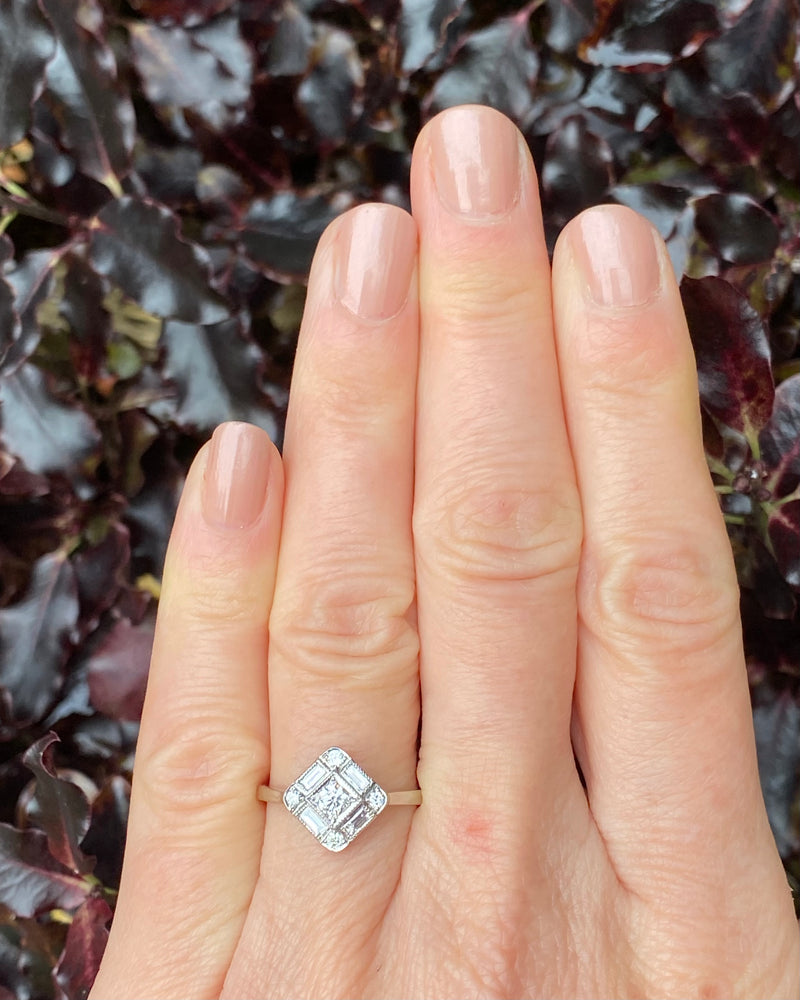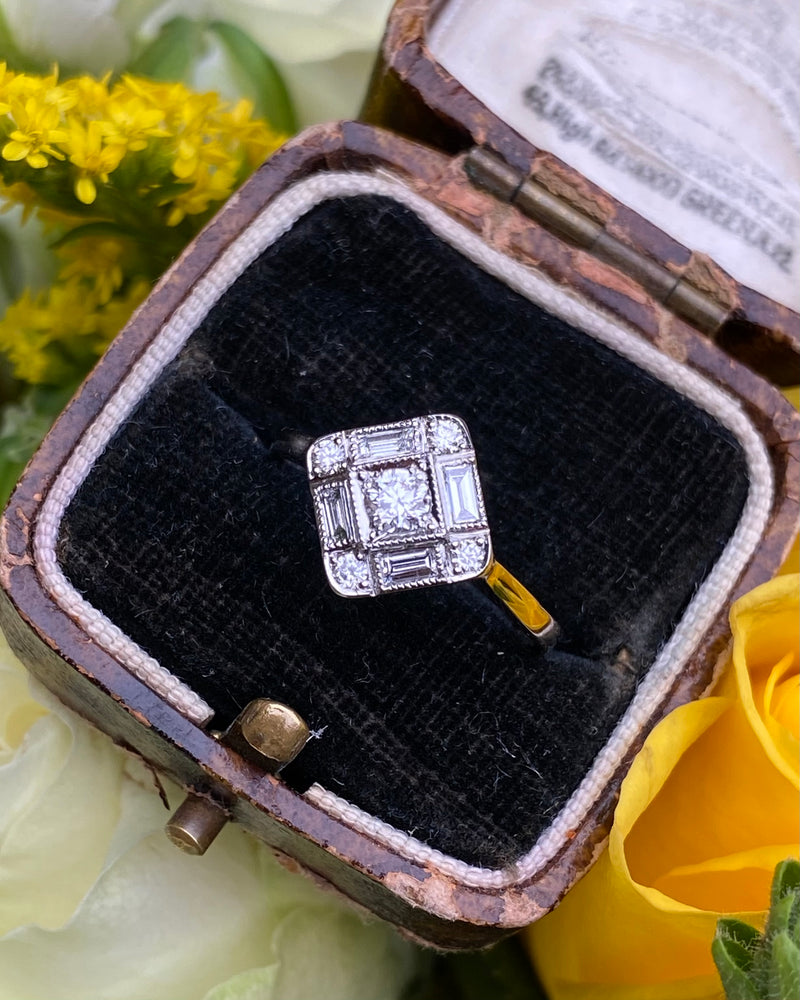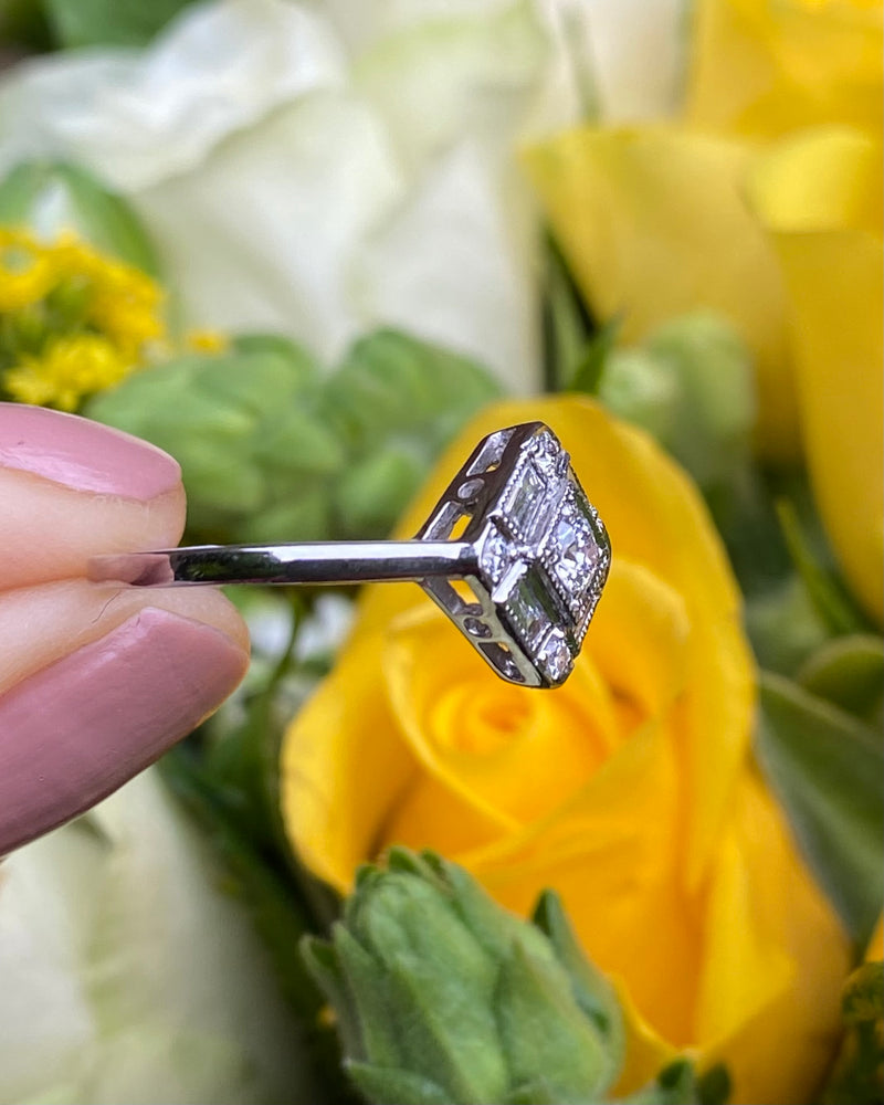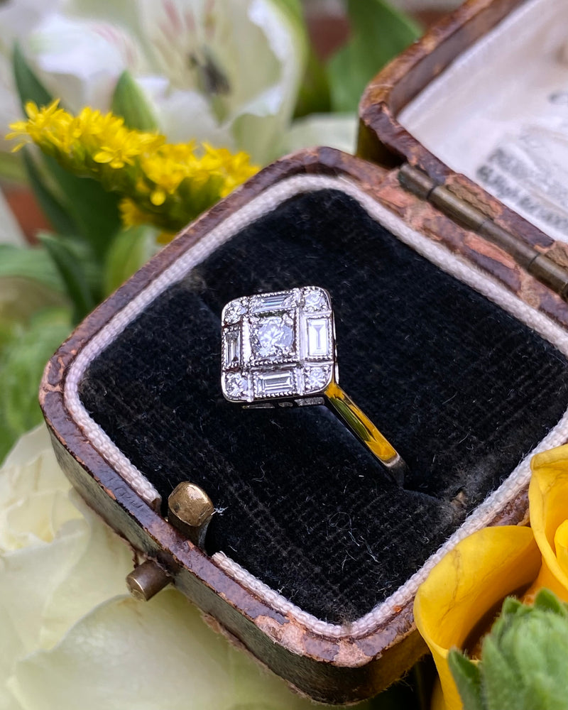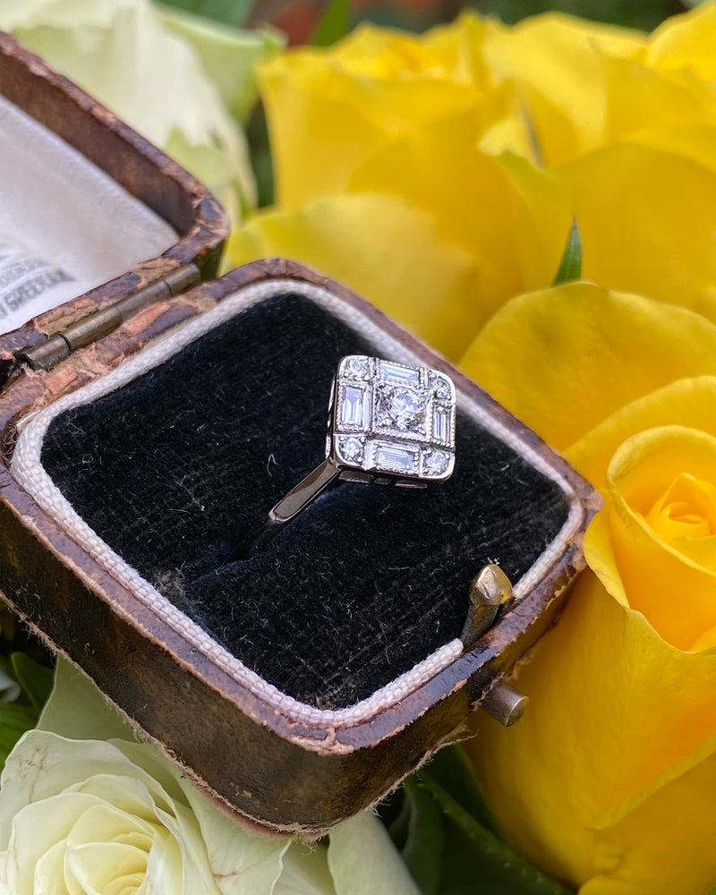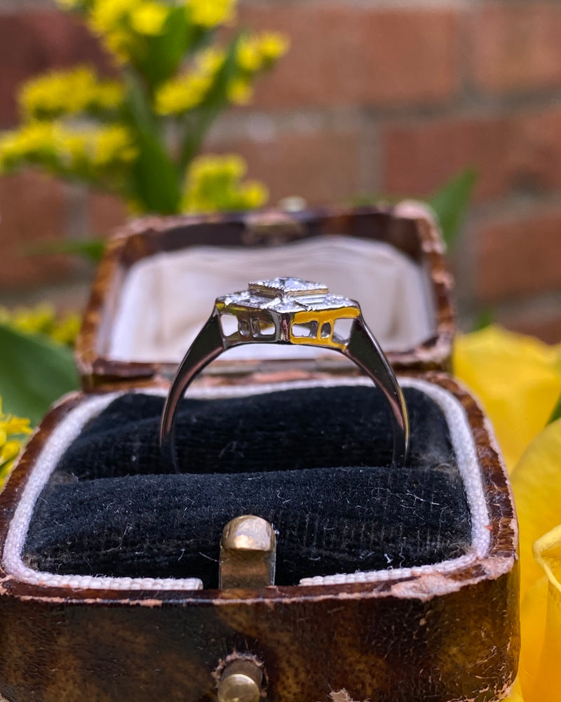 This is a lovely Art Deco style Diamond Ring consisting of a mixture of sparkling and bright Brilliant Cut Diamonds and Baguette Cut Diamonds. The four Baguette Diamonds are set in a Rubover setting with the Brilliant Cut Diamonds being Pave Set. This is a lovely ring and sits nice and low when worn. All Diamonds are a bright and eye catching H/I colour and VS/SI clarity and weigh a total of 0.50ct in Diamond weight. The setting is finished with a fine Milgrain edging. A perfect any excuse kind of ring, set entirely in high quality Platinum.