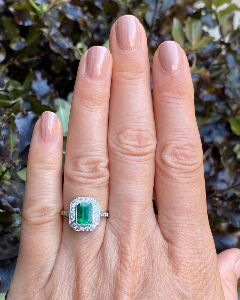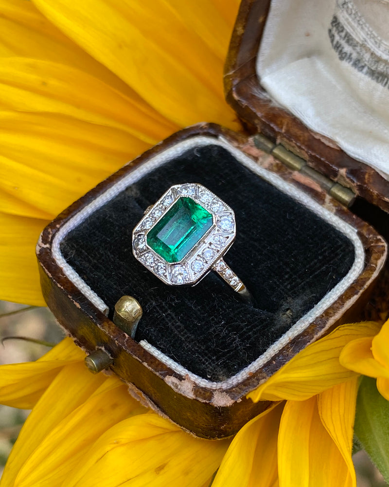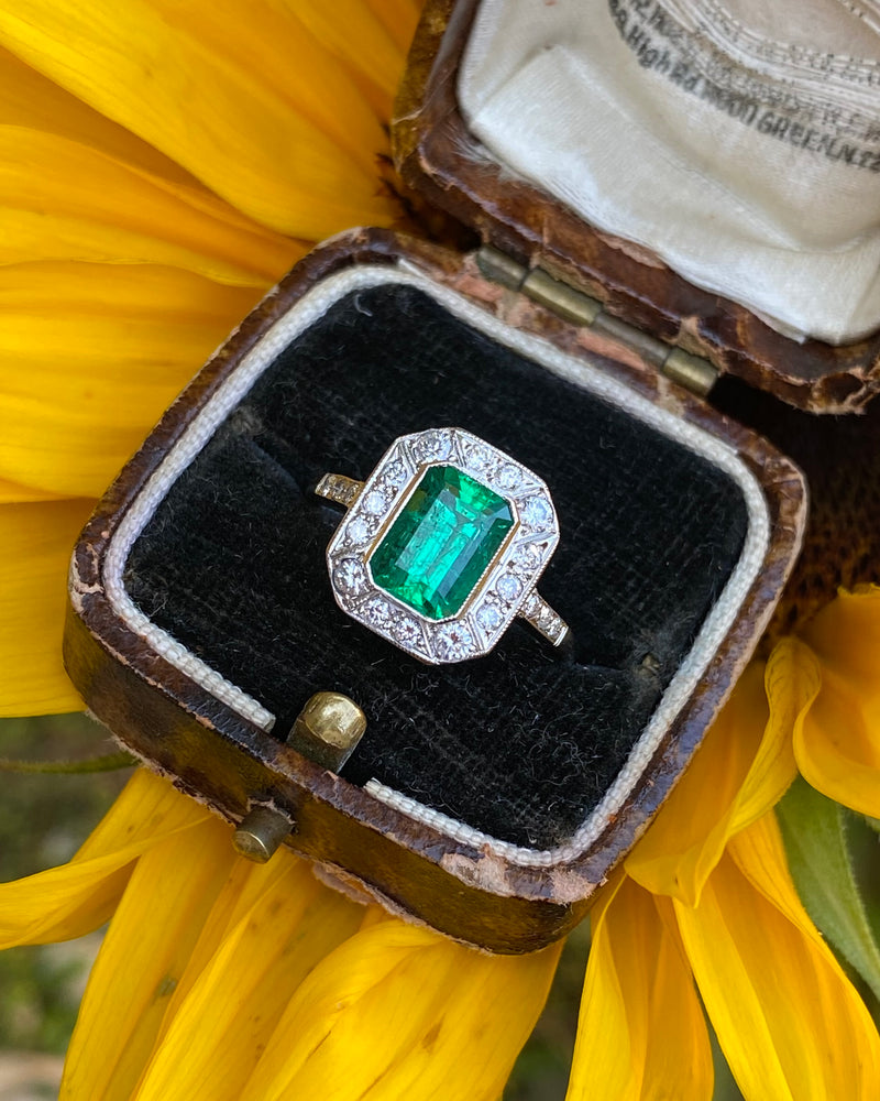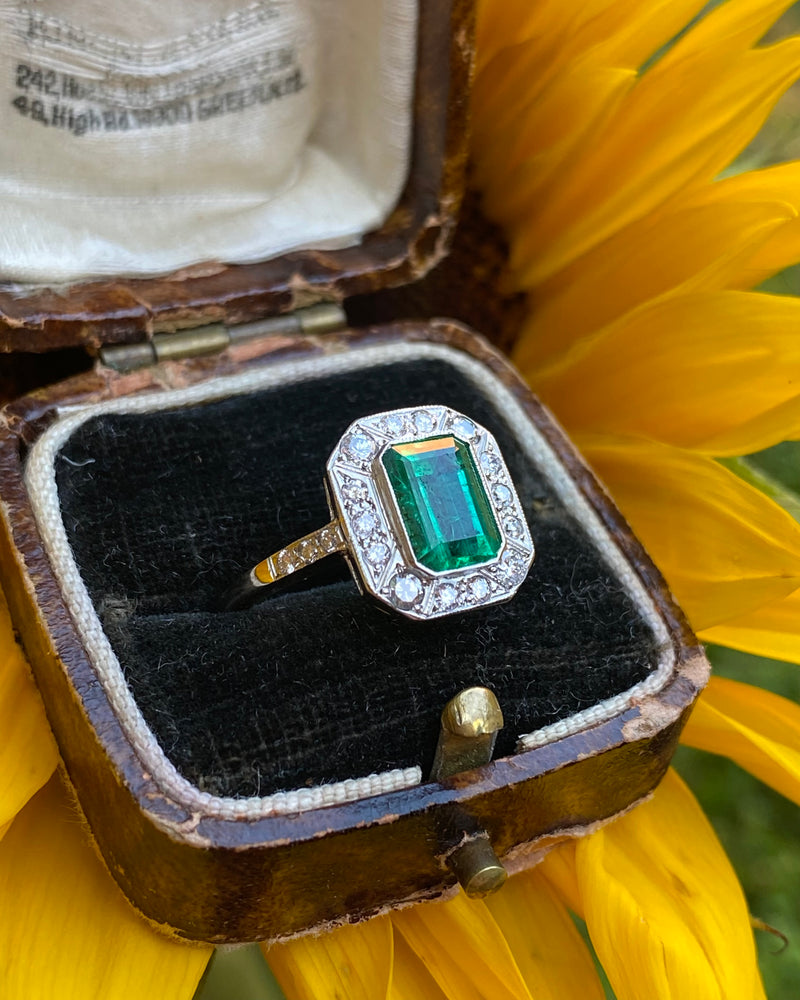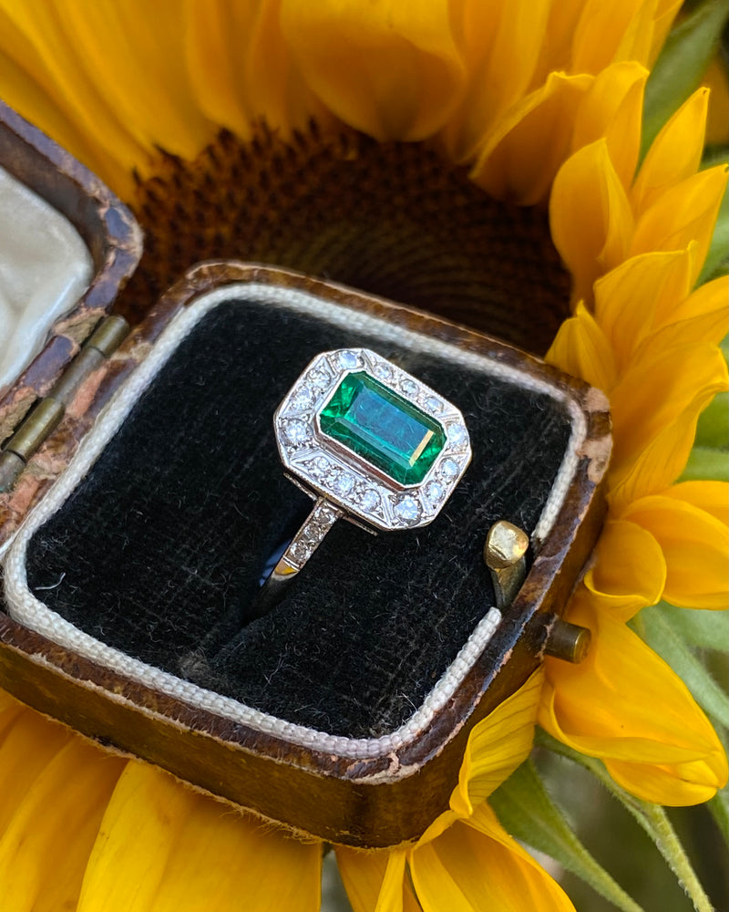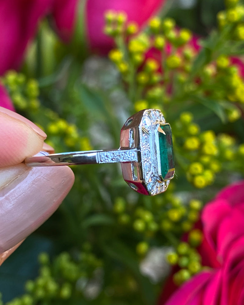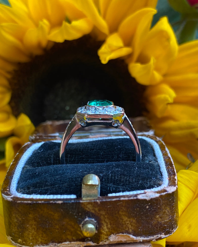 Art Deco Emerald and Diamond Cluster Ring Platinum 0.45ct + 1.45ct