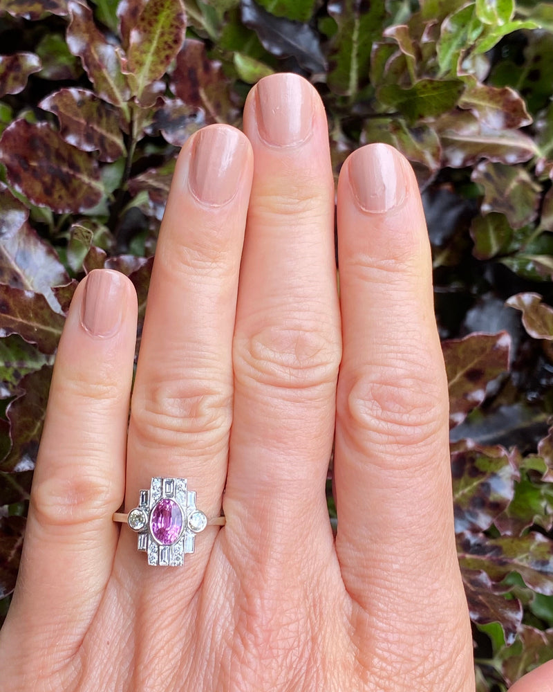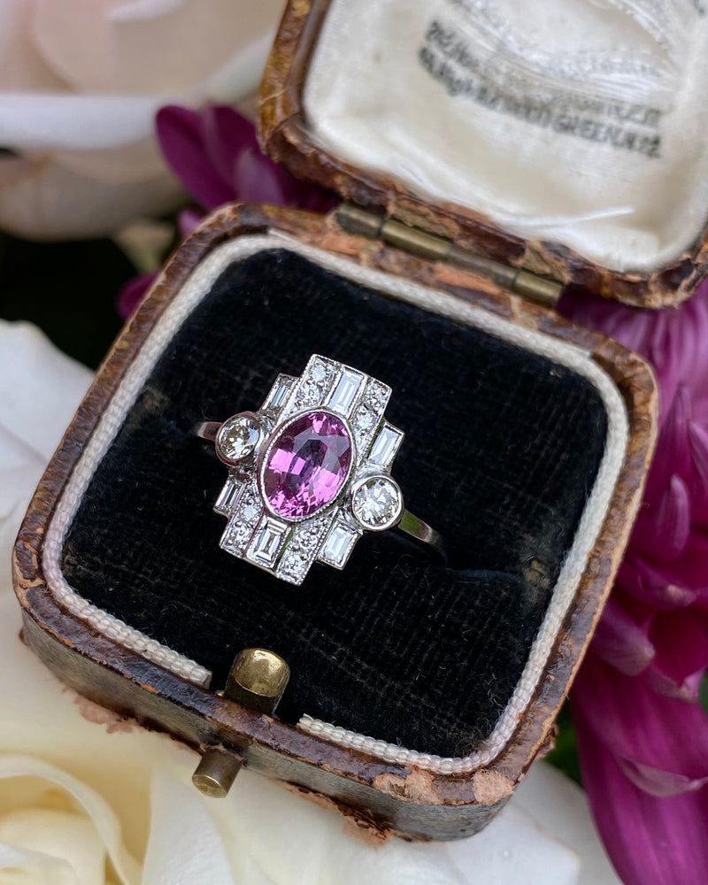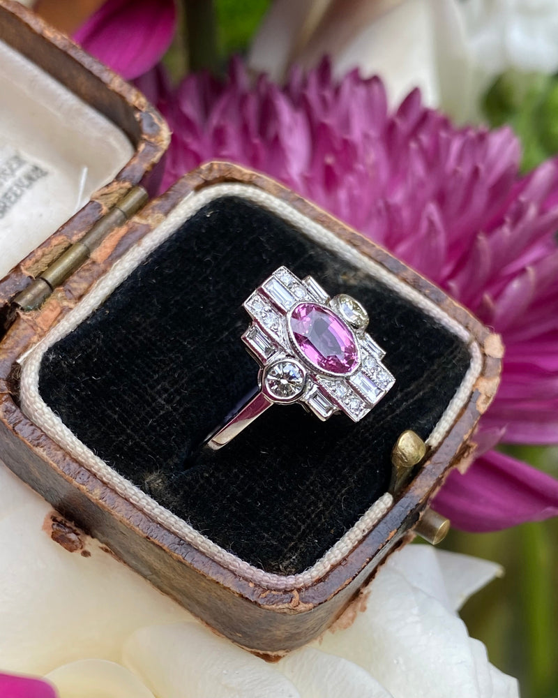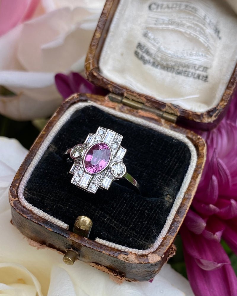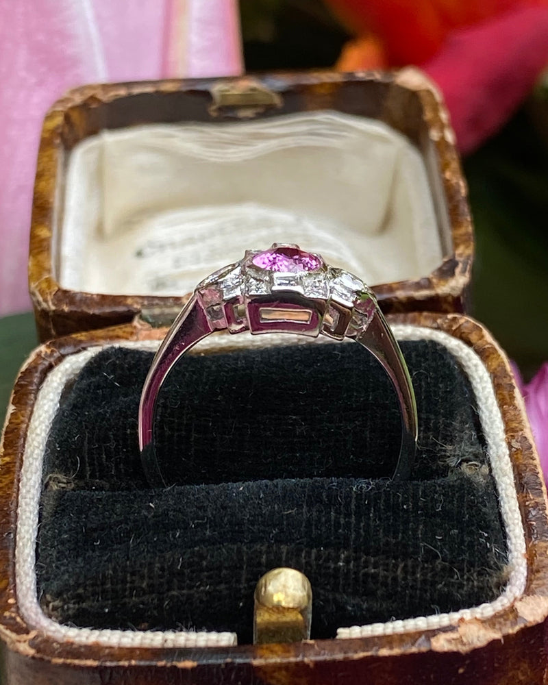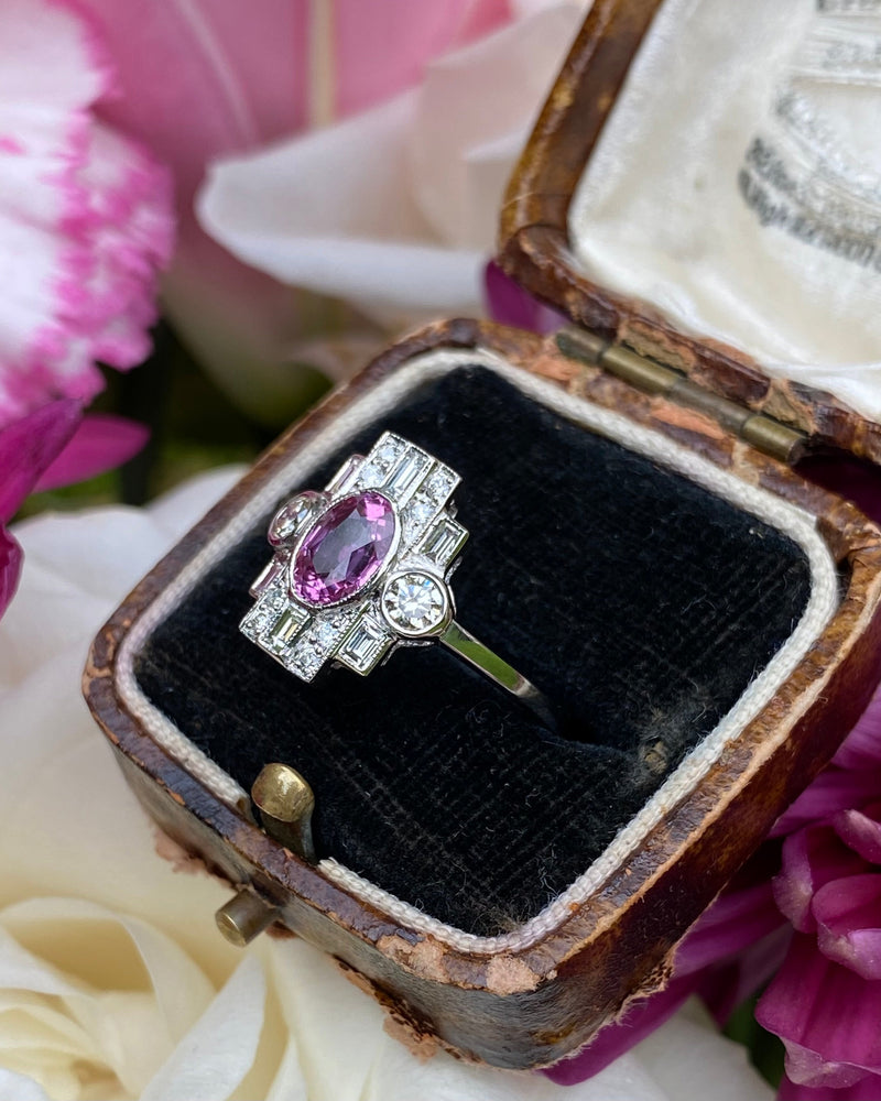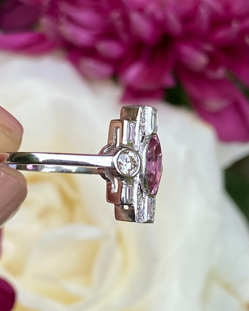 Art Deco Pink Sapphire & Diamond Platinum Ring 0.65ct + 1.05ct