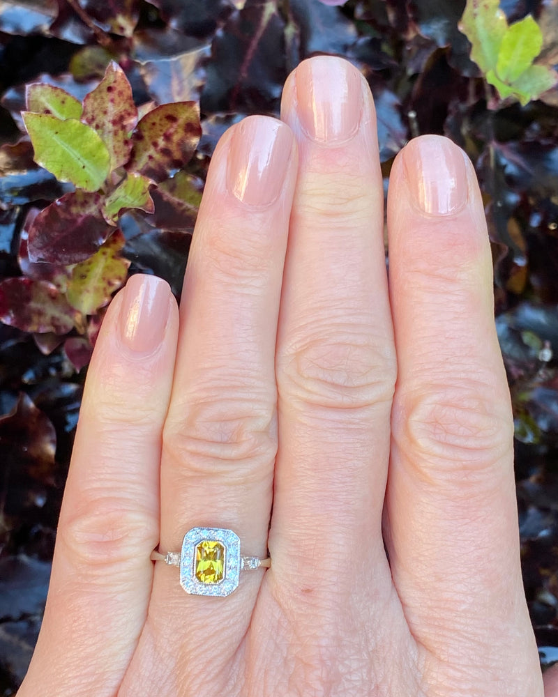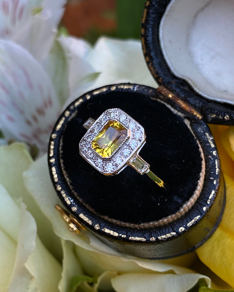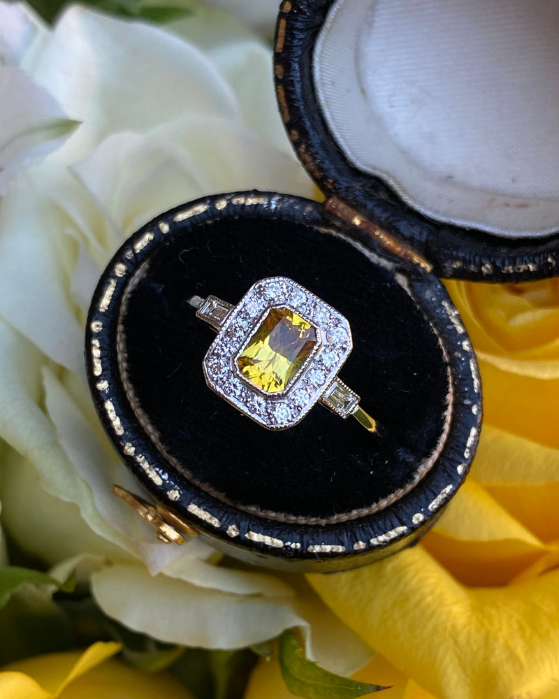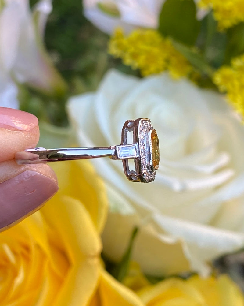 A gorgeous Art Deco style Yellow Sapphire and Diamond ring. The ring is an Octagonal shape with Baguette Cut Diamonds set horizontally either side of the Sapphire, giving that classic Art Deco look of mixed setting and stone cut styles. The Yellow Sapphire is very good quality, clean and a highly saturated sunshine yellow colour and measuring 6mm x 4mm, with a weight of 0.75ct. The surrounding Diamonds are Brilliant Cut and are pave set. The Diamonds weigh 0.25ct and are a bright H/I colour and VS/SI clarity. The ring is set entirely in high quality Platinum, and sits nice and low on the finger and is easy to wear - This is a beautiful ring.