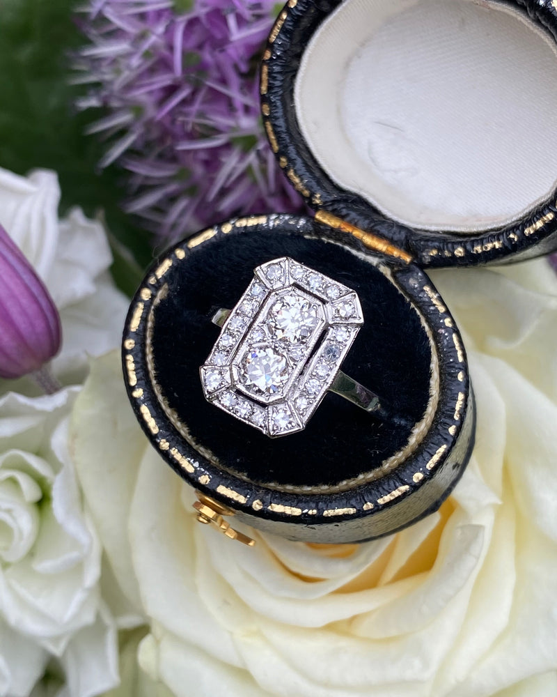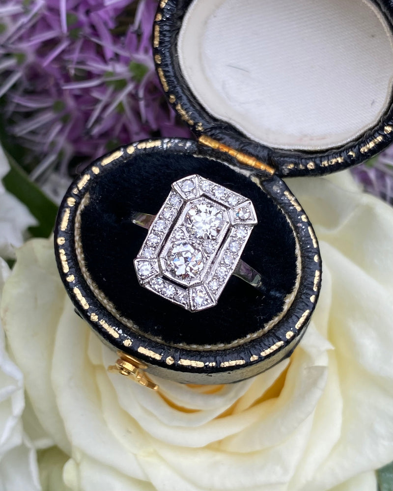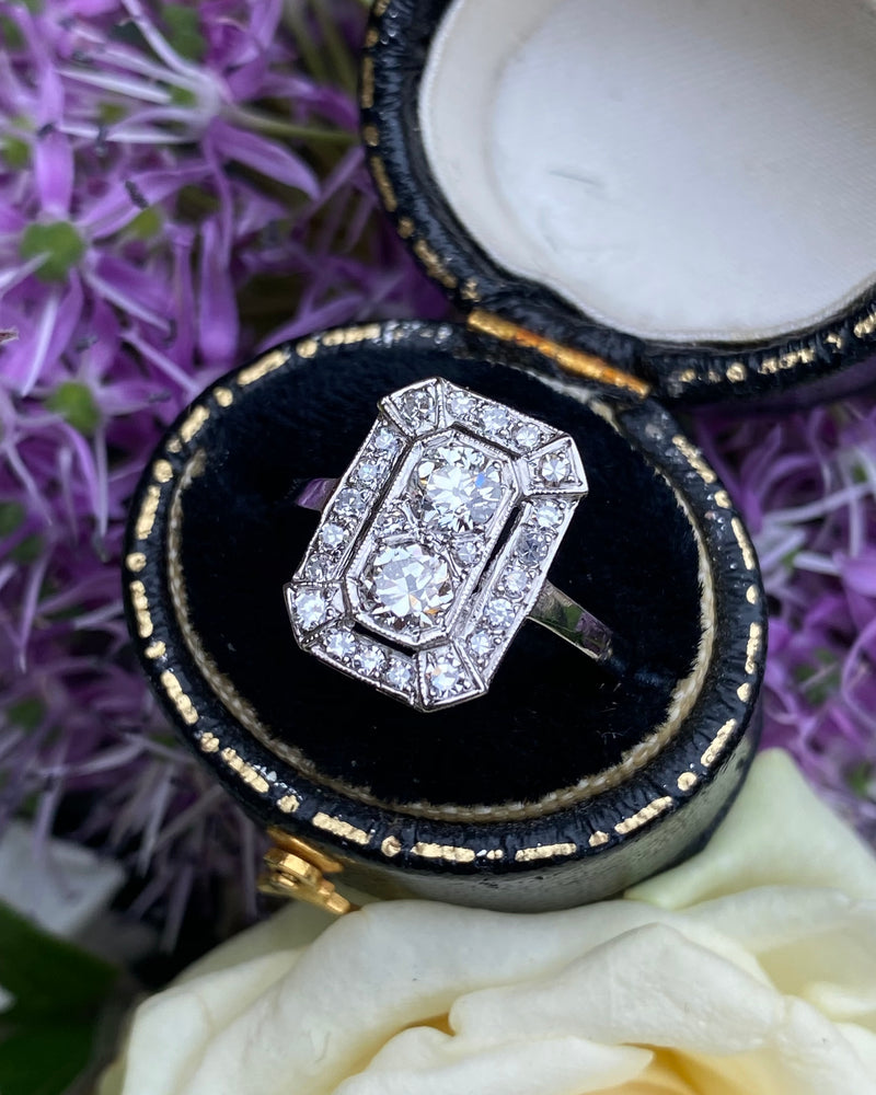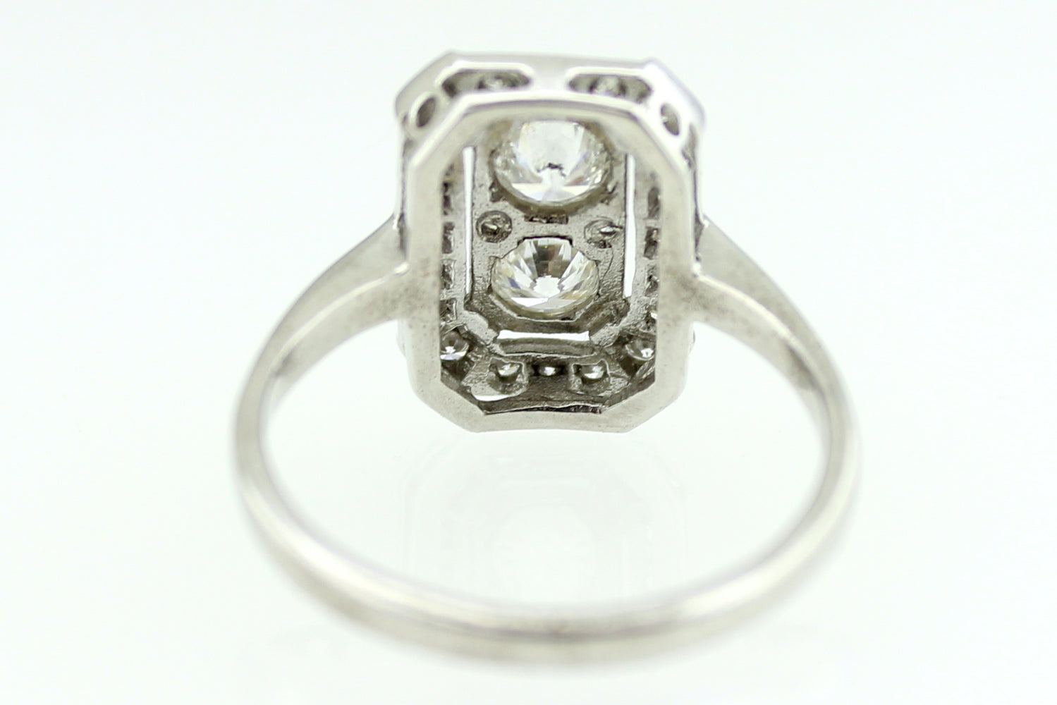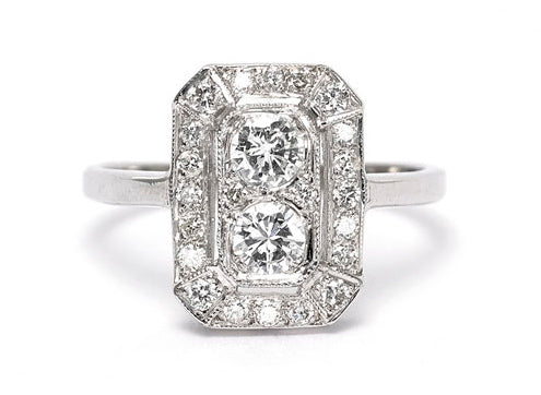 A lovely Art Deco style Diamond Ring with classic geometrical patterns and containing two central Brilliant Cut Diamonds set Pave style each with milgrain edging. The central pierced section is surrounded by numerous Brilliant Cut Diamonds all of a fine colour H/I and clarity VS/SI with a total Diamond weight of 0.85ct. The ring is made entirely in Platinum.