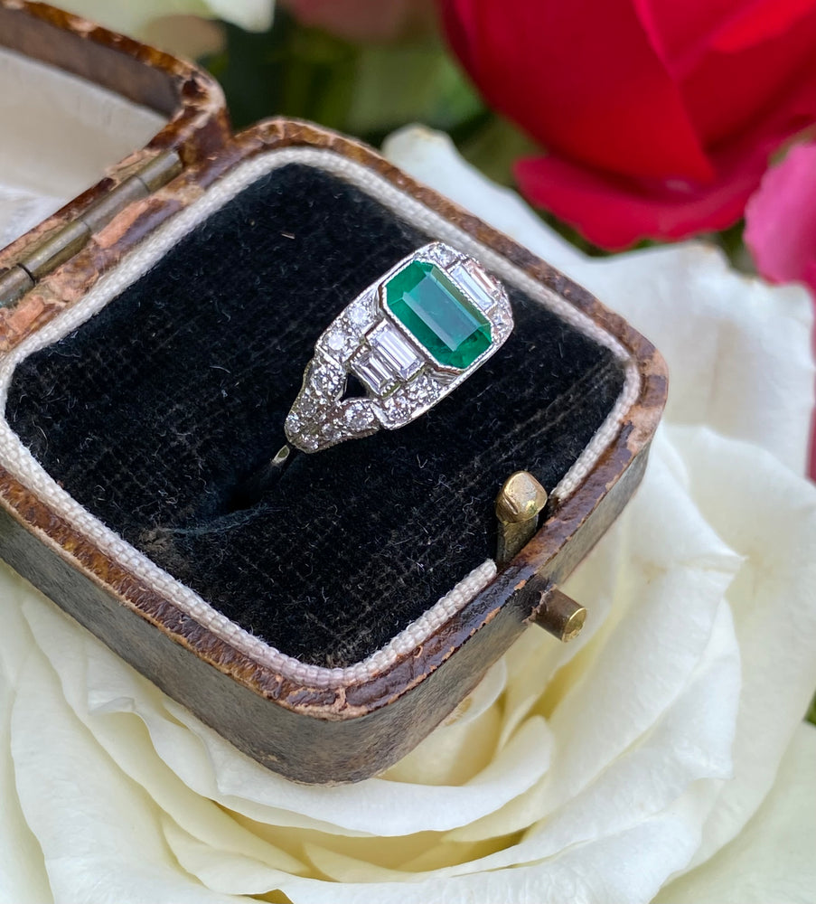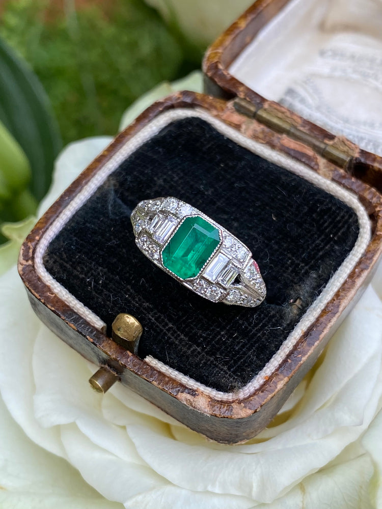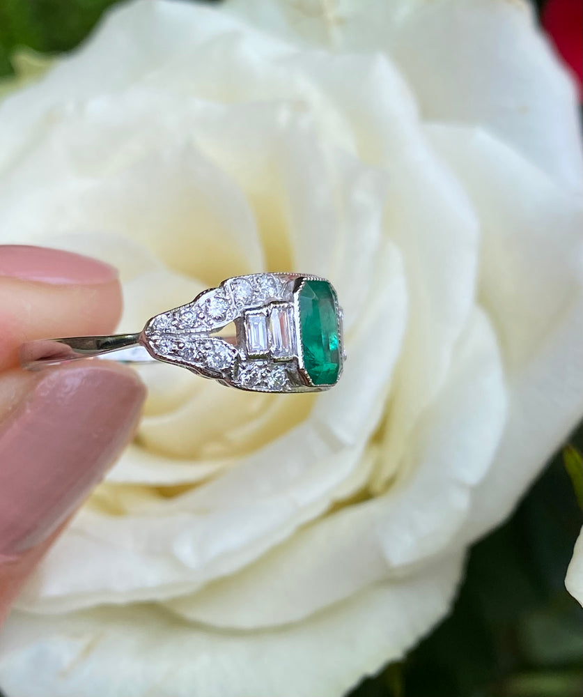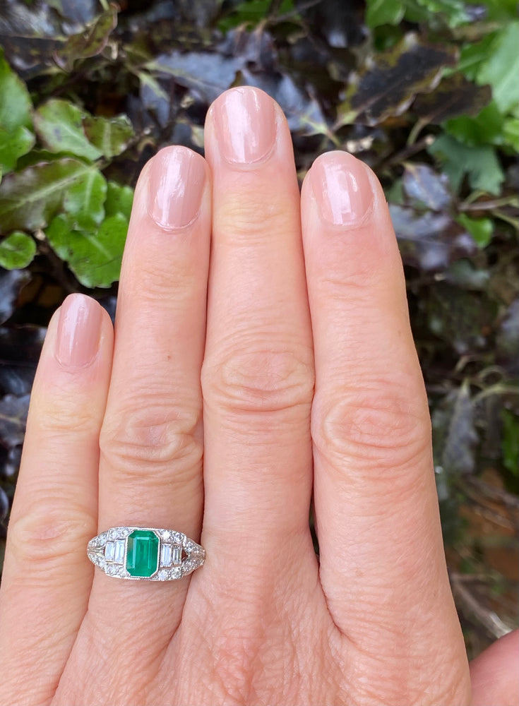 Art Deco Emerald and Diamond Platinum Ring 0.40ct + 0.90ct