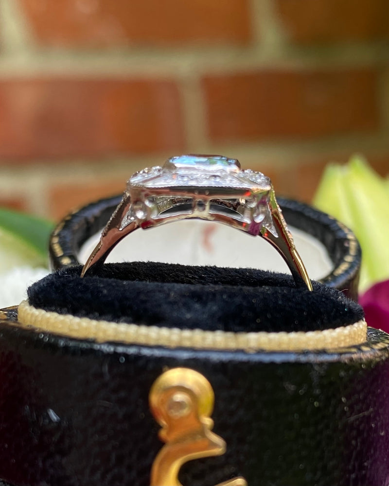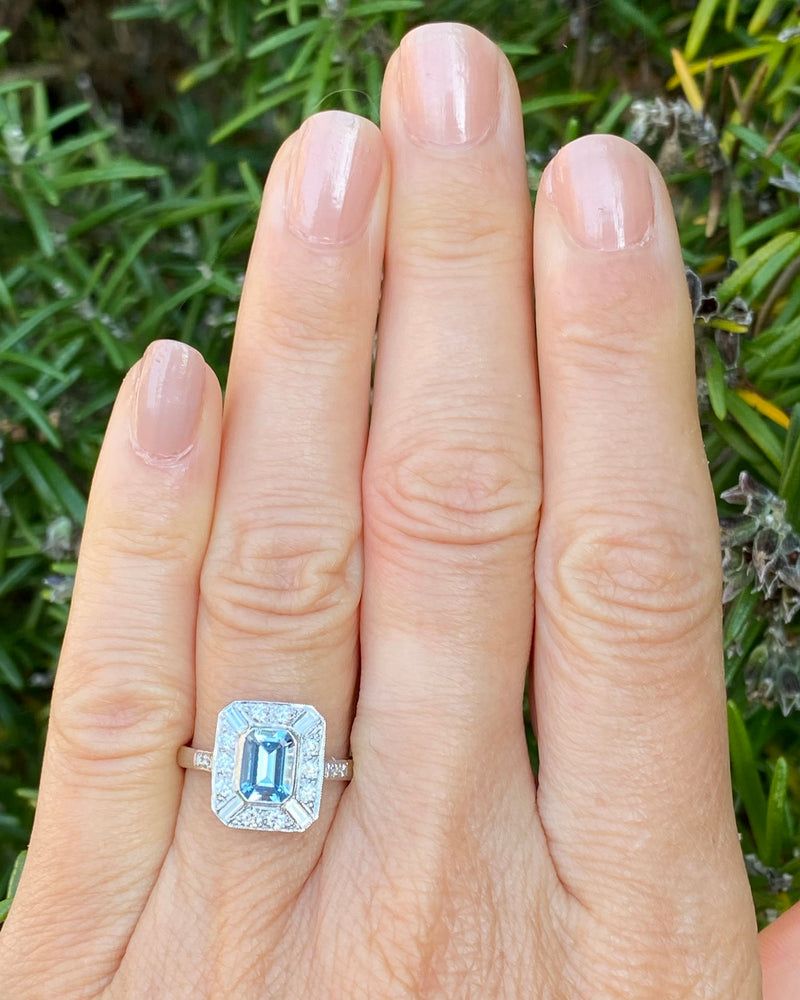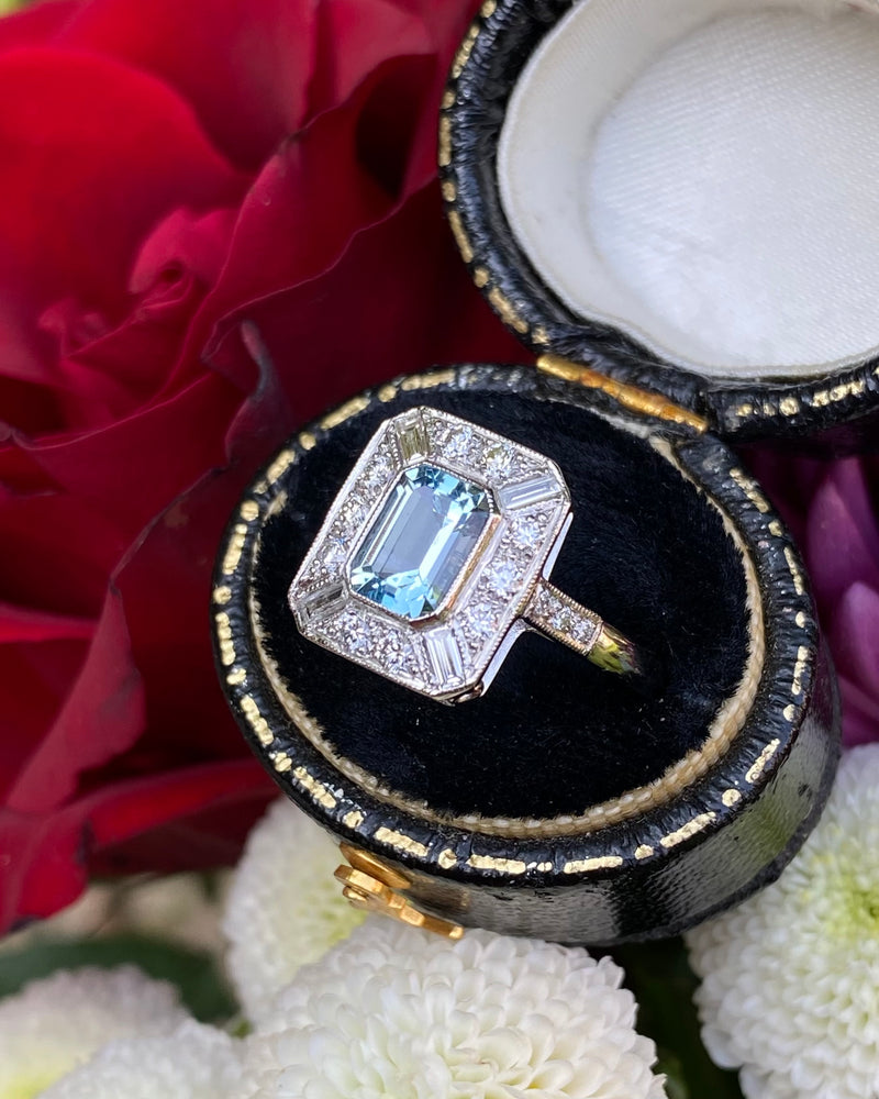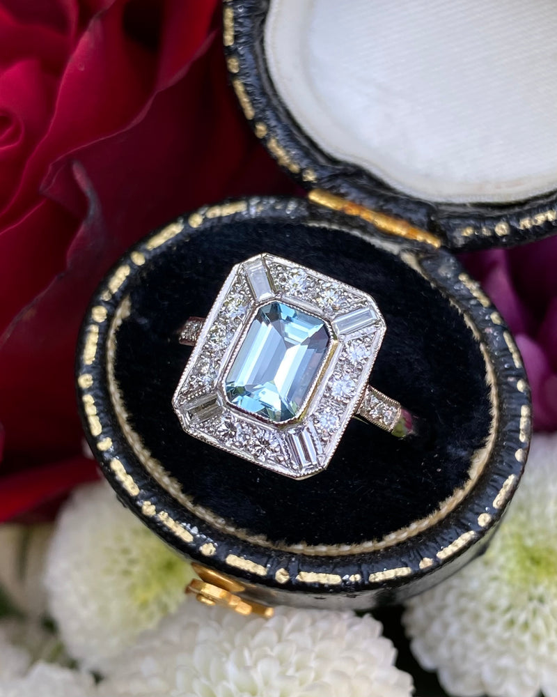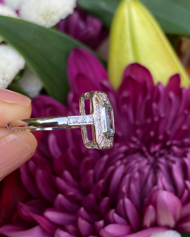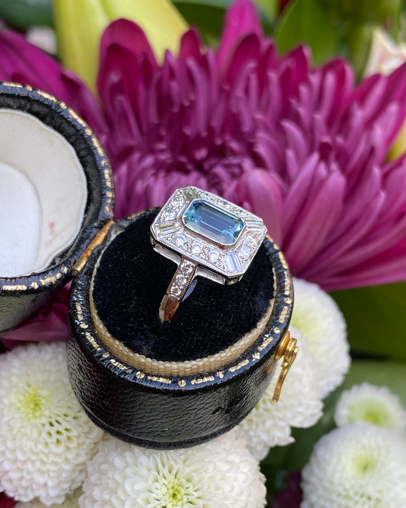 Art Deco Aquamarine and Diamond Platinum Ring 0.55ct + 0.80ct
