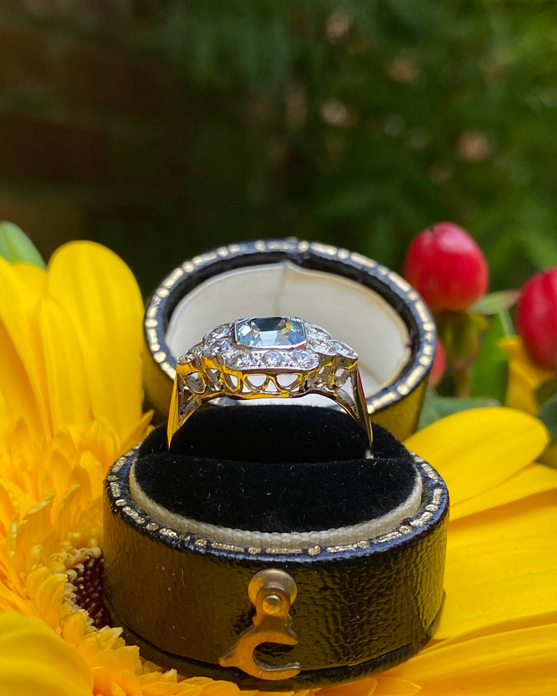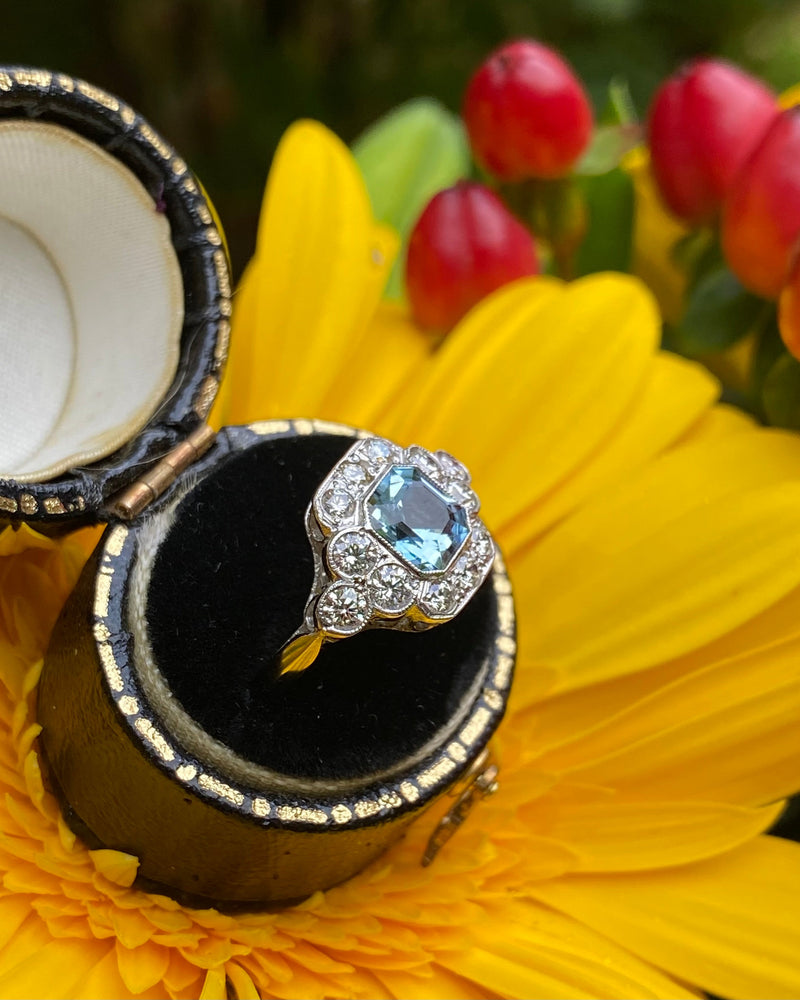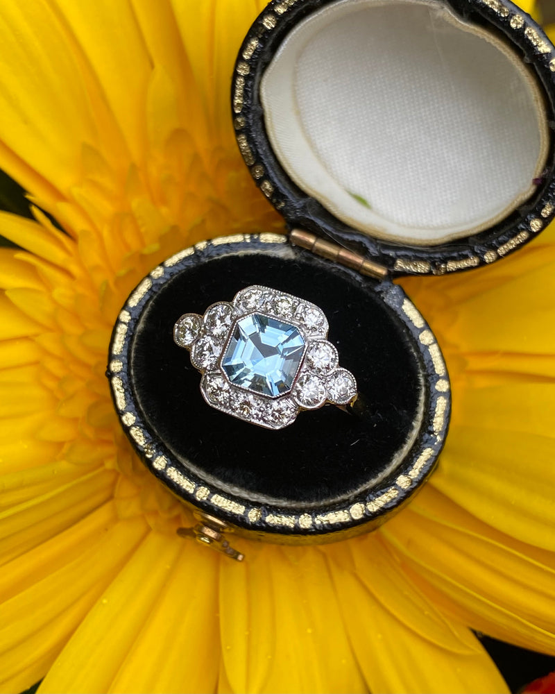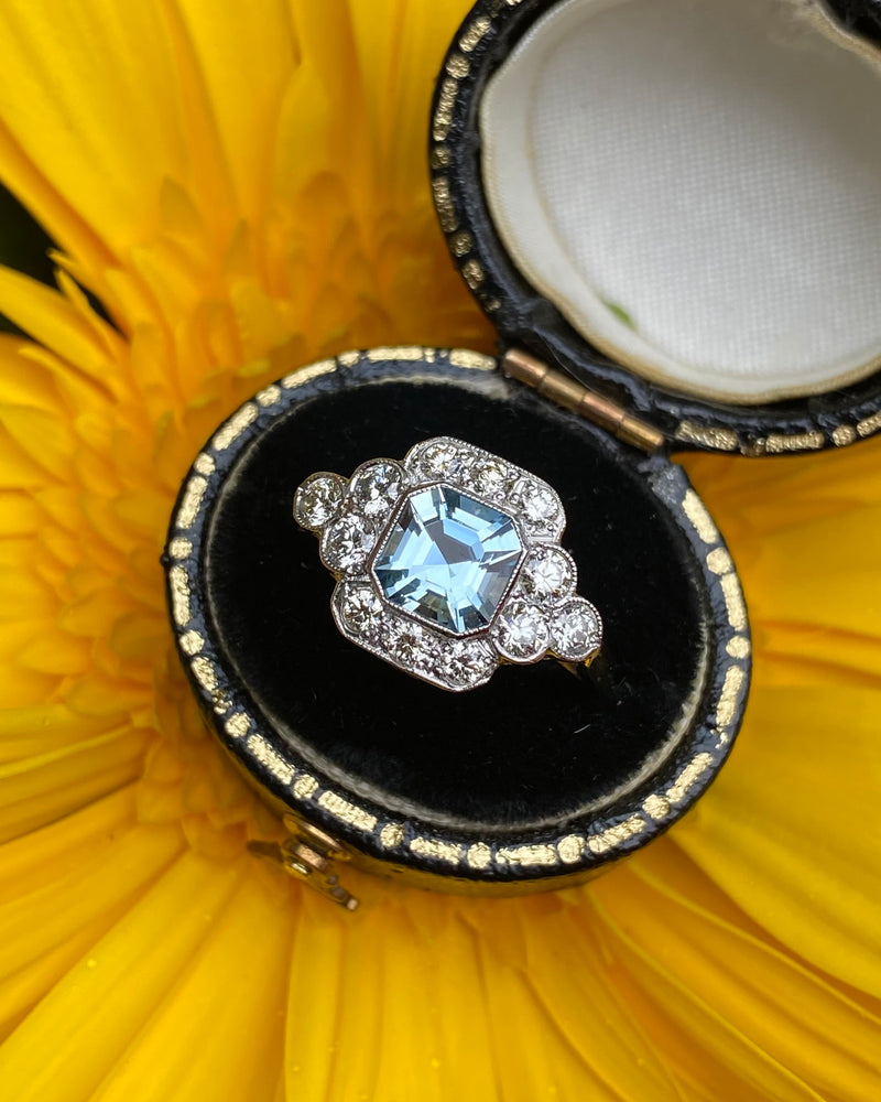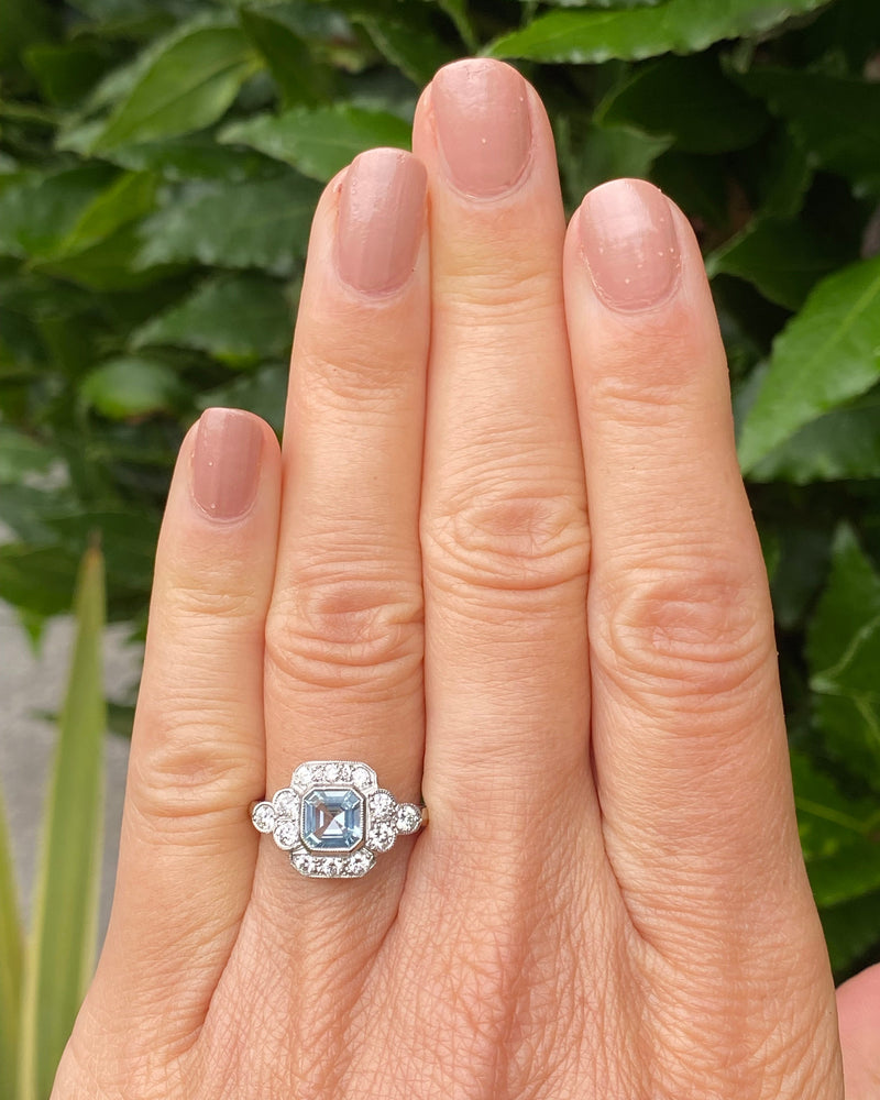 This Art Deco style Aquamarine and Diamond ring is unique and sure to catch everyone’s eye! Set entirely in high quality, heavy Platinum. The central Aquamarine weighs 0.80ct and is a lovely Square Cut shape measuring 5mm x 5mm. It is a gorgeous cool blue colour and is set in a rub over setting showing off the stone to full effect. The surrounding Brilliant Cut Diamonds are pave set in an octagon with three slightly larger Diamonds on either side. The total Diamond weight is 0.55ct. The Brilliant Cut Diamonds are bright and full of life, H/I colour, VS/SI clarity. The ring sits nice and low on the finger and is easy to wear. This is a lovely ring!