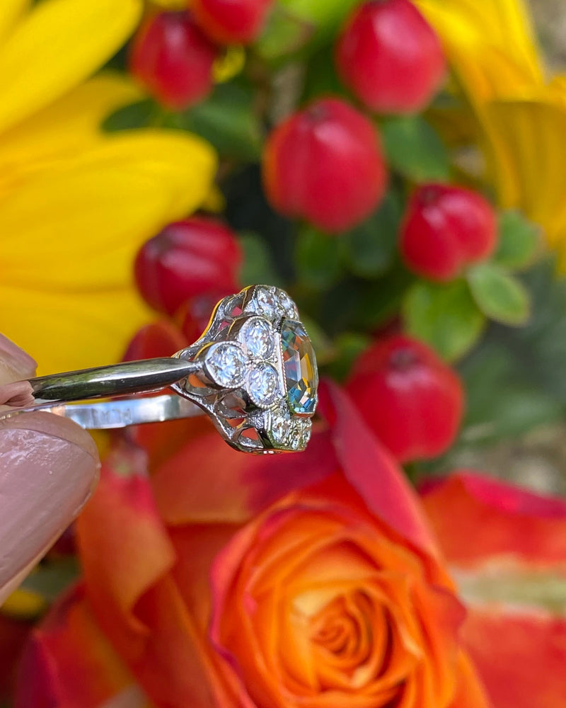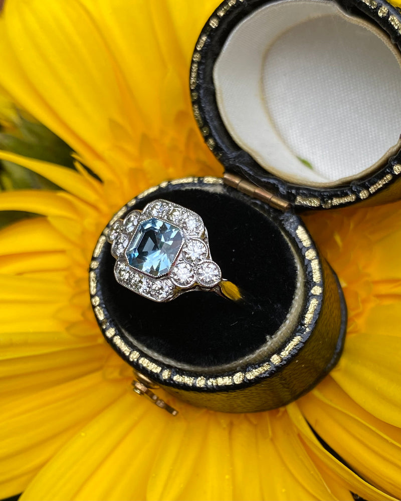 Art Deco Aquamarine & Diamond Platinum Ring 0.55ct + 0.80ct