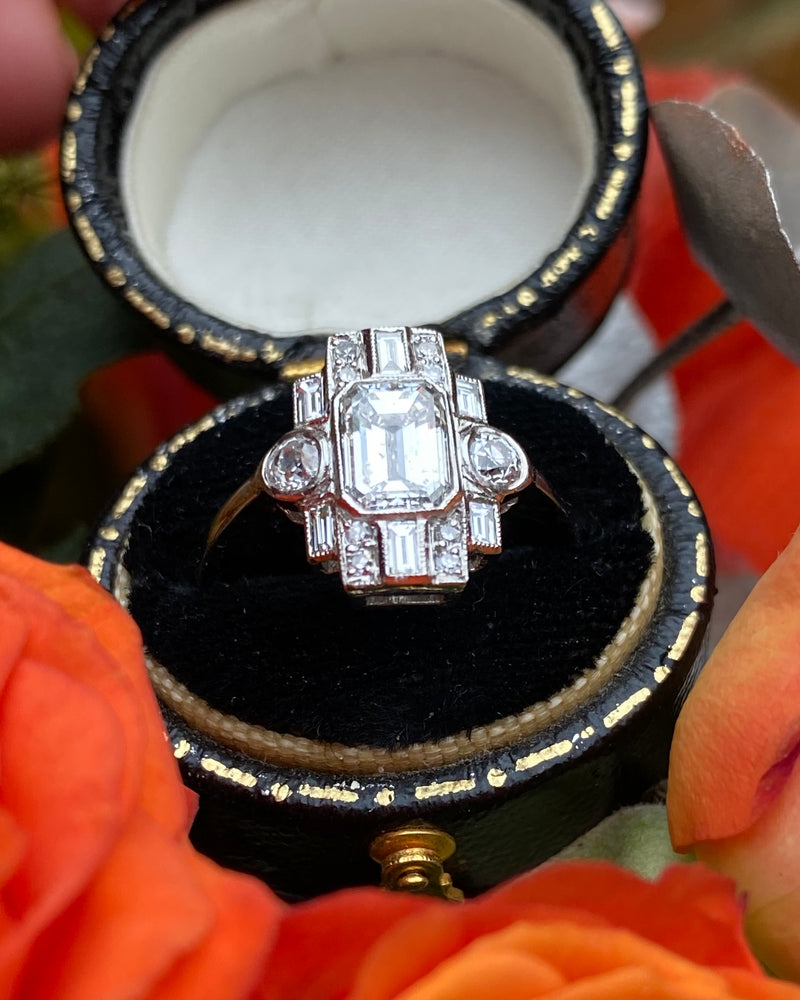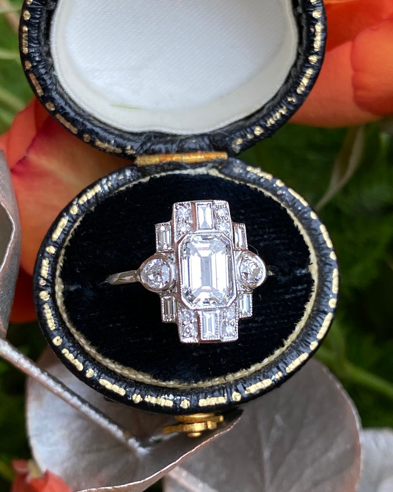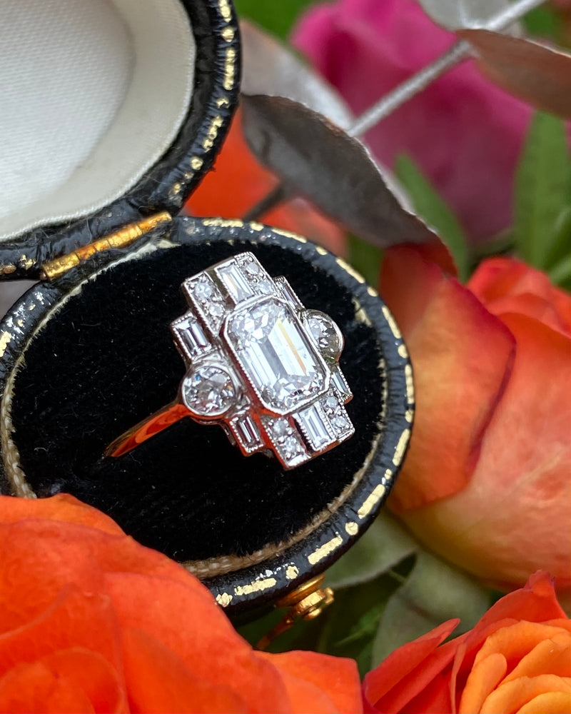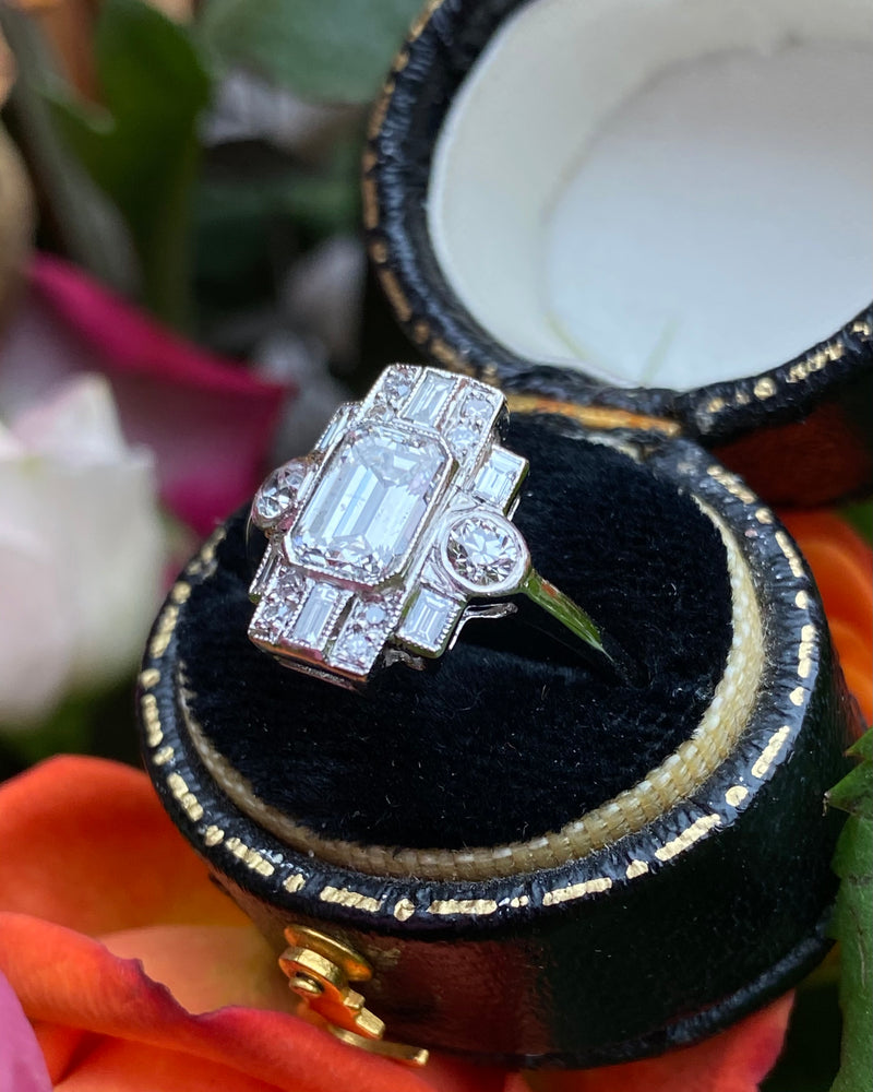 Quite simply an amazing Art Deco style Diamond ring! The ring contains a Central Emerald Cut Diamond which is rubover set, with great colour and clarity approximately J colour, VS2 clarity and weighing 1.07ct. Surrounding the central stone are Round Old Cut Diamonds set in rubover setting either side of the main diamond and 0.55ct of smaller Old Cut, Pave and Rubover Set, Diamonds and Baguette Cut Diamonds interspersed around the ring! All of H colour and VS/SI clarity and finished with fine millegrain edging! This is a truly unique ring.