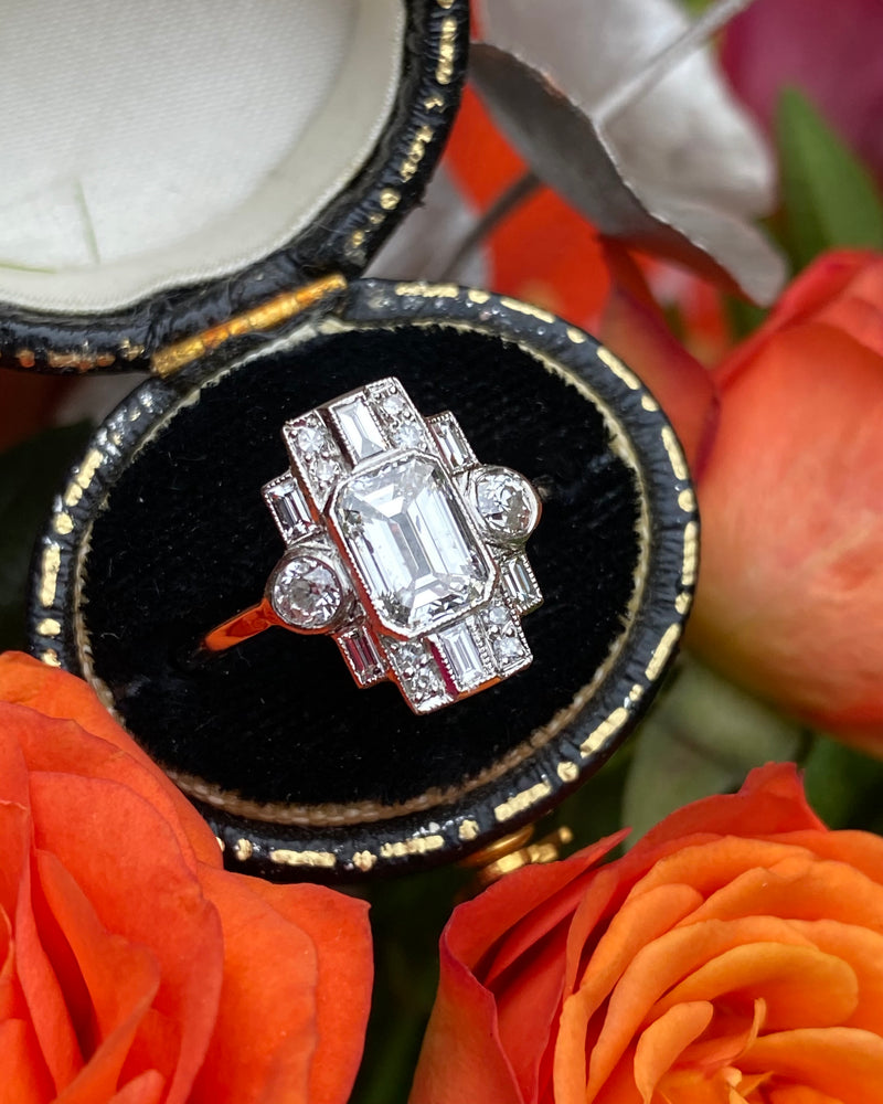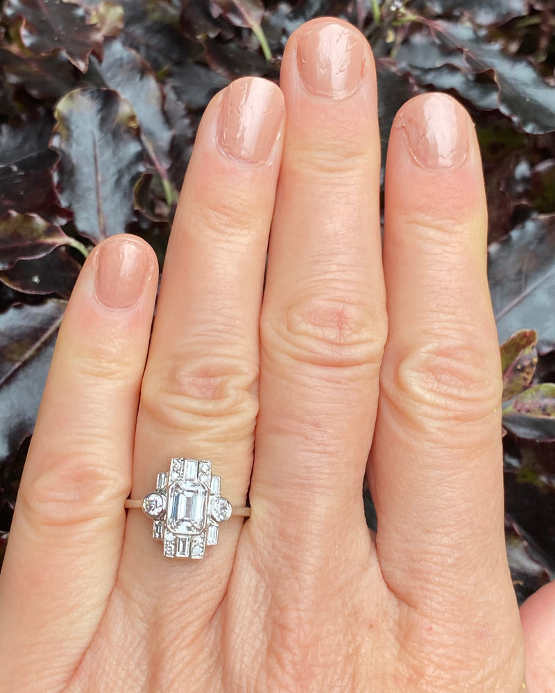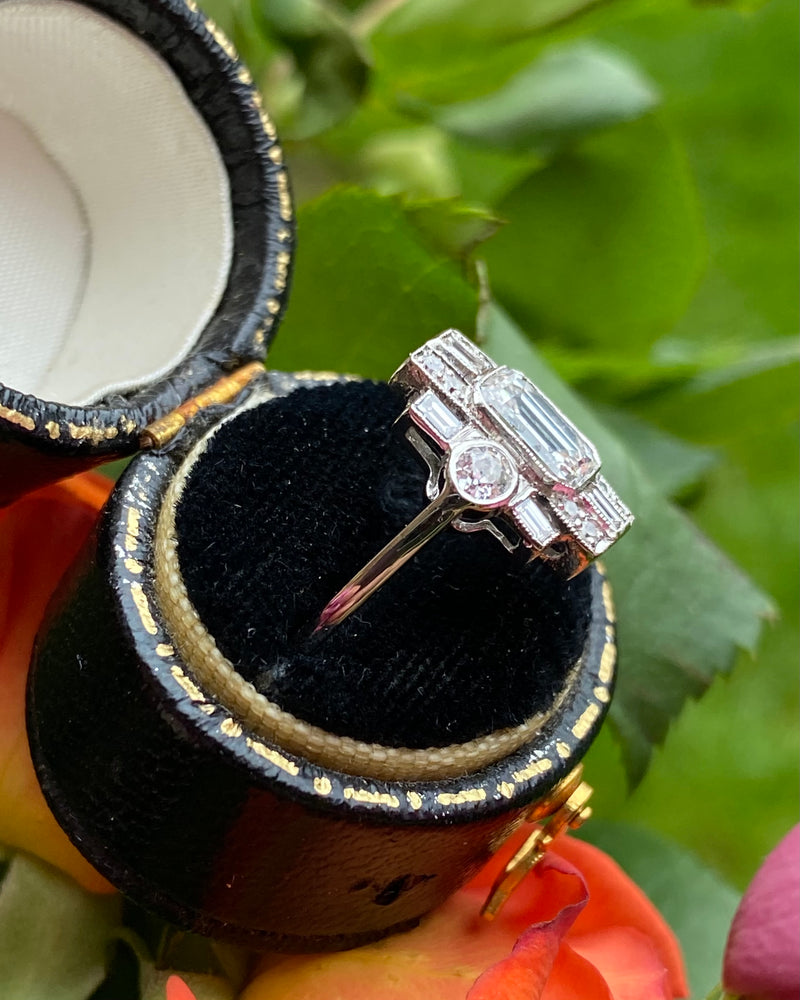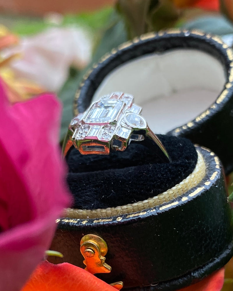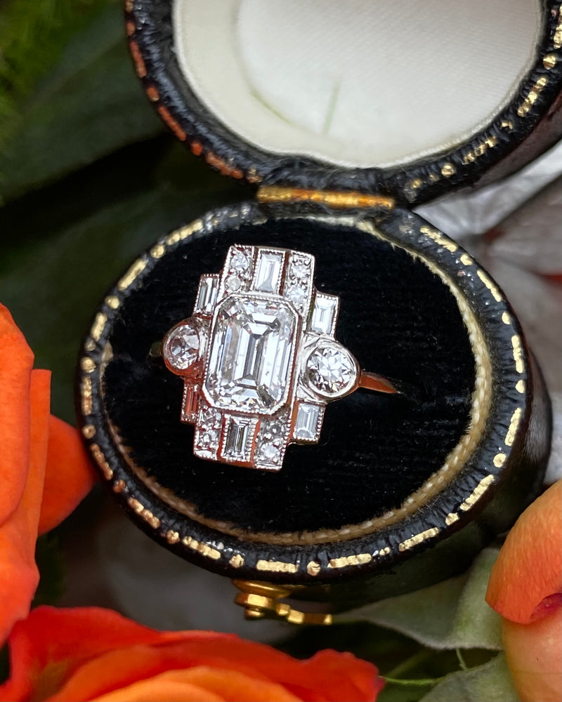 Quite simply an amazing Art Deco style Diamond ring! The ring contains a Central Emerald Cut Diamond which is rubover set, with great colour and clarity approximately J colour, VS2 clarity and weighing 1.07ct. Surrounding the central stone are Round Old Cut Diamonds set in rubover setting either side of the main diamond and 0.55ct of smaller Old Cut, Pave and Rubover Set, Diamonds and Baguette Cut Diamonds interspersed around the ring! All of H colour and VS/SI clarity and finished with fine millegrain edging! This is a truly unique ring.