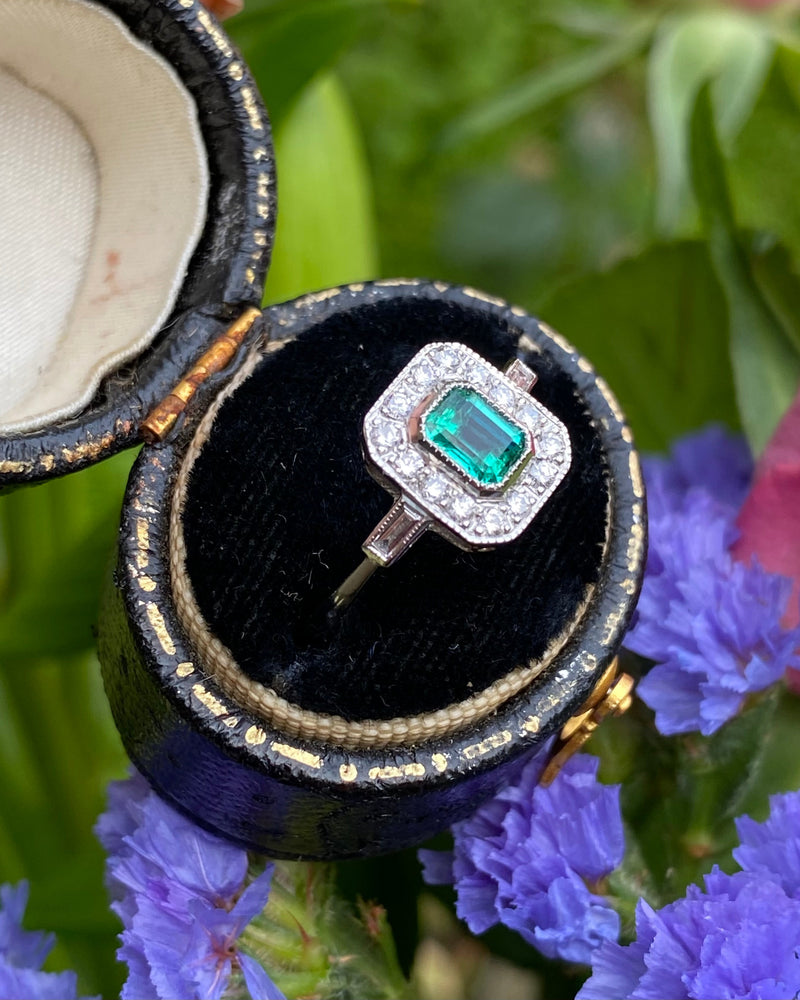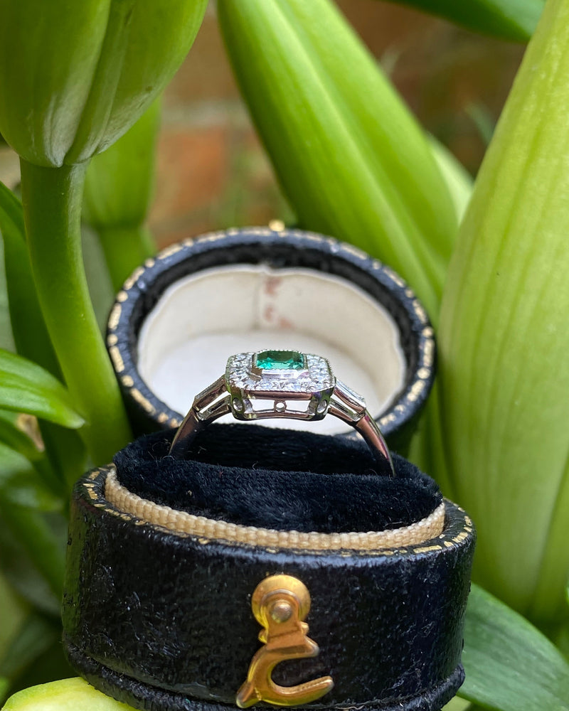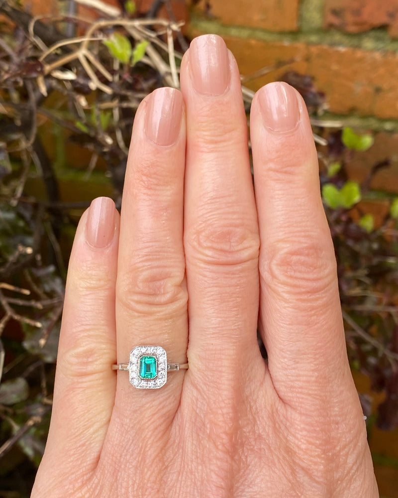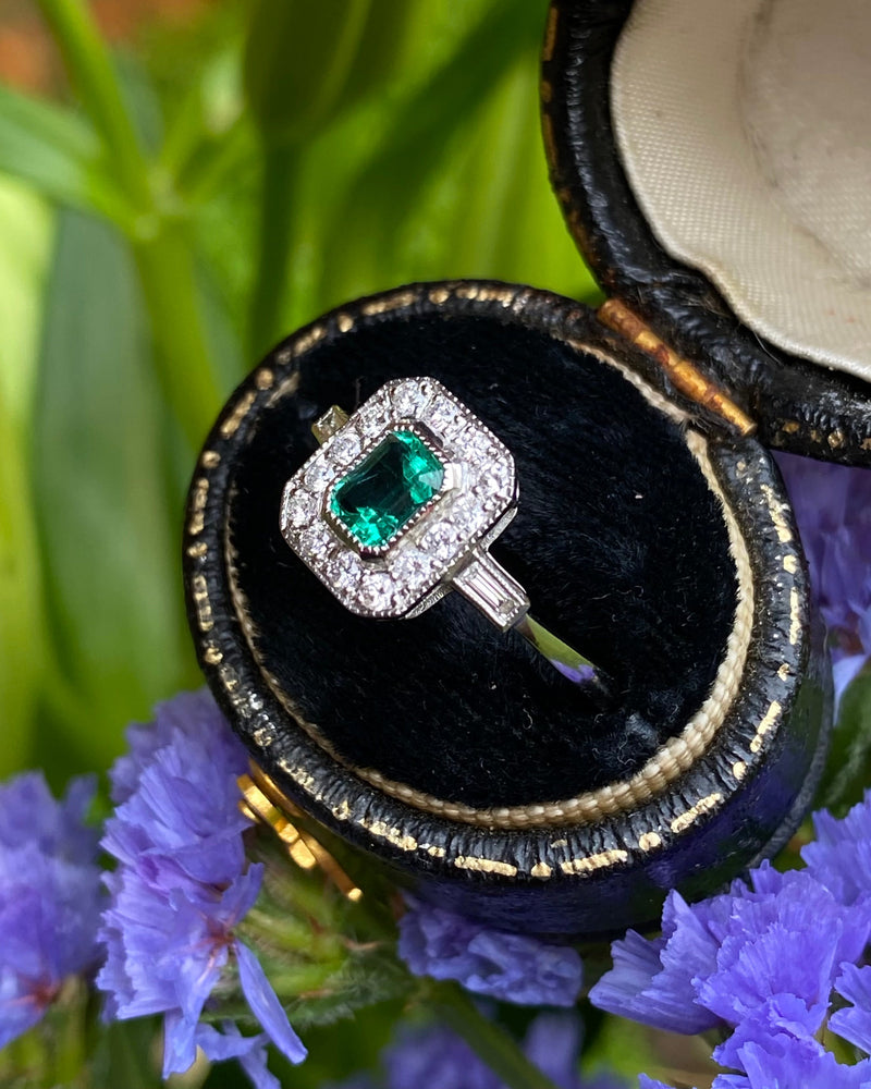 Art Deco Emerald and Diamond Cluster Platinum Ring 0.30ct + 0.50ct
