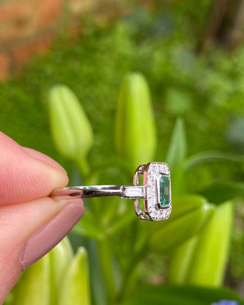 A lovely Art Deco style Emerald and Diamond Platinum Ring! The Central Emerald Cut Emerald is a gorgeous, grassy green colour with good clarity. It measures 6mm x 4mm, weighs 0.50ct and is set in a Rub over setting. This gorgeous Emerald is surrounded by Brilliant Cut Diamonds pave set with two additional horizontal Baguette Cut Diamonds stepping down in size, rub-over set in the shoulders of the ring, bringing the total Diamond weight to 0.30ct. The Diamonds are nice and bright H/I colour and VS/SI clarity and are all finished with fine milgrain edging. The ring sits nice and low on the finger and is easy to wear.