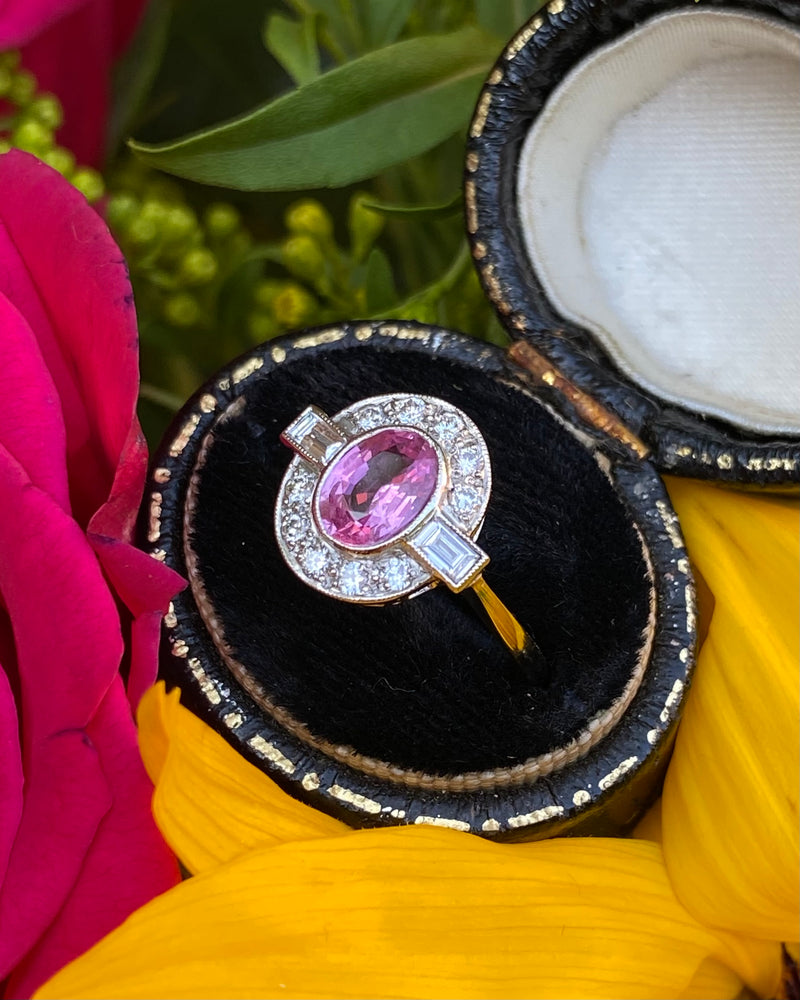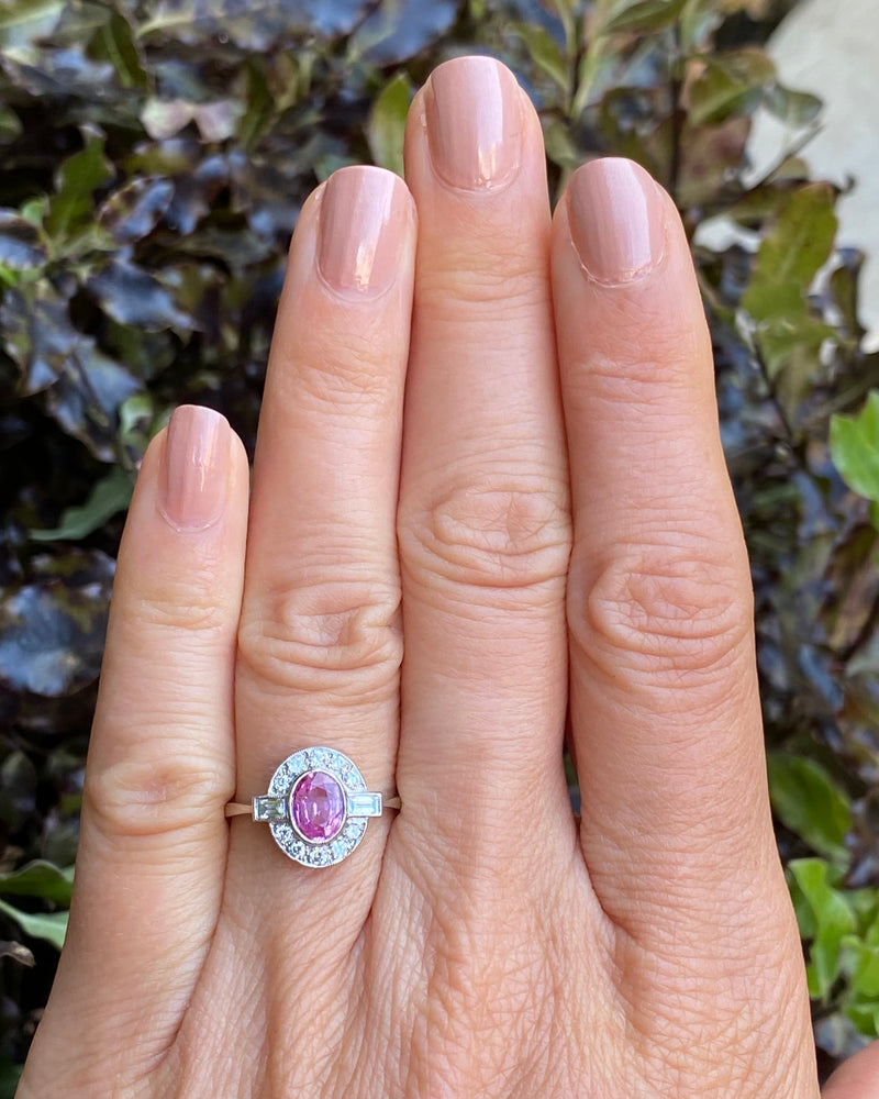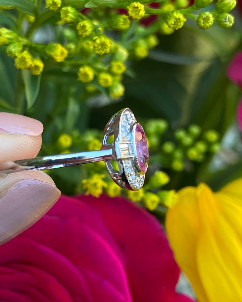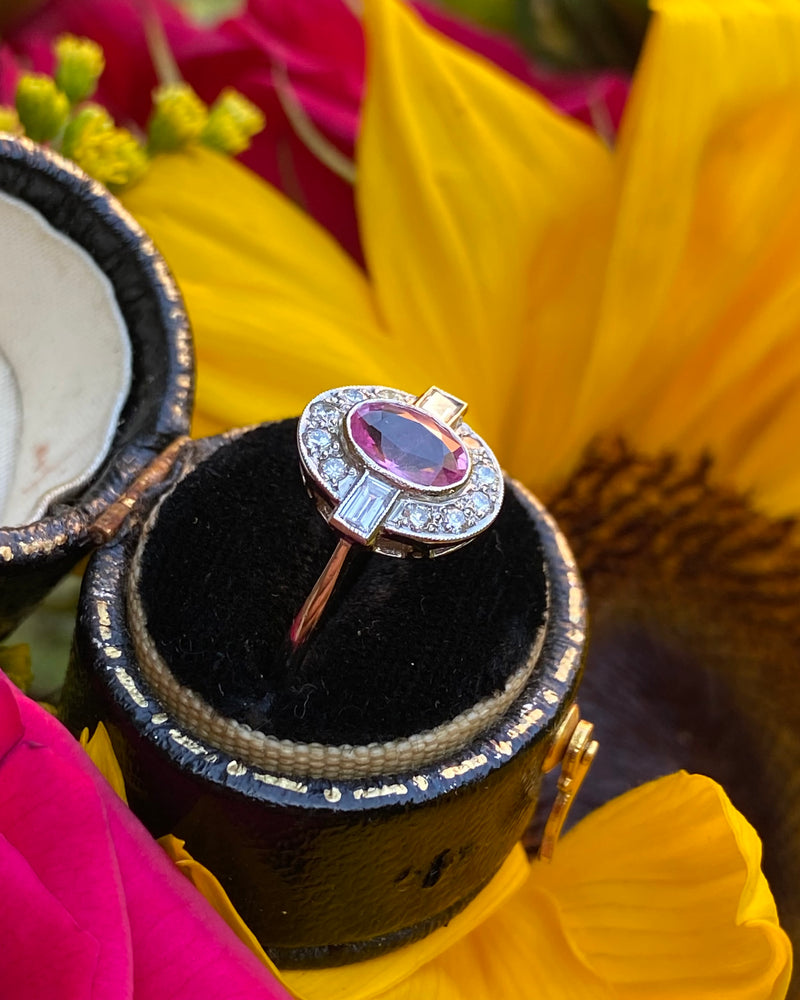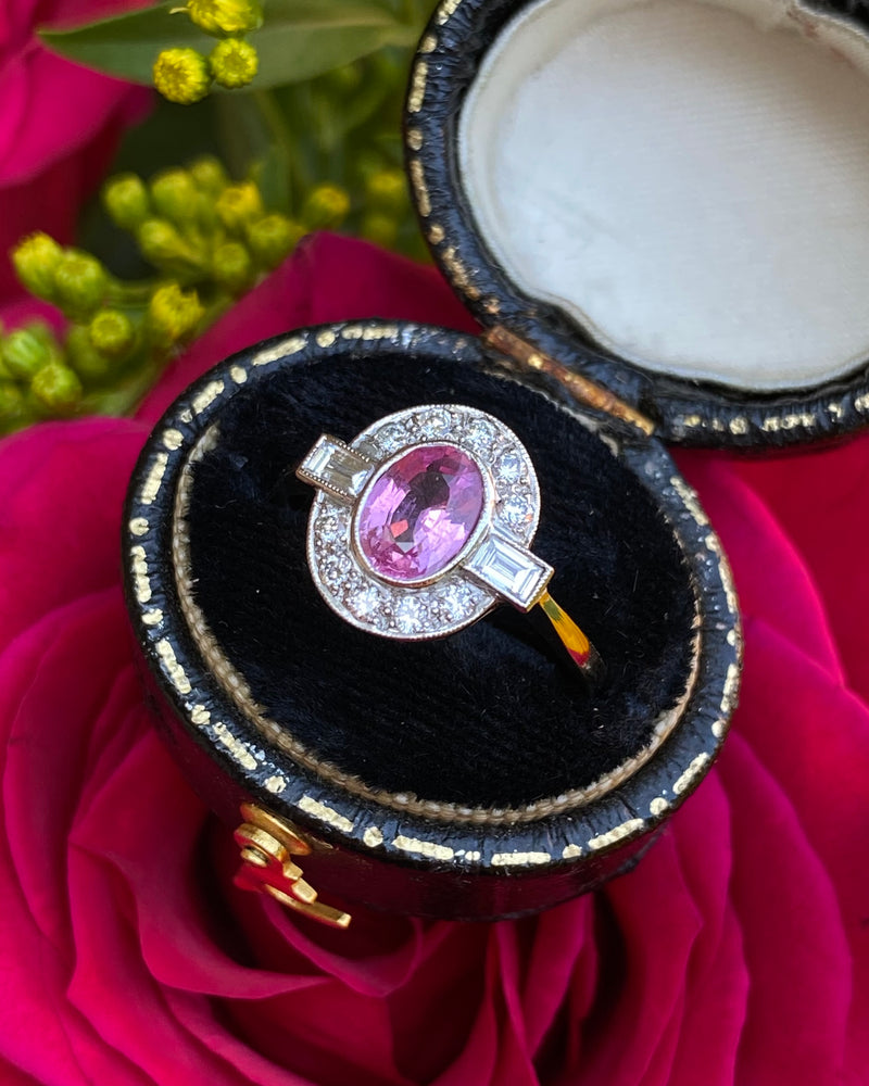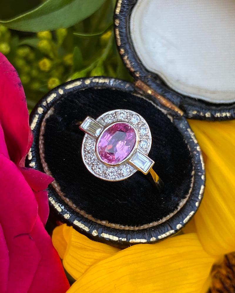 An eye catching, lovely Art Deco style Pink Sapphire and Diamond Cluster Platinum ring. The playful pink stone is unique and makes this piece exciting yet elegantly feminine. The ring is an Oval shape with sparkling Round Brilliant Cut Diamonds surrounding the Oval Cut Pink Sapphire. The 0.80ct Pink Sapphire measures 7mm x 5mm and is set in a Rubover setting. The surrounding Round Brilliant Cut Diamonds with two single Baguette Cut Diamonds set horizontally are a mixture of Rubover and Pave set, all finished with a fine Milgrain edging. The Diamonds weigh 0.40ct and are a bright H/I colour and VS/SI clarity.