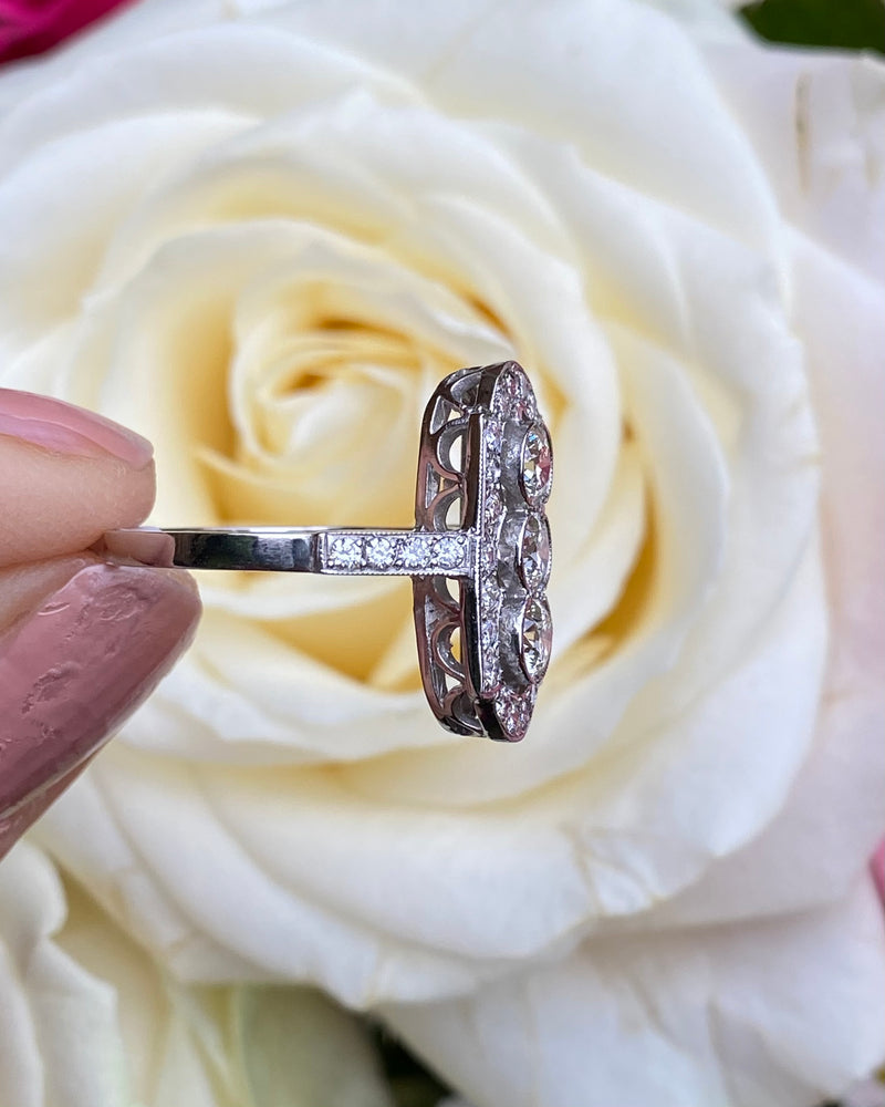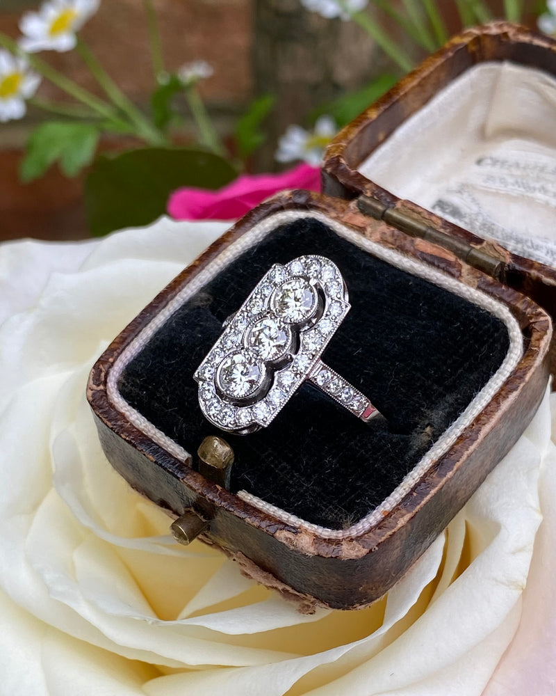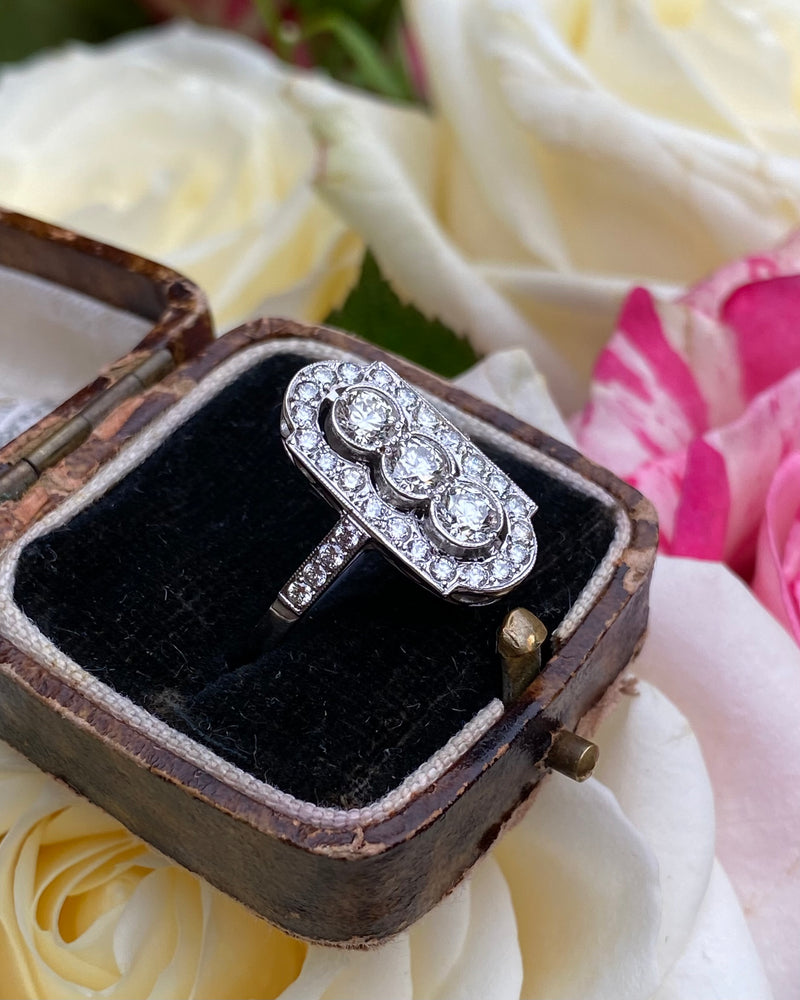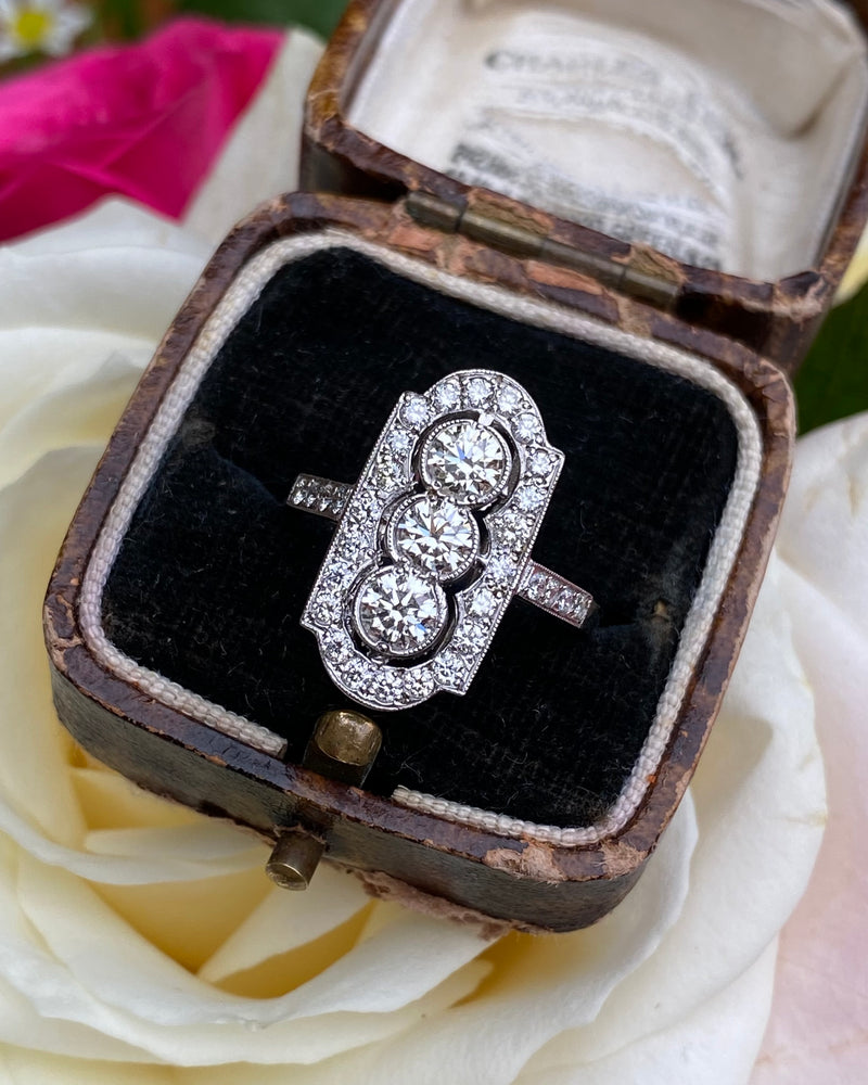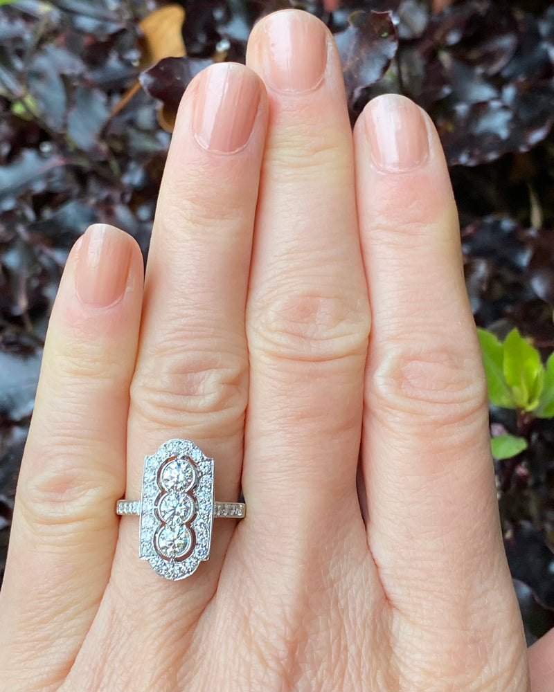 A lovely Art Deco style Diamond ring with three Round Brilliant Cut Diamonds set rubover style in a vertical row with fine milgrain edging and surrounded by numerous Pave set dazzling Diamonds with an additional four Pave set diamond set within the ring shank. The Diamonds are of a good quality approx 'H/I’ colour and VS/SI clarity, no marks apparent to the naked eye and they sparkle beautifully. The Diamond weighs approximately 1.35ct in total weight.. The ring is size 'O' and could easily be sized up or down. The ring is made entirely in platinum and is fully hallmarked. This would make the perfect addition to any jewellery lovers collection!