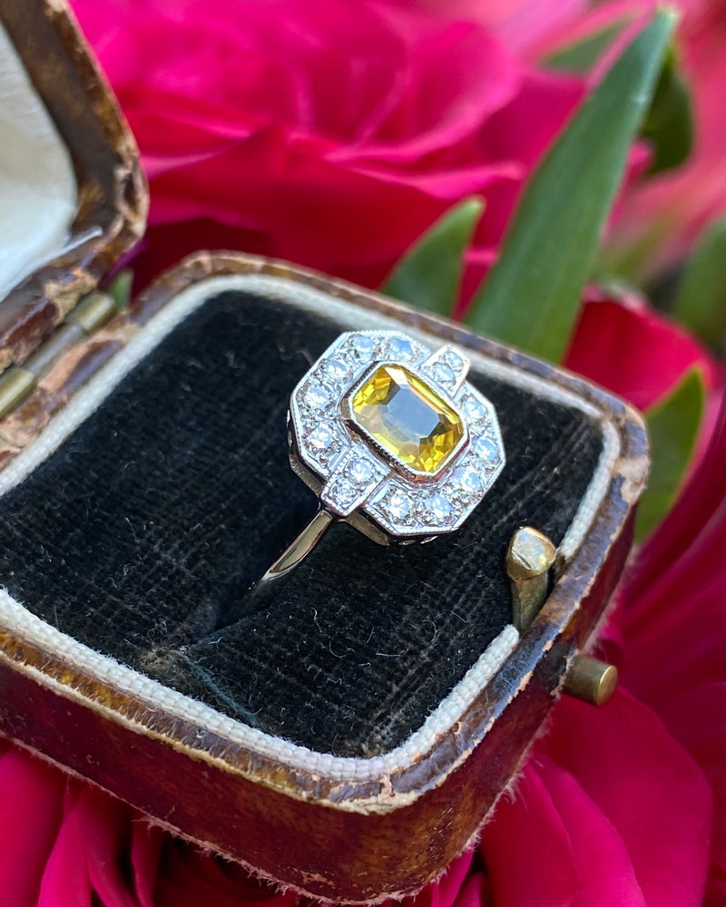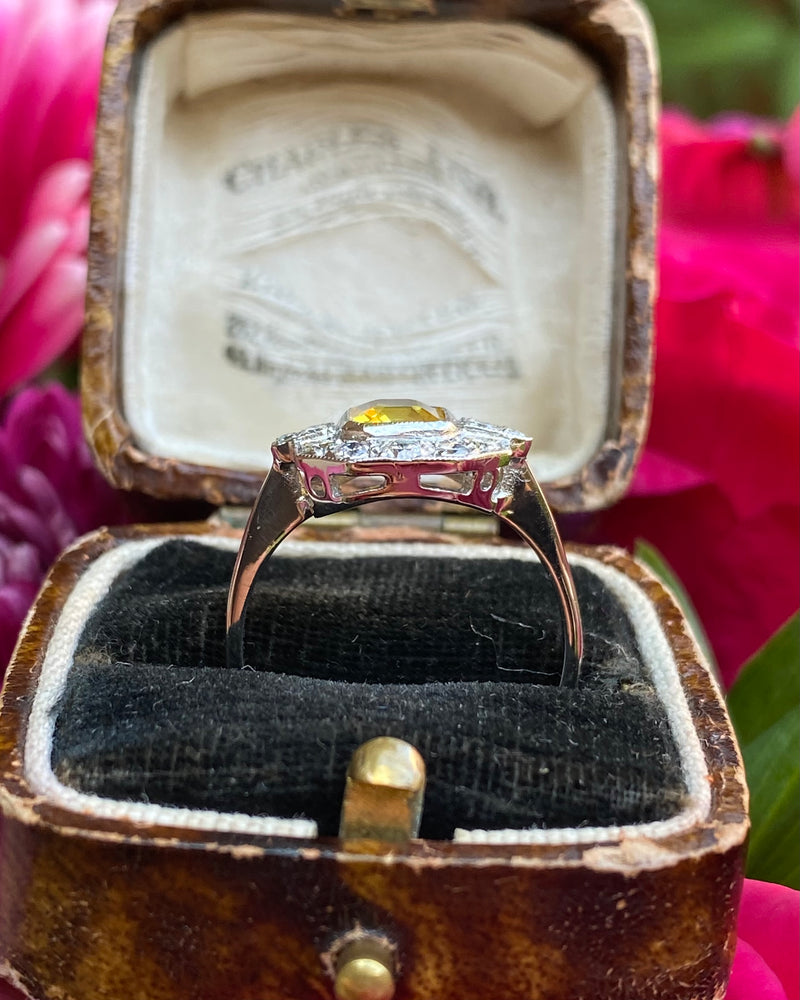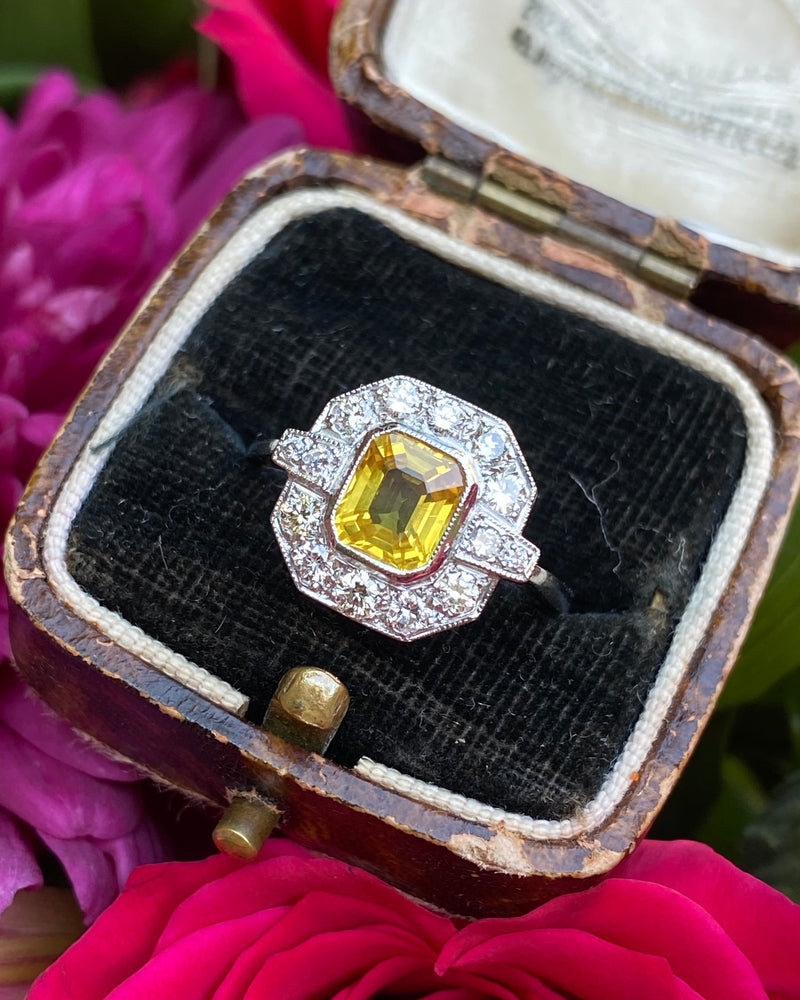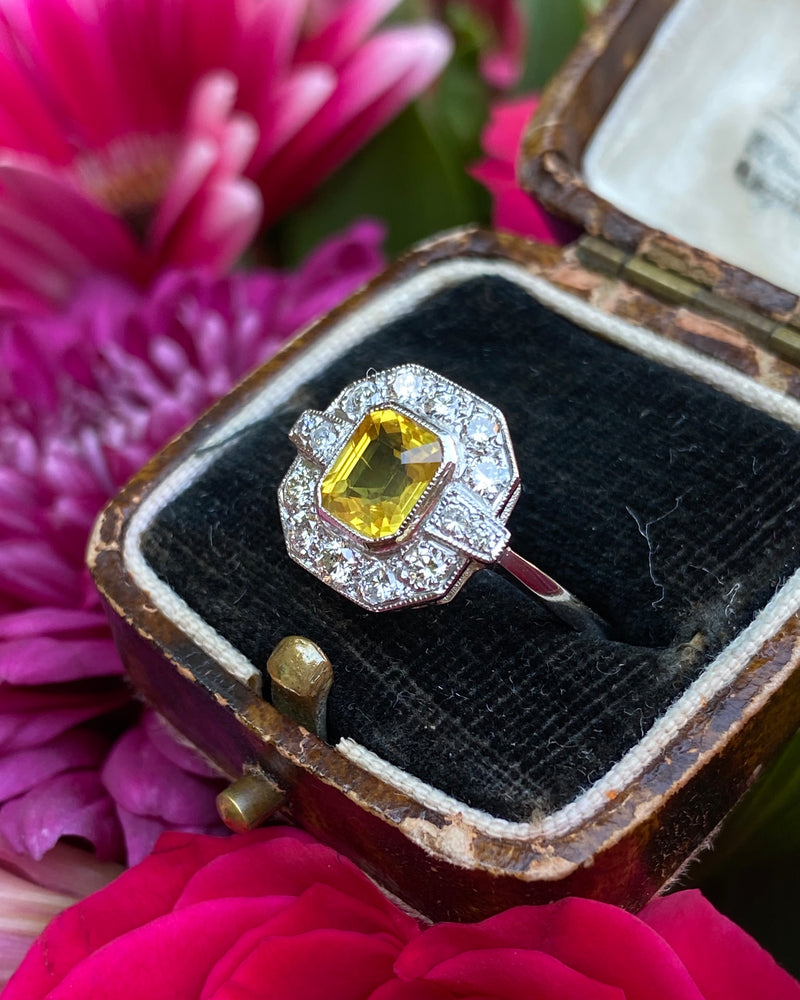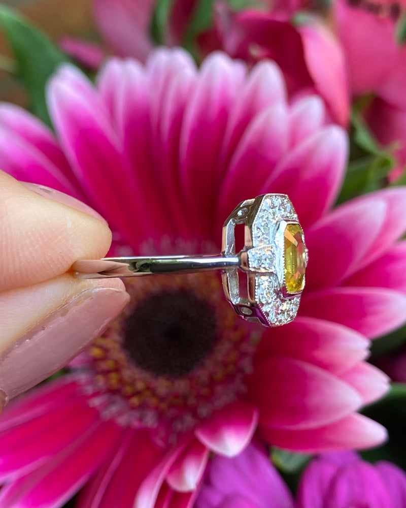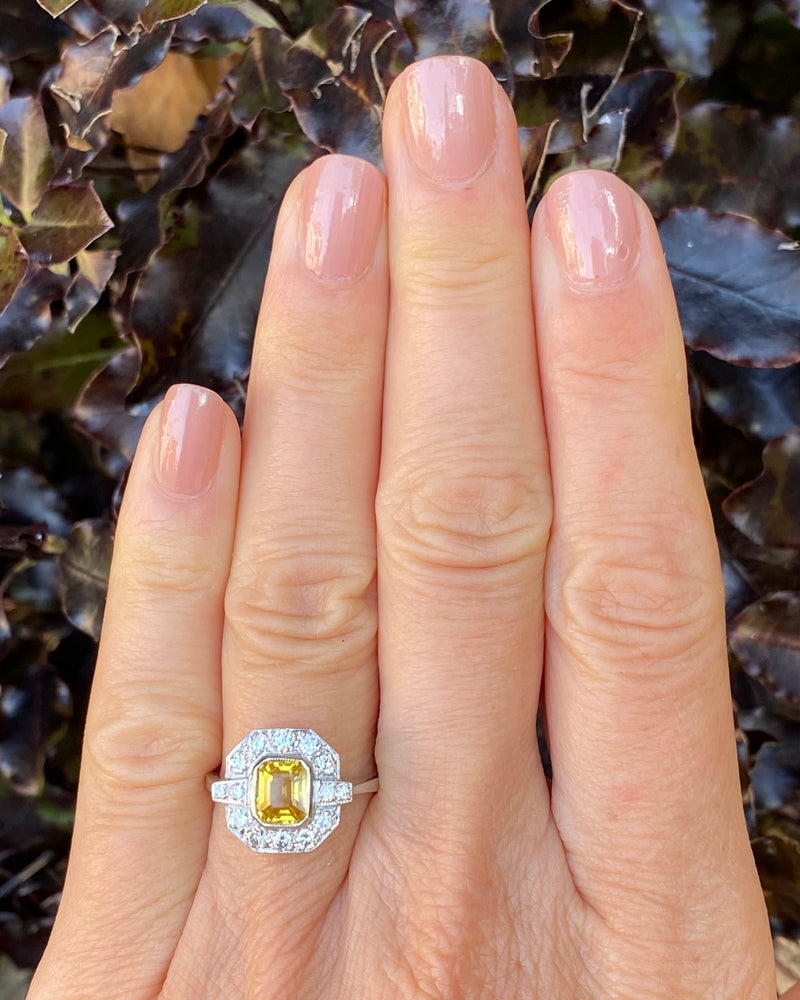 This Art Deco style Yellow Sapphire and Diamond ring is truly beautiful! Sunny and vibrant, guaranteed to brighten up your day. Set entirely in Platinum it looks great quality, it feels it too. The central Yellow Sapphire weighs 1.65ct, measures 7mm x 6mm and is a lovely Square Emerald Cut shape. It is a gorgeous sunshine yellow and is set in a rub over setting showing off the stone to full effect. The surrounding Brilliant Cut Diamonds are pave set in an octagonal surround and total at 0.55ct in Diamond weight. The Brilliant Cut Diamonds are bright and full of life, H/I colour, VS/SI clarity. The ring sits nice and low on the finger and is easy to wear. This is a lovely ring!