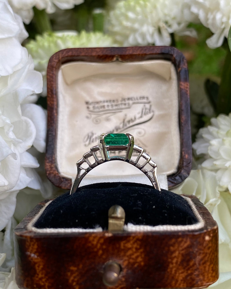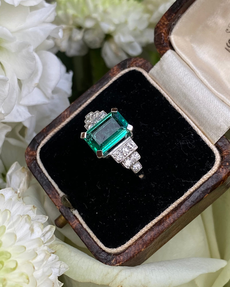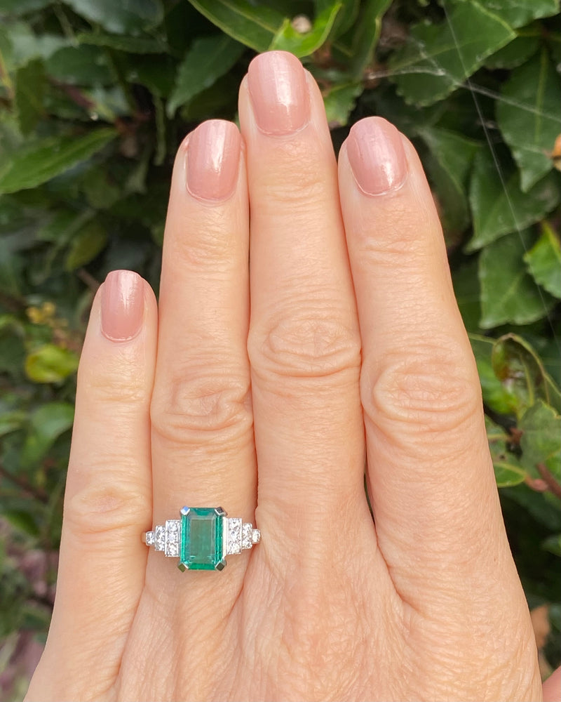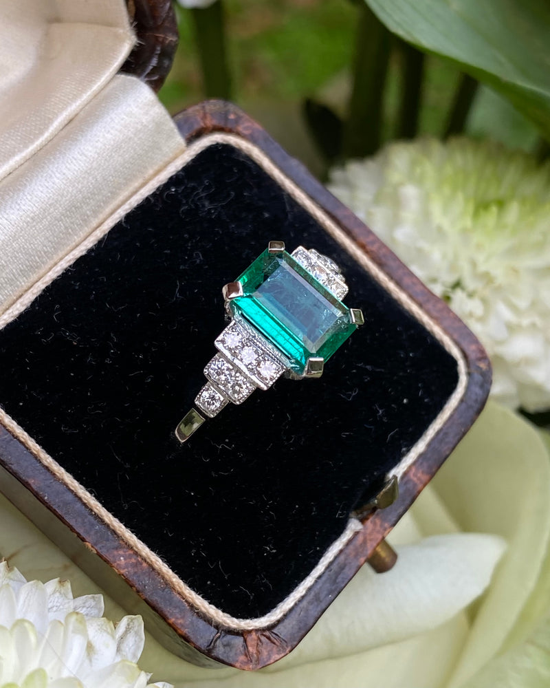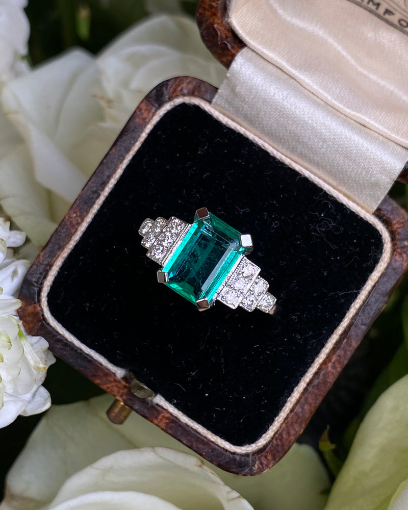Art Deco Emerald and Diamond Platinum Ring 0.25ct + 1.70ct