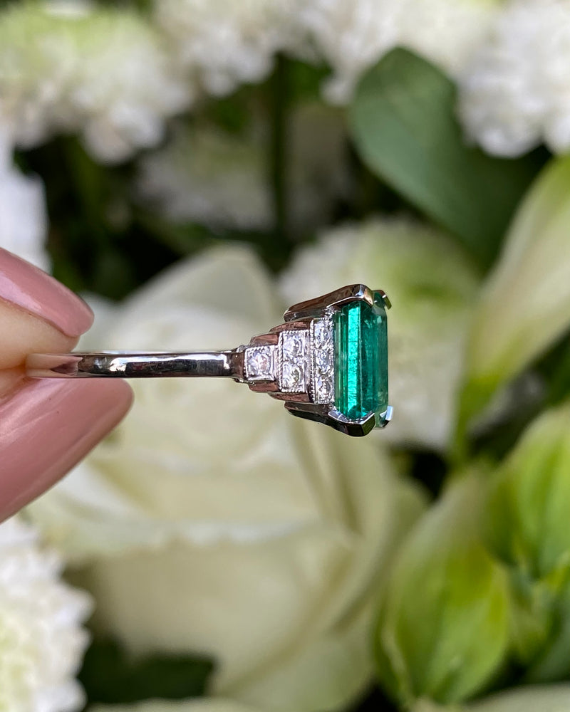 A lovely Art Deco style Emerald and Diamond ring with a fine quality Emerald Cut Emerald of a lovely rich verdant green colour with very good clarity. The Emerald weighs 1.70ct, is set with 4 claws and measures 9mm x 6mm. Set either side are three graduating rows of Brilliant Cut Diamonds stepping down the shoulders. The Diamonds are bright and sparkly, H/I colour and VS/SI clarity, and pave set with a fine milgrain edging, weighing 0.25ct in total.