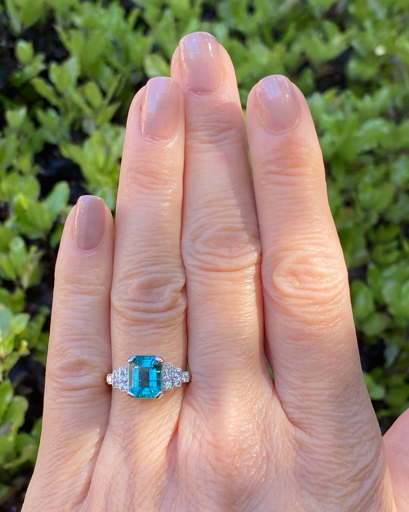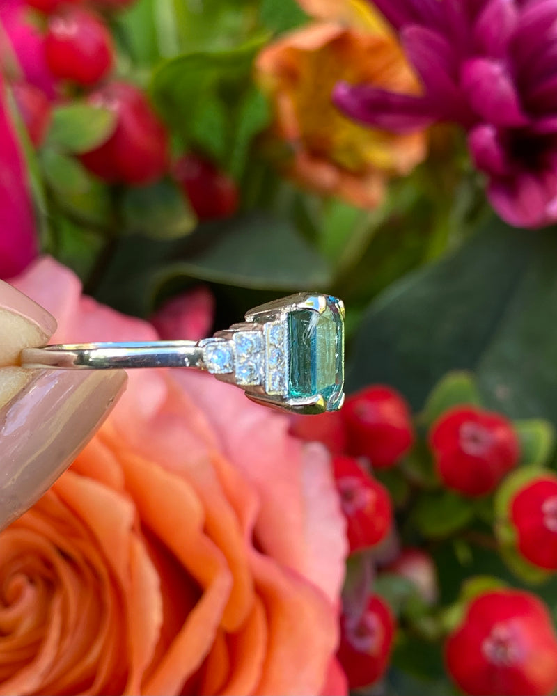 A lovely Art Deco style Emerald and Diamond ring with a fine quality Emerald Cut Emerald of a lovely blueish green colour with very good clarity. The Emerald weighs 2.50ct, is set with 4 claws and measures 9mm x 7mm. Set either side are three graduating rows of Brilliant Cut Diamonds stepping down the shoulders. The Diamonds are bright and sparkly, H/I colour and VS/SI clarity, and pave set with a fine milgrain edging, weighing 0.25ct in total.