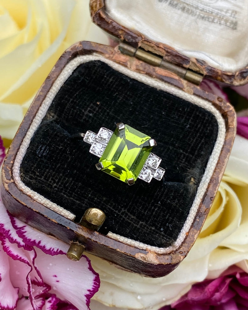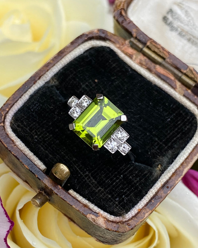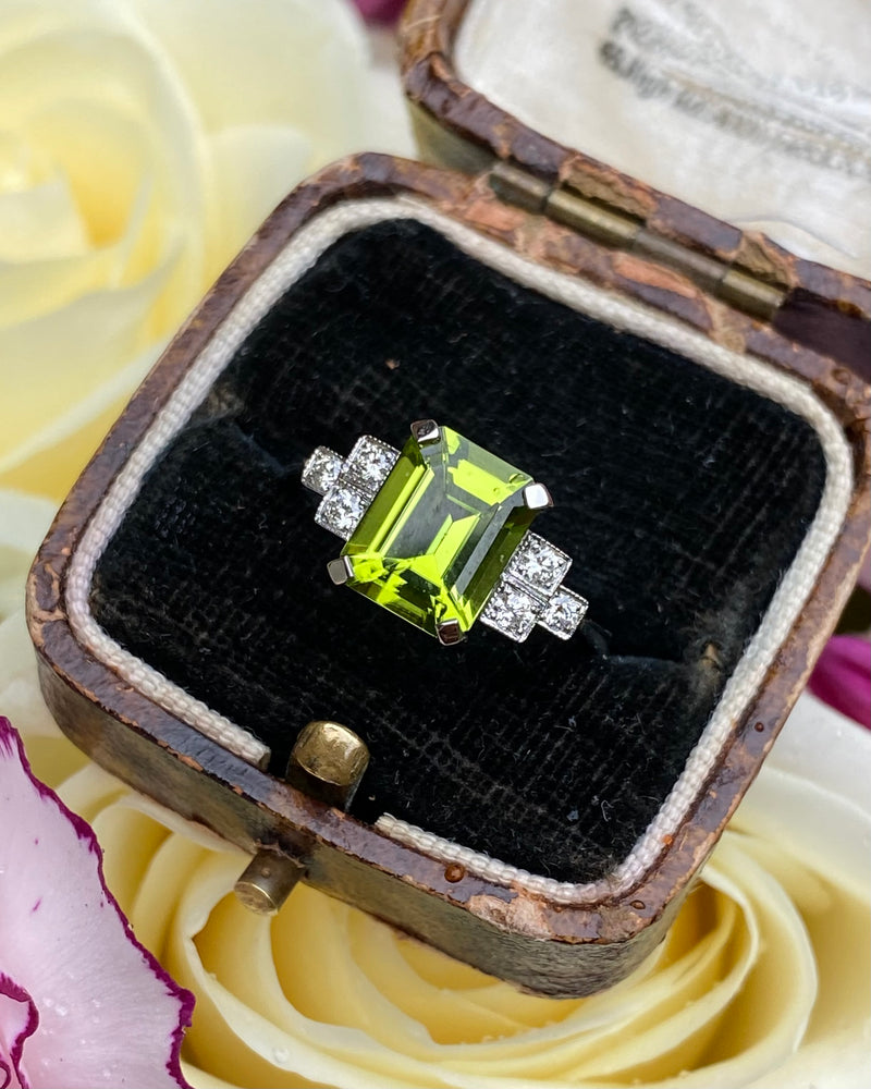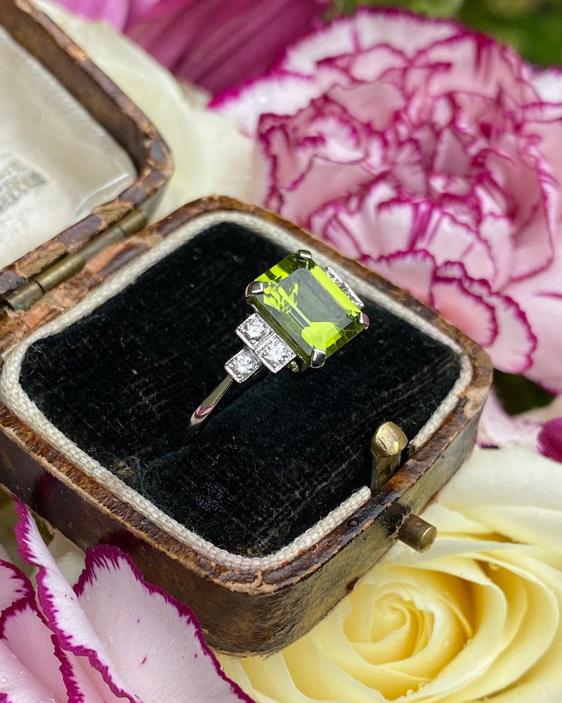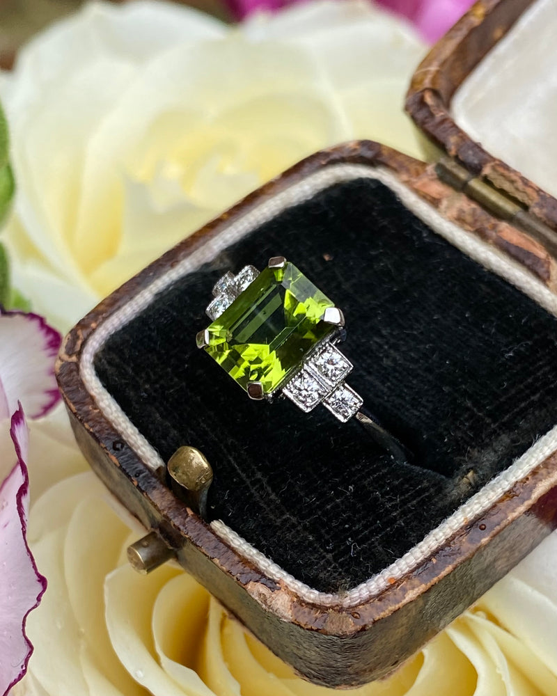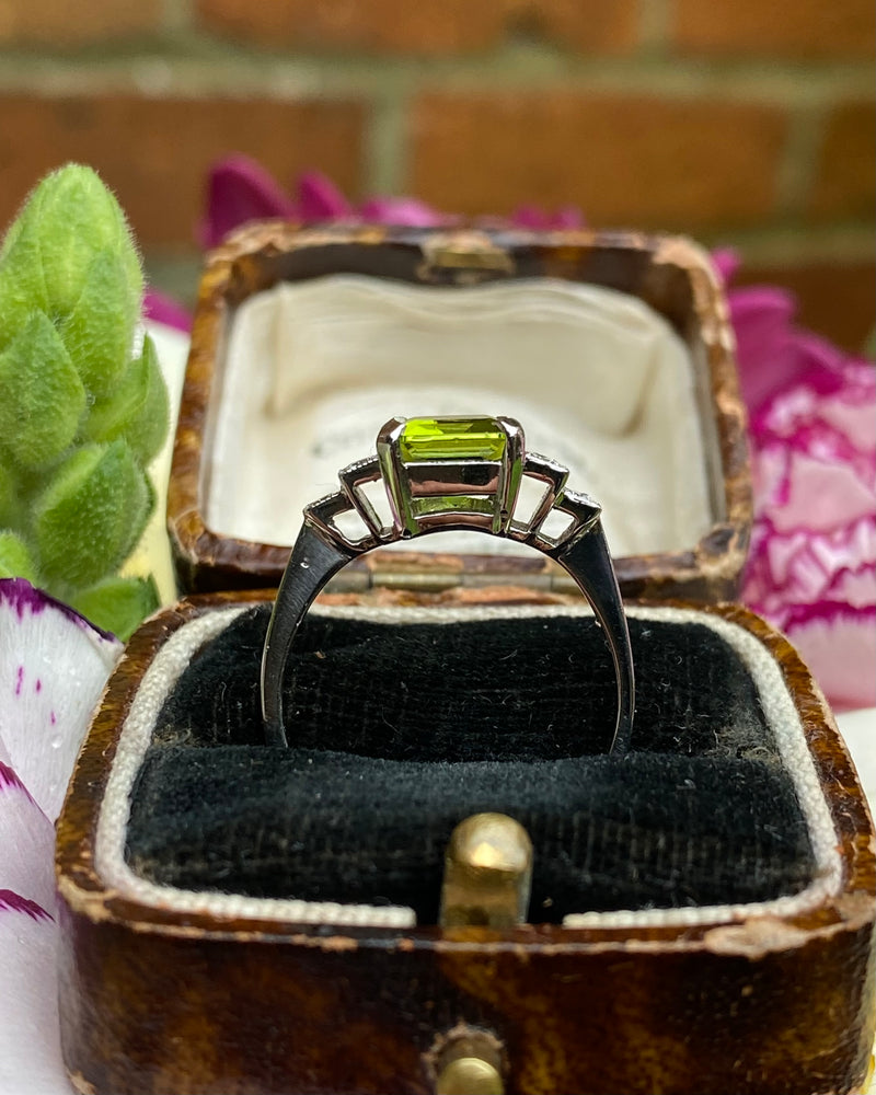 Art Deco Peridot and Diamond Platinum Ring 0.18ct + 2.20ct